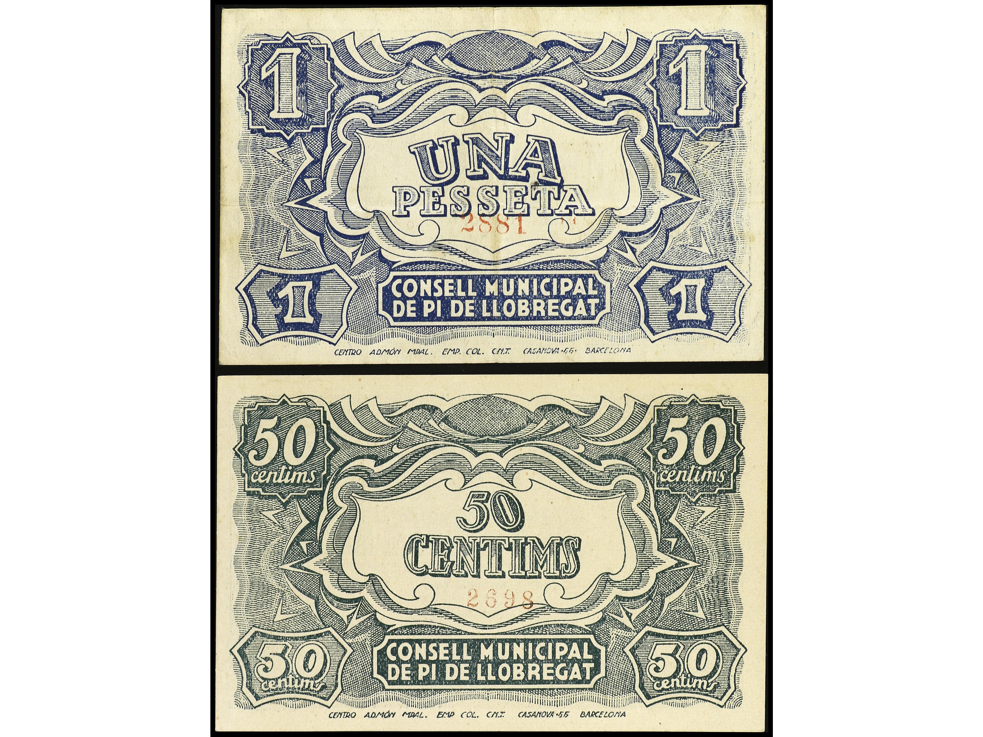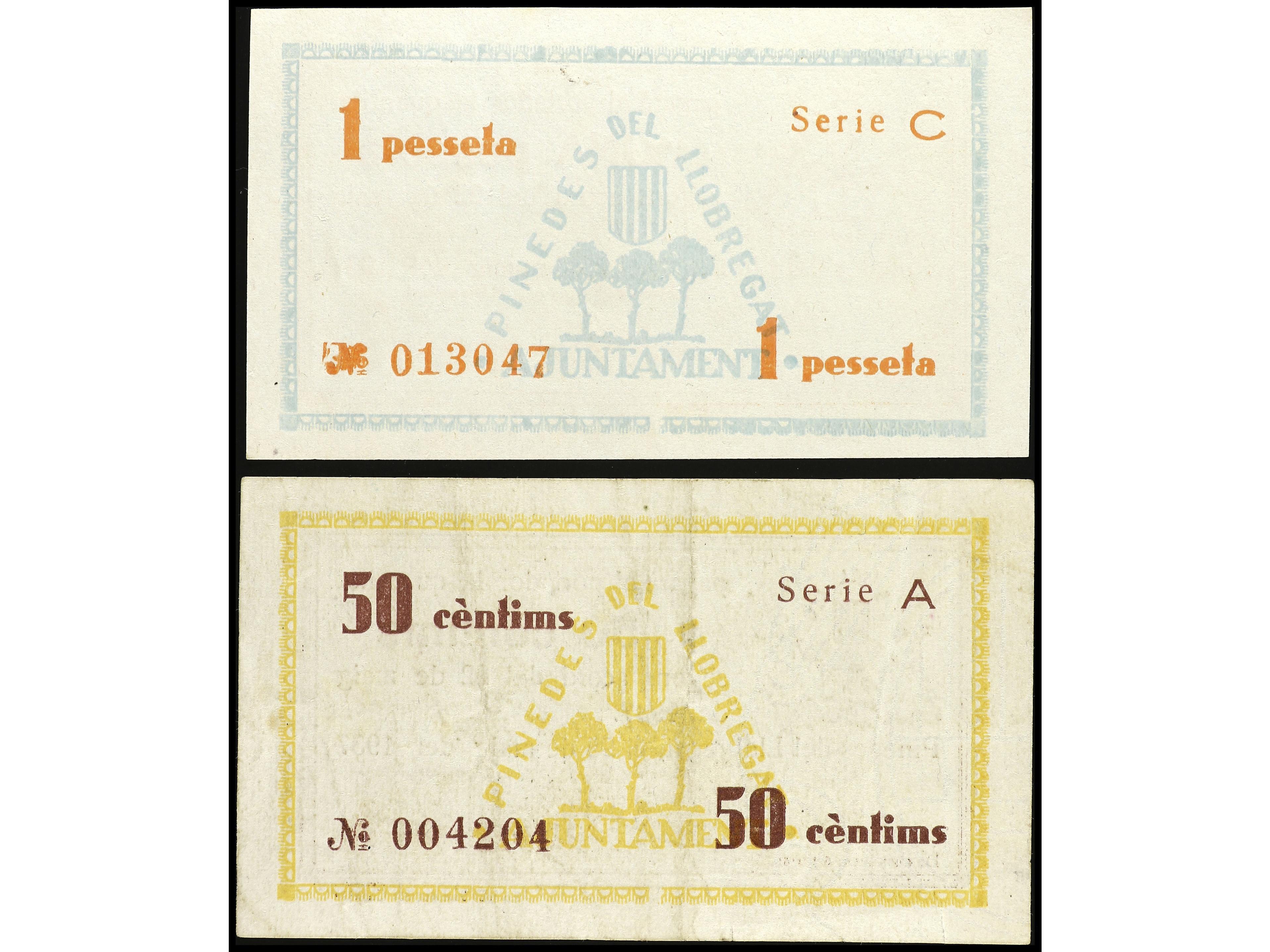 Lote 2 billetes 50 Cèntims y 1 Pesseta. 19 Abril 1937. C.M. de PI DE LLOBREGAT. AT-1817/18. MBC+ y EBC-. (Image1) (Image2)