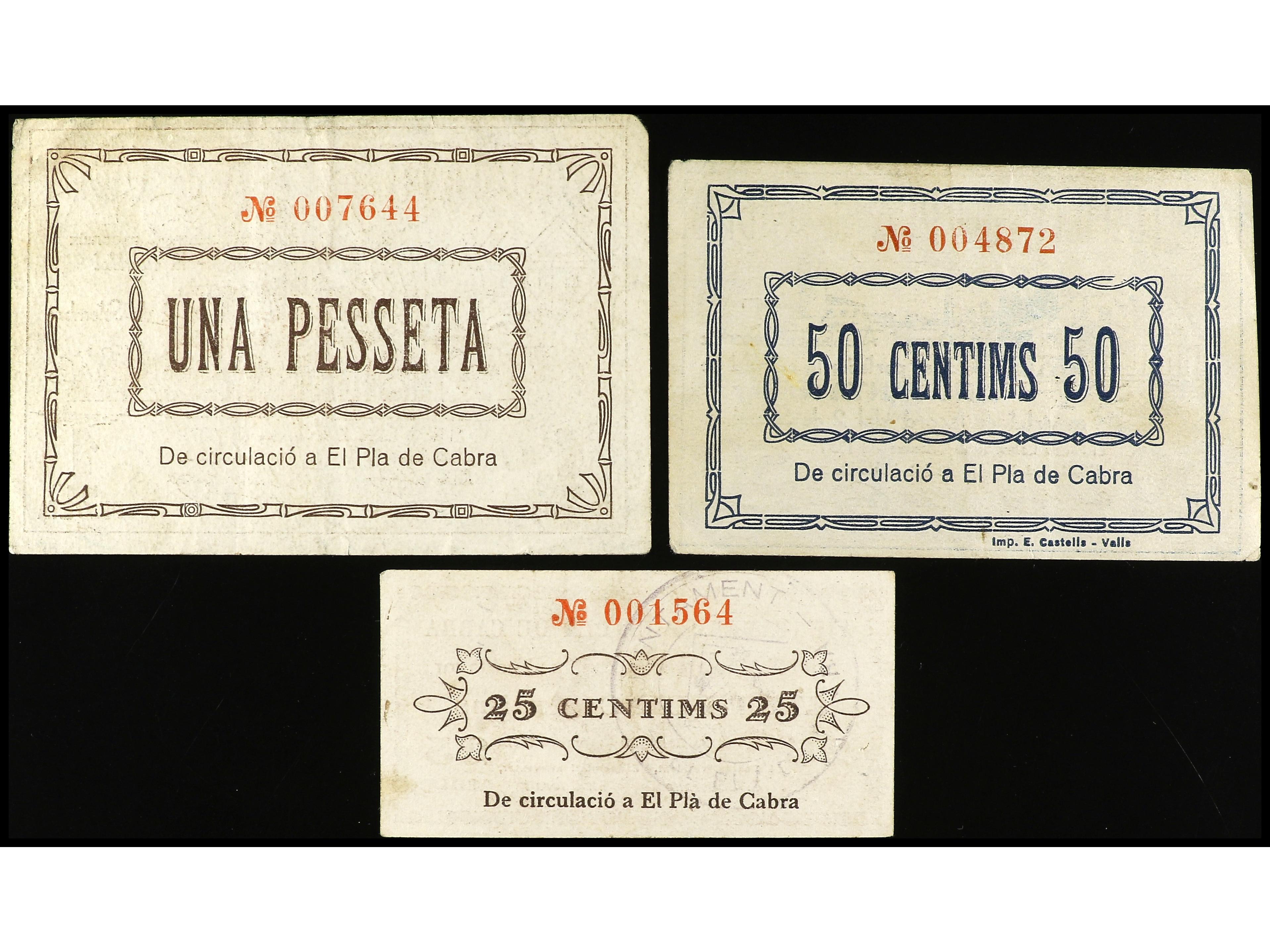 Lote 3 billetes 25, y 50 Cèntims y 1 Pesseta. Setembre 1937. Aj. d´EL PLA DE CABRA. AT-1847, 1848, 1849. MBC a MBC+.
