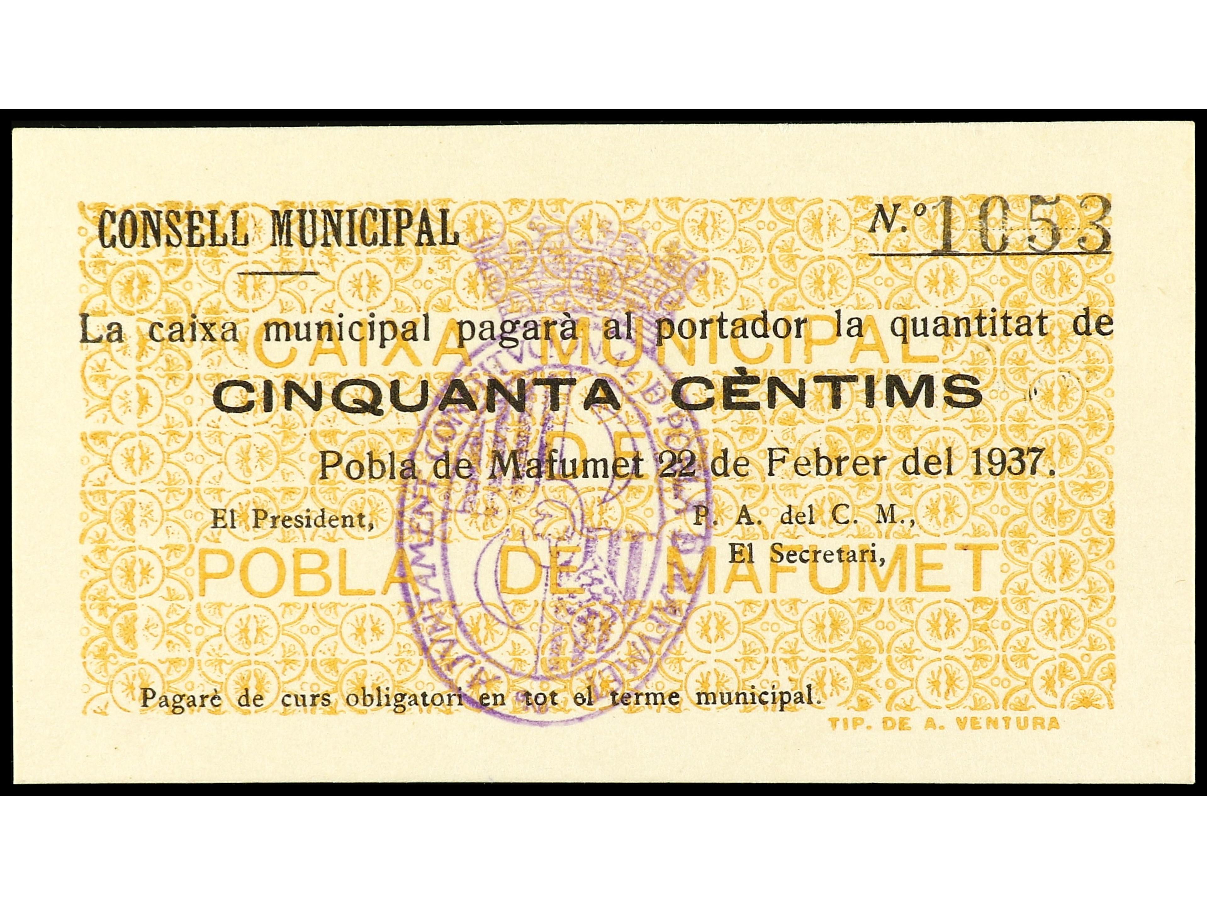 50 Cèntims. 22 Febrer 1937. C.M. de POBLA DE MAFUMET. RARO. AT-1907. EBC. (Image1) (Image2)