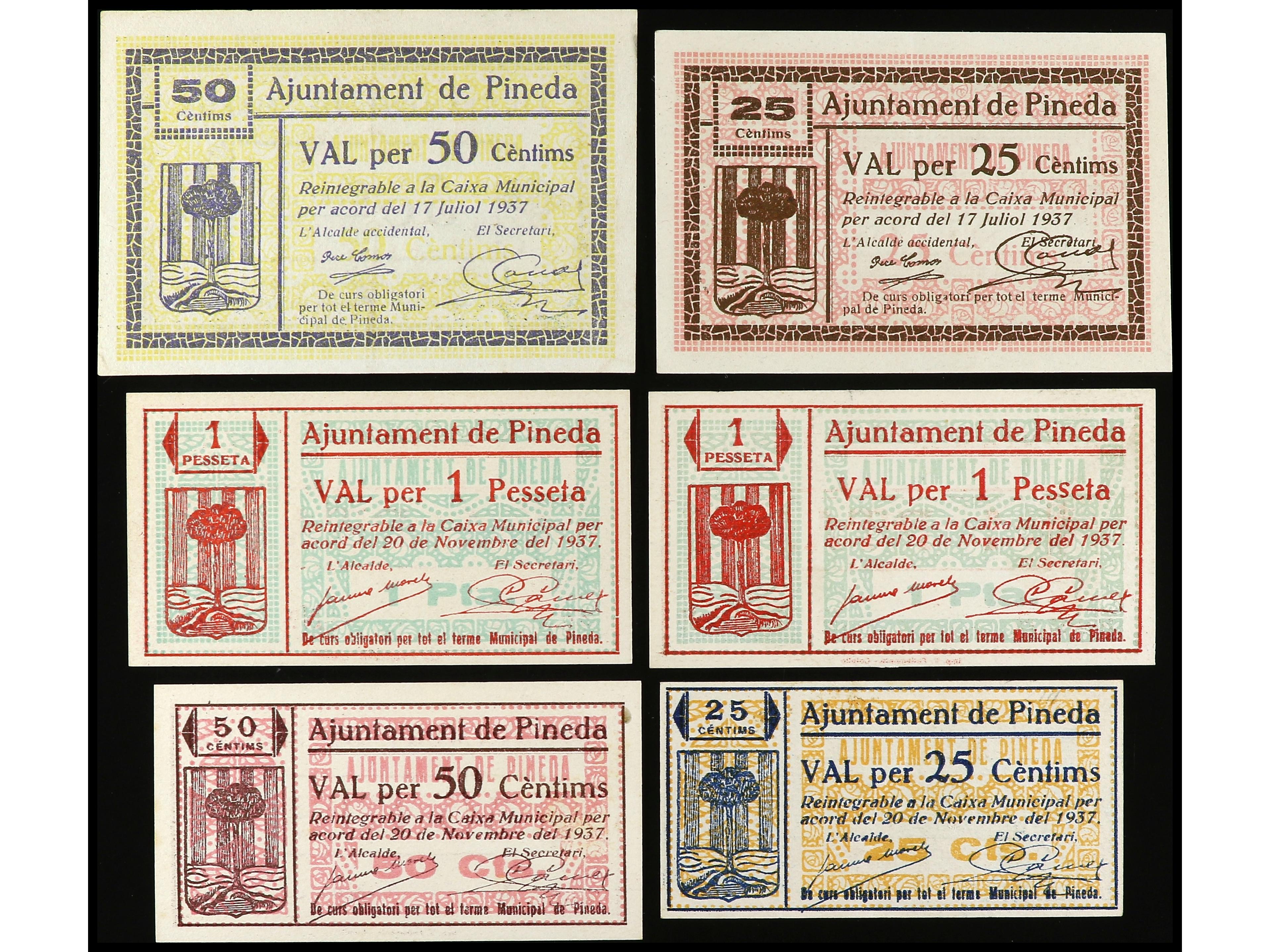 Lote 6 billetes 25 (2) y 50 Cèntims (2) y 1 Pesseta (2). Juliol y Novembre 1937. Aj. de PINEDA. AT-1822/23, 1824/26. EBC- a EBC+.