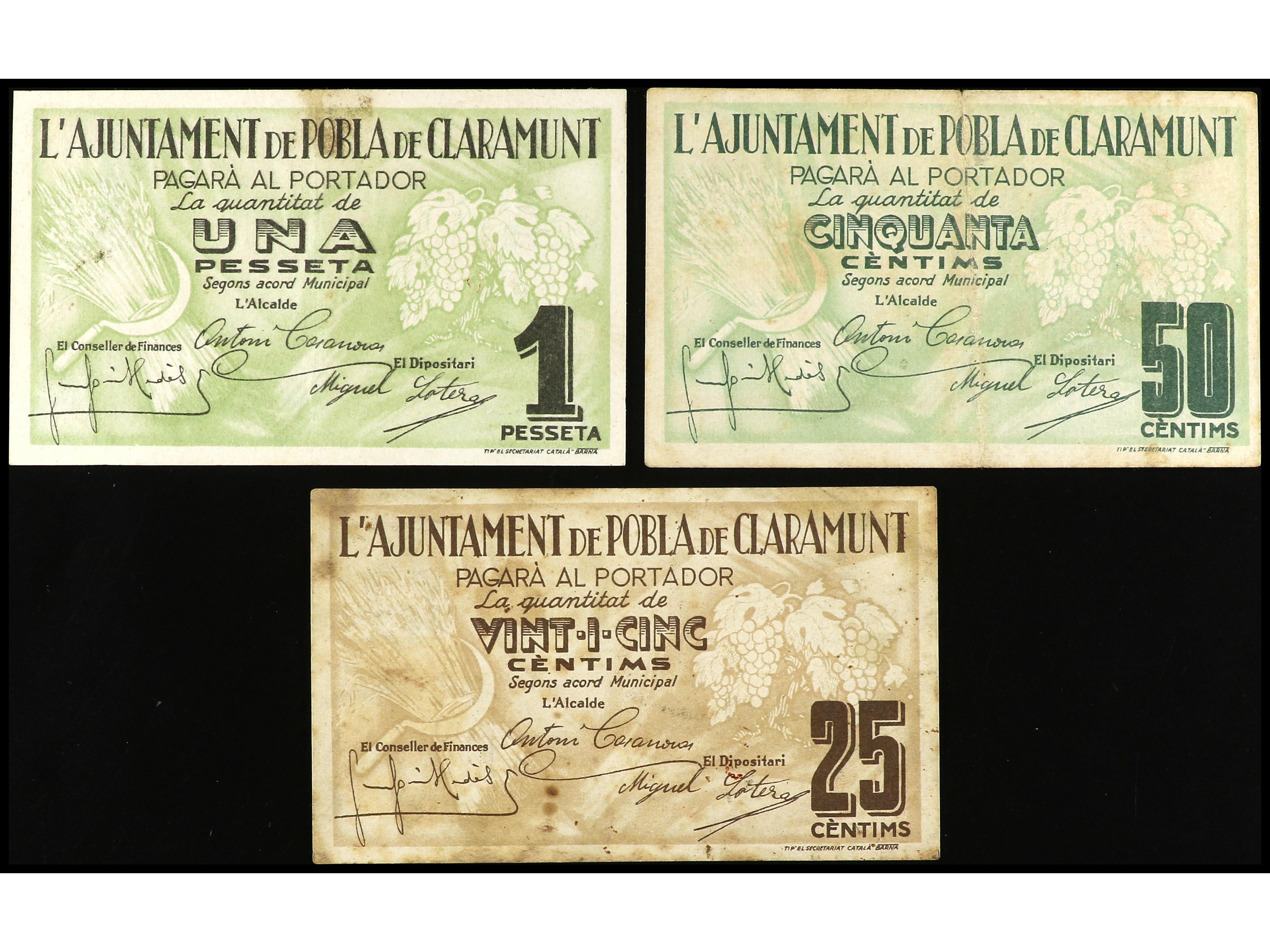 Lote 3 billetes 25, 50 Cèntims y 1 Pesseta. Aj. de POBLA DE CLARAMUNT. AT-1896/1898. MBC a MBC+. (Image1) (Image2)