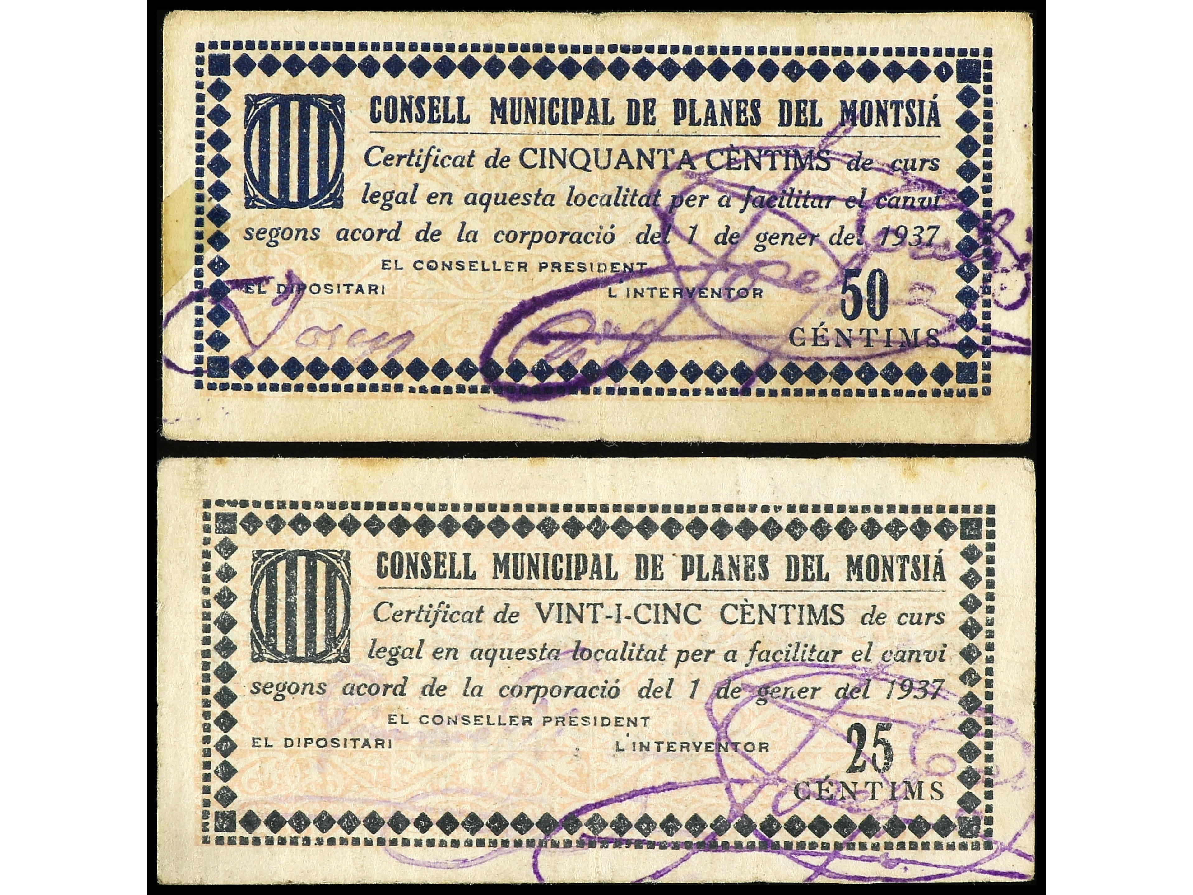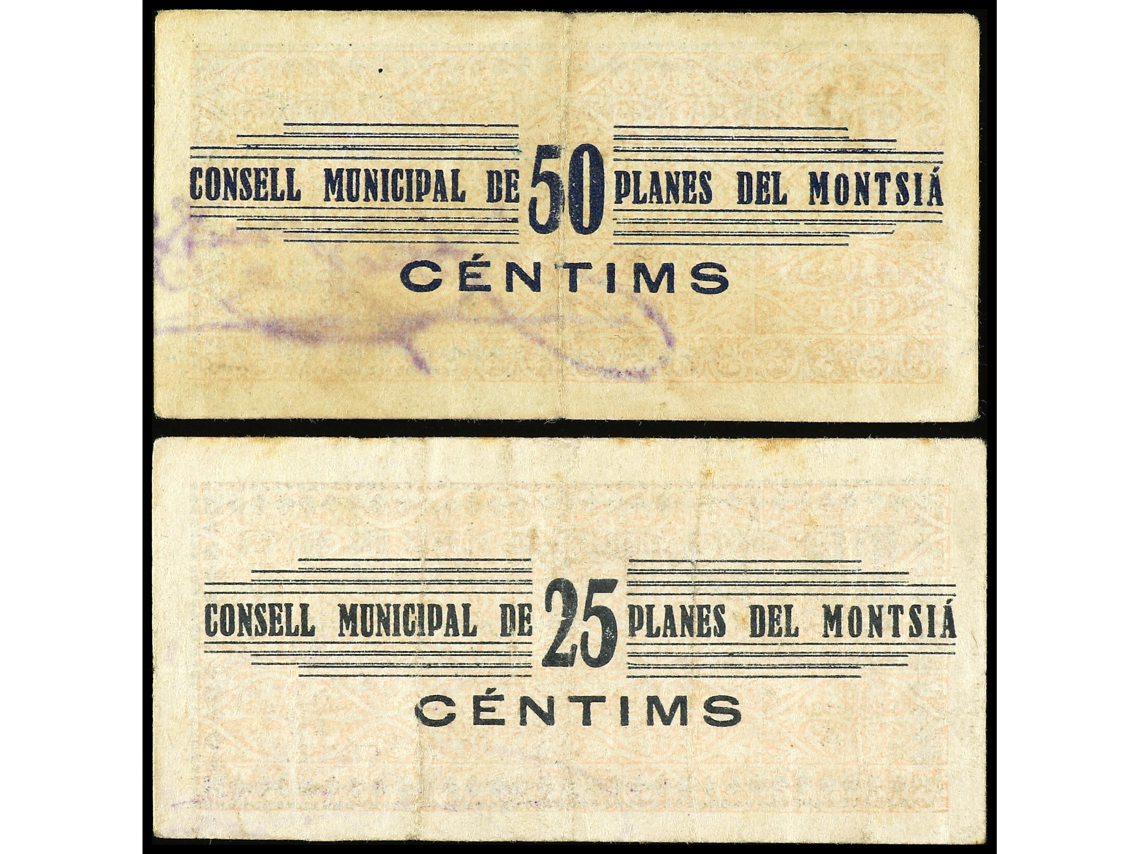 Lote 2 billetes 25 y 50 Cèntims. 1 Gener 1937. C.M. de PLANES DE MONTSIÀ. (Algo sucios). MBC+. (Image1) (Image2)