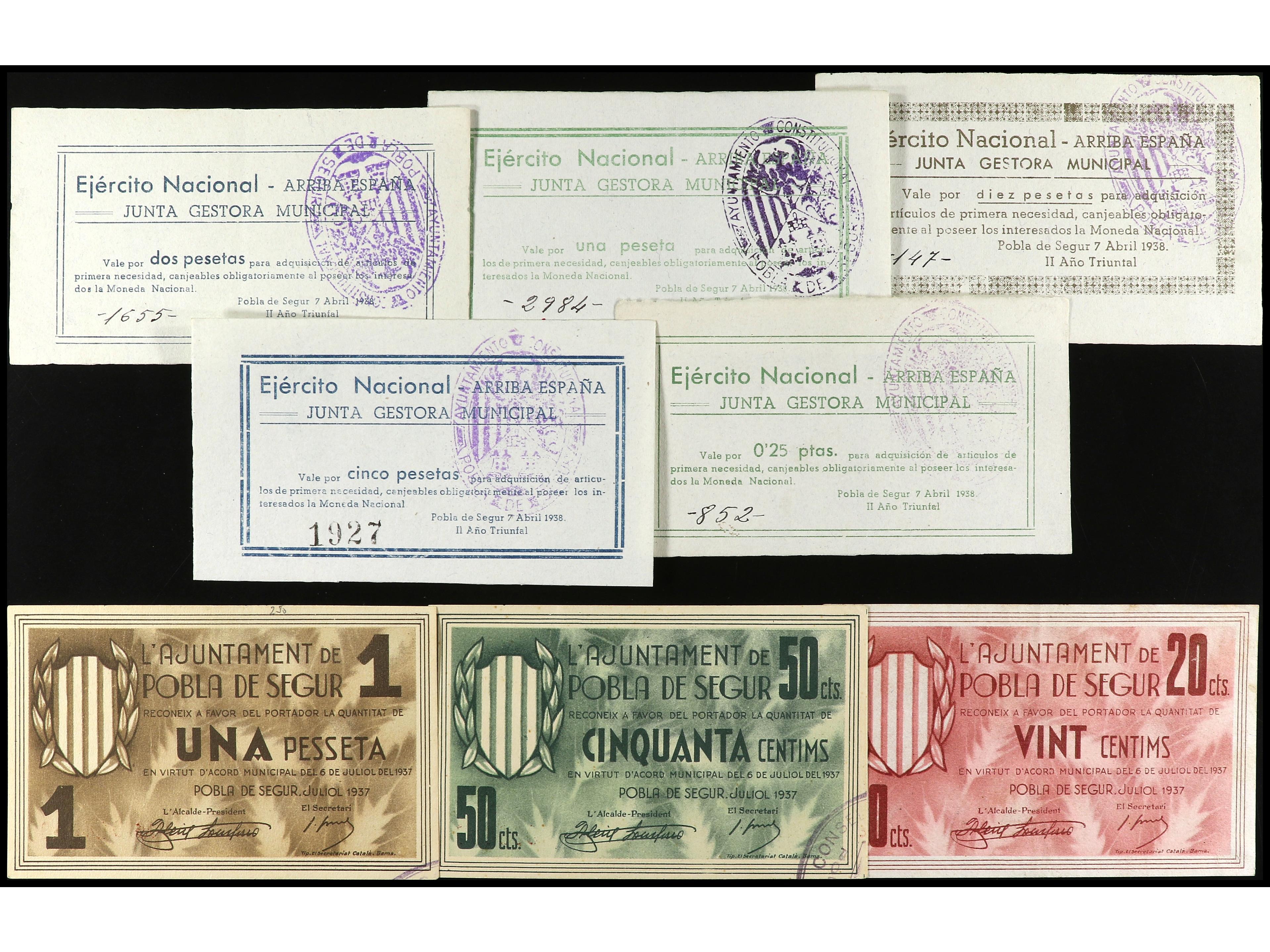 Lote 8 billetes 20 Cèntims a 10 Pesetas. Aj. y Junta Gestora Municipal de POBLA DE SEGUR. Todos diferentes. A EXAMINAR. MBC+ a EBC.