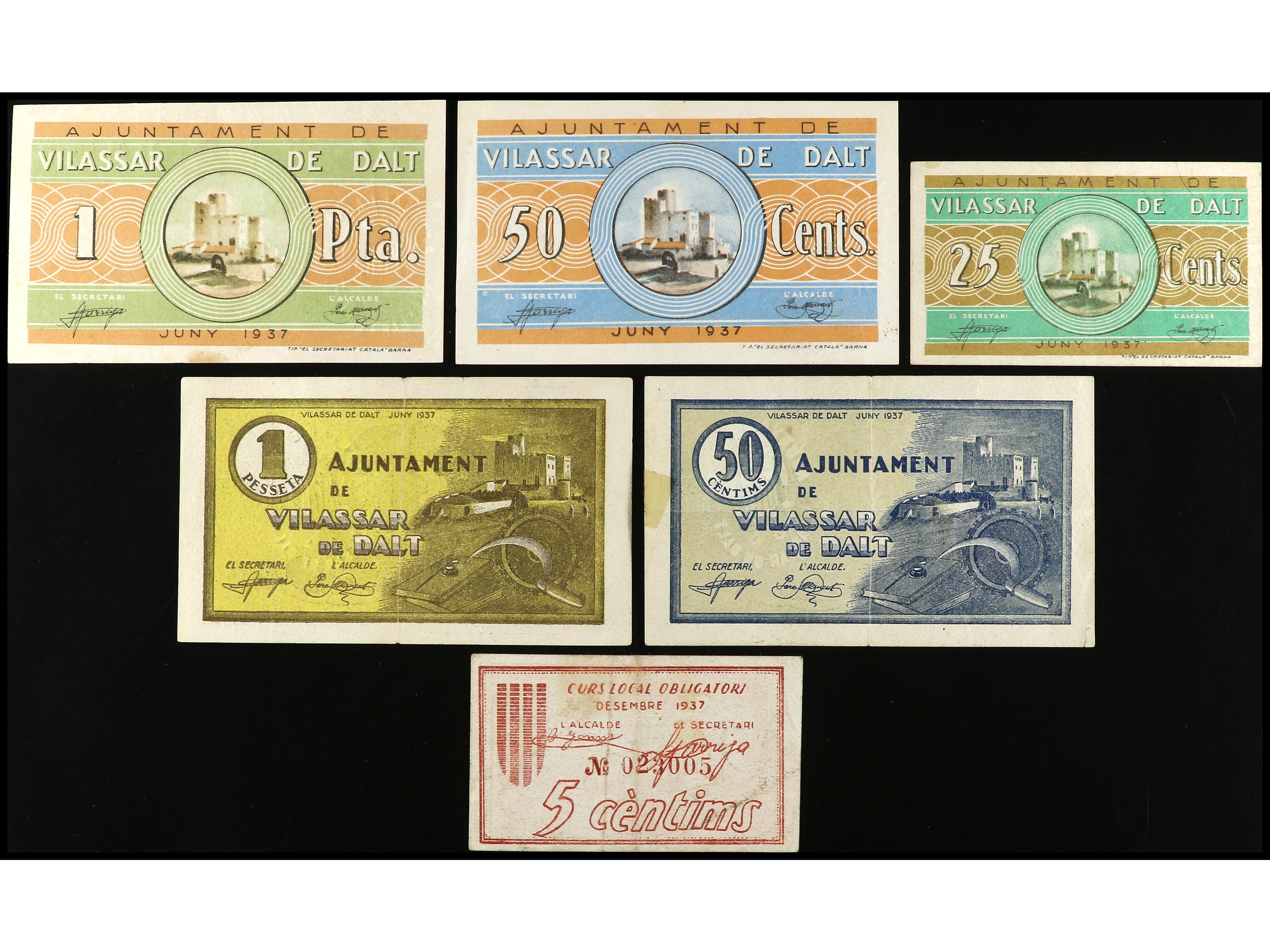Lote 6 billetes 5, 25 y 50 Cèntims (2) y 1 Pesseta (2). Juny 1937. Aj. de VILASSAR DE DALT. AT-2881/86. MBC a EBC.