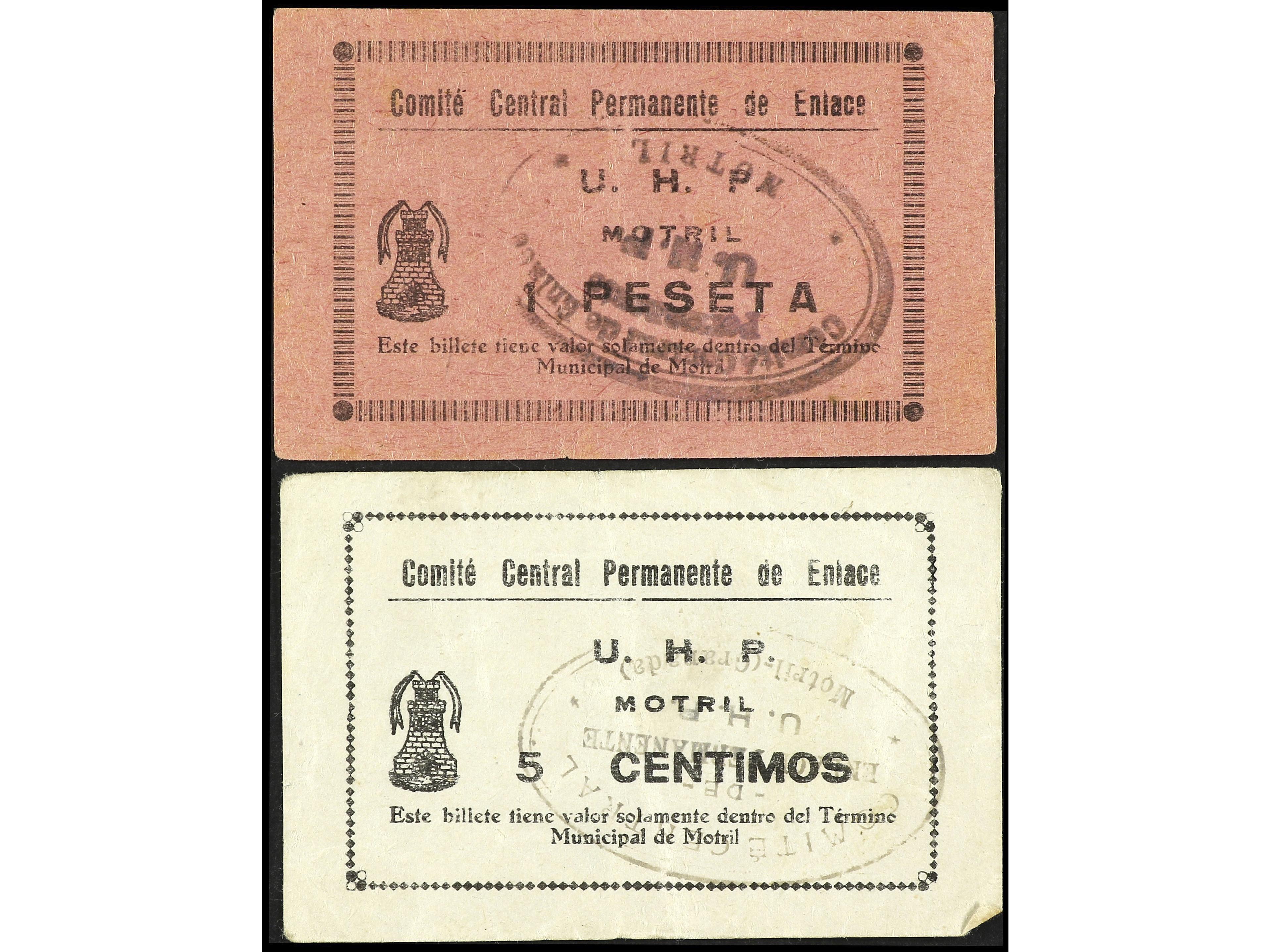 Lote 2 billetes 5 Céntimos y 1 Peseta. COMITÉ CENTRAL PERMANENTE DE ENLACE. U.H.P. MOTRIL (Granada). RGH-3744, 3746. MBC+ a EBC.