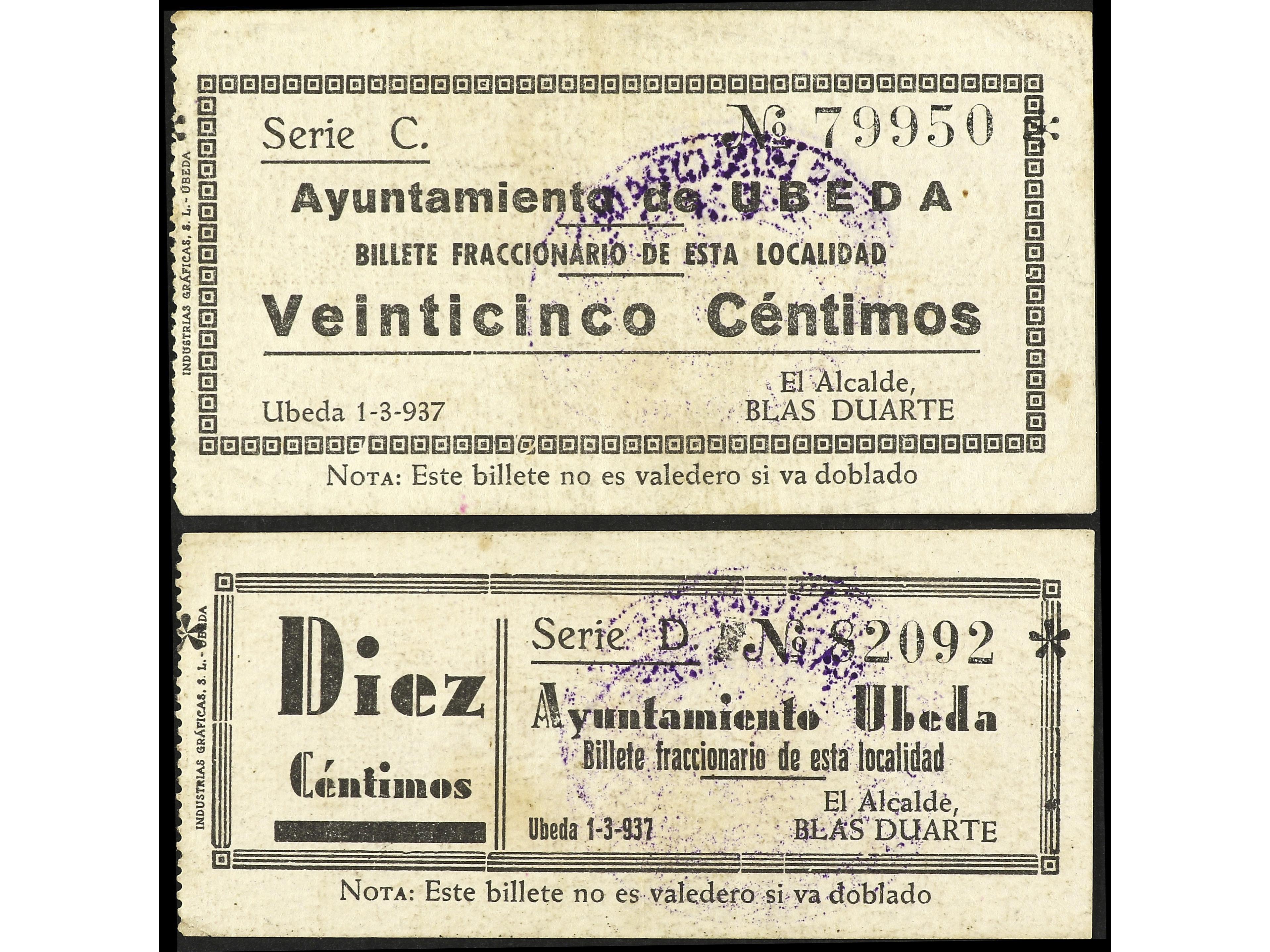 Lote 2 billetes 10 y 25 Céntimos. 1 Marzo 1937. Ay. de ÚBEDA (Jaén). RGH-5197, 5198. MBC+. (Image1) (Image2)