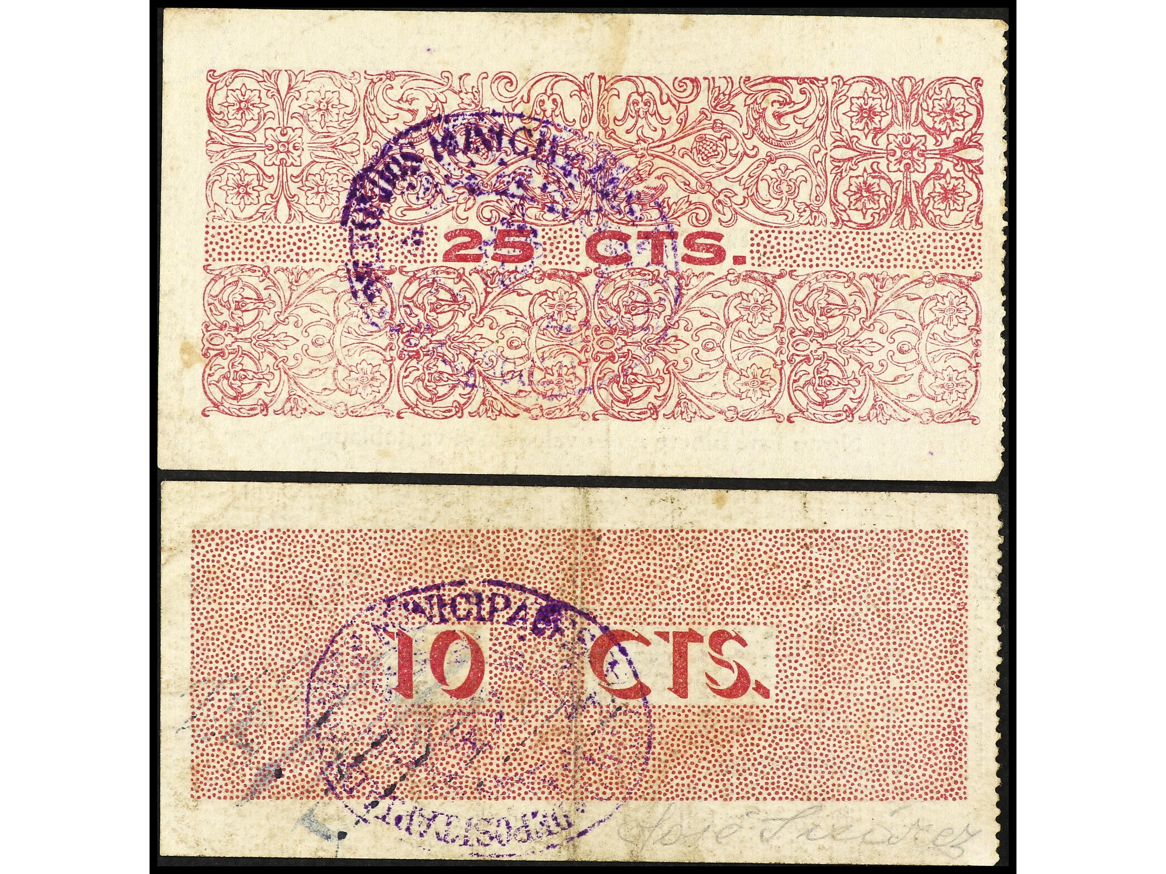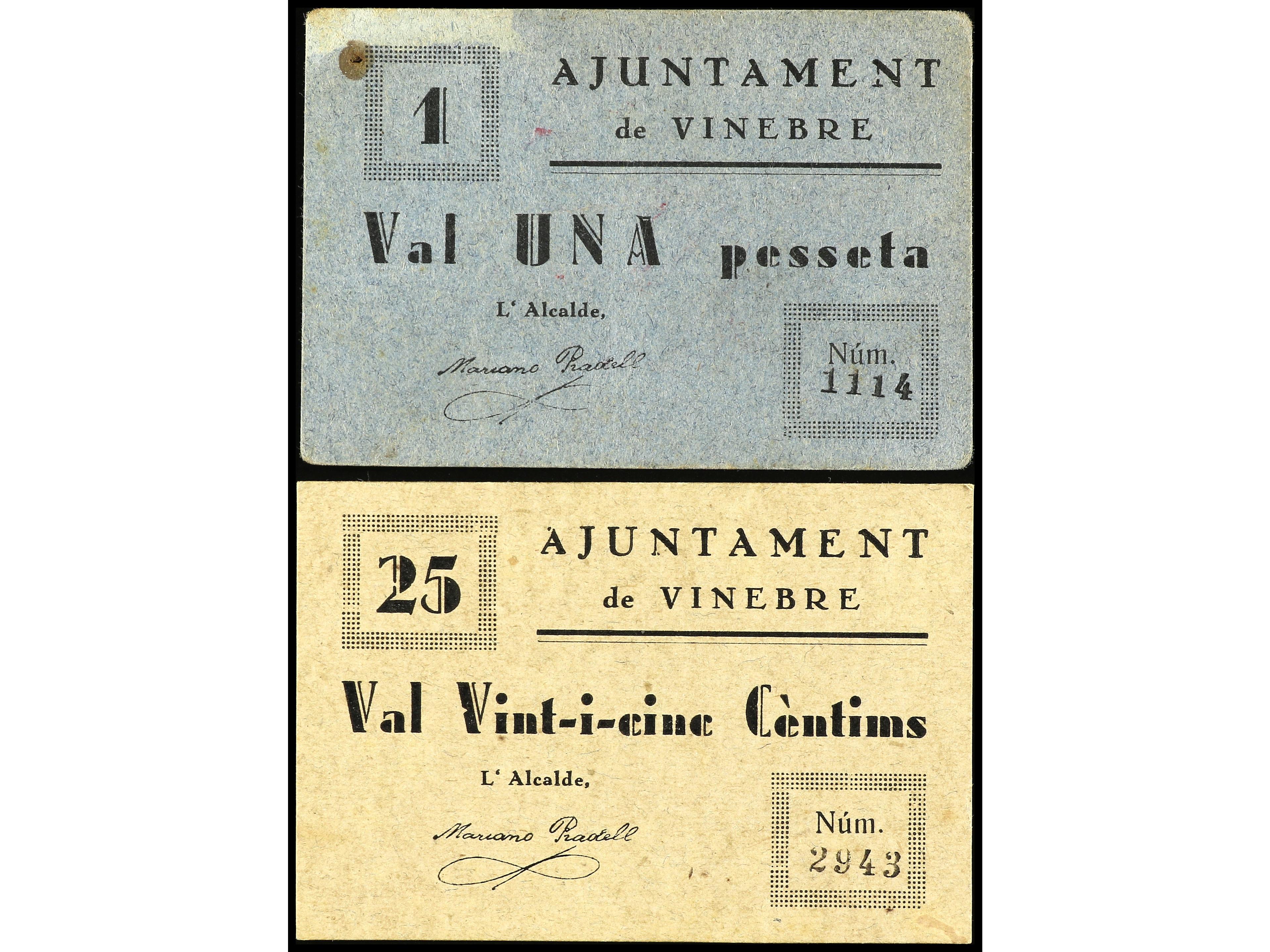 Lote 2 billetes 25 Cèntims y 1 Pesseta. Aj. de VINEBRE. AT-2912, 2913. MBC+. (Image1) (Image2)