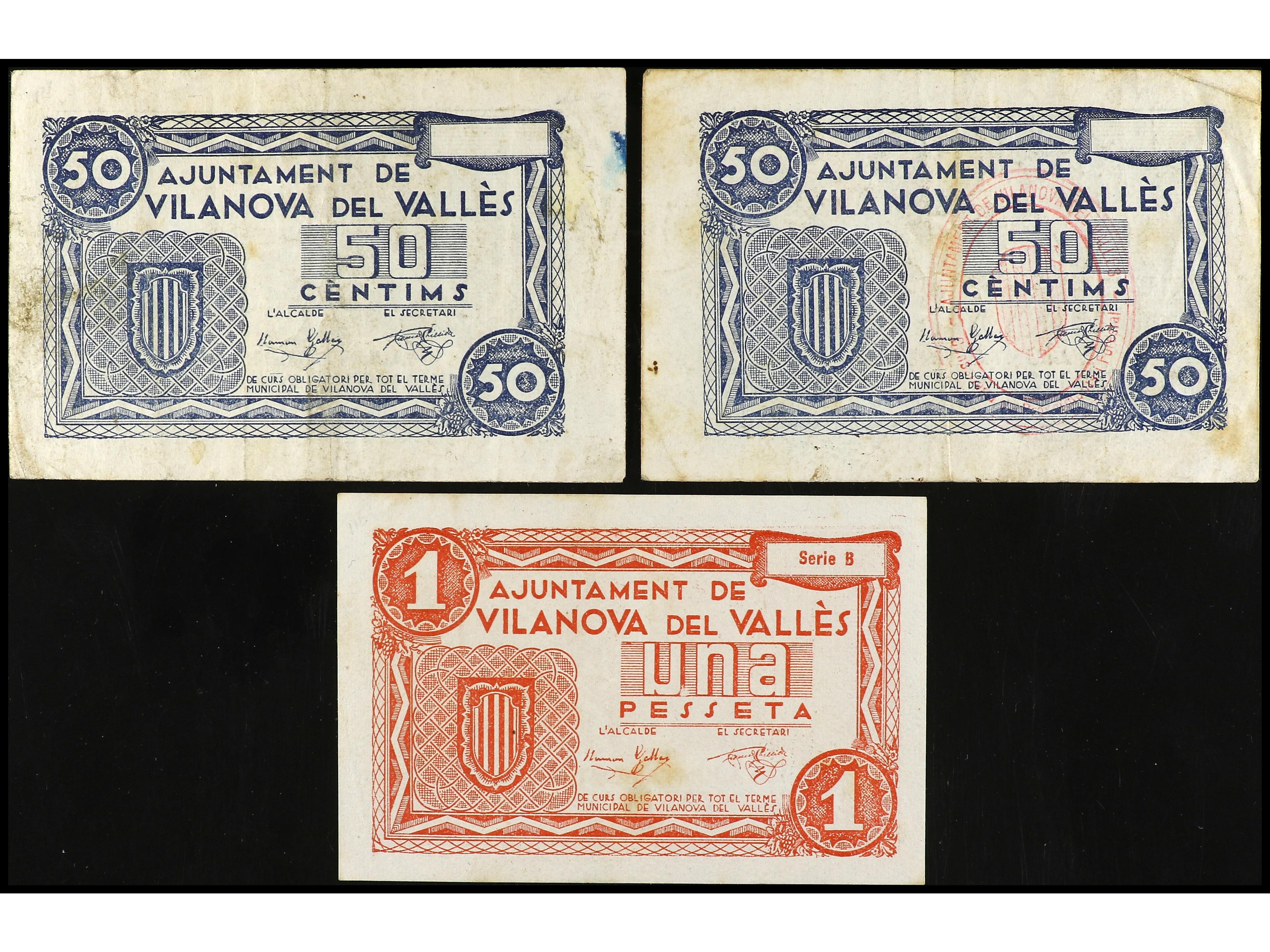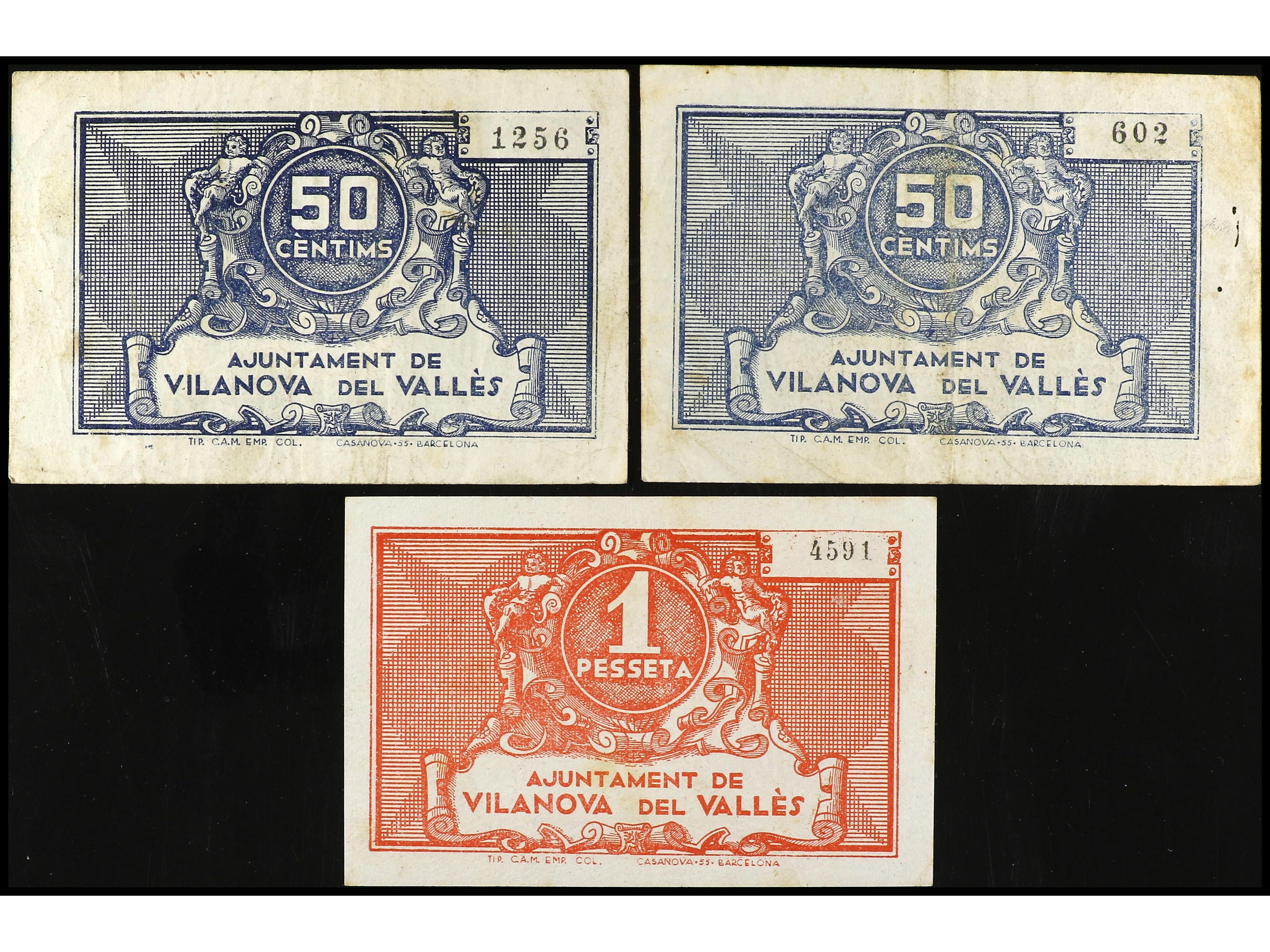 Lote 3 billetes 50 Cèntims (2) y 1 Pesseta. VILANOVA DEL VALLÈS. at-2860, 2861, 2861d. MBC. (Image1) (Image2)