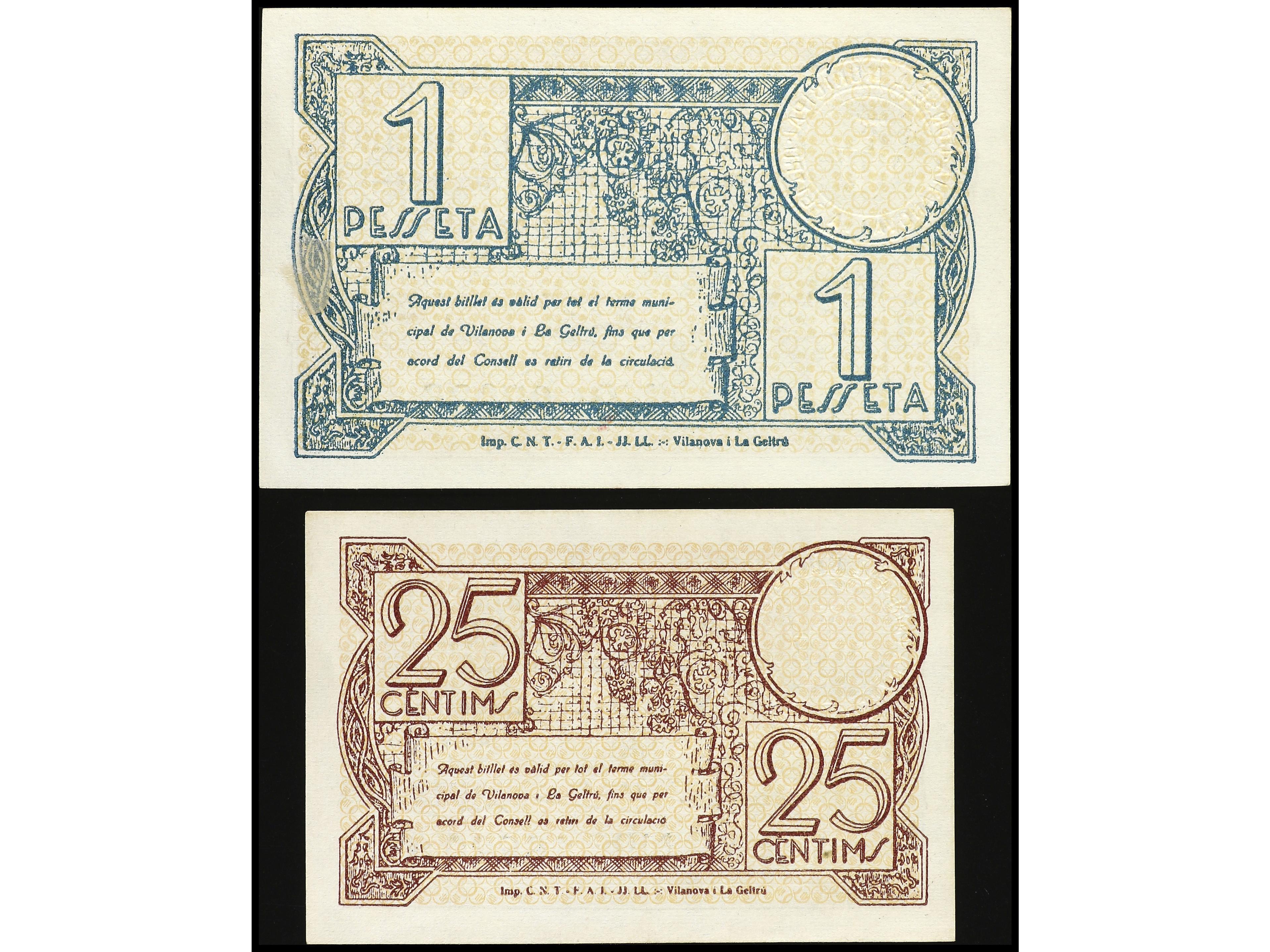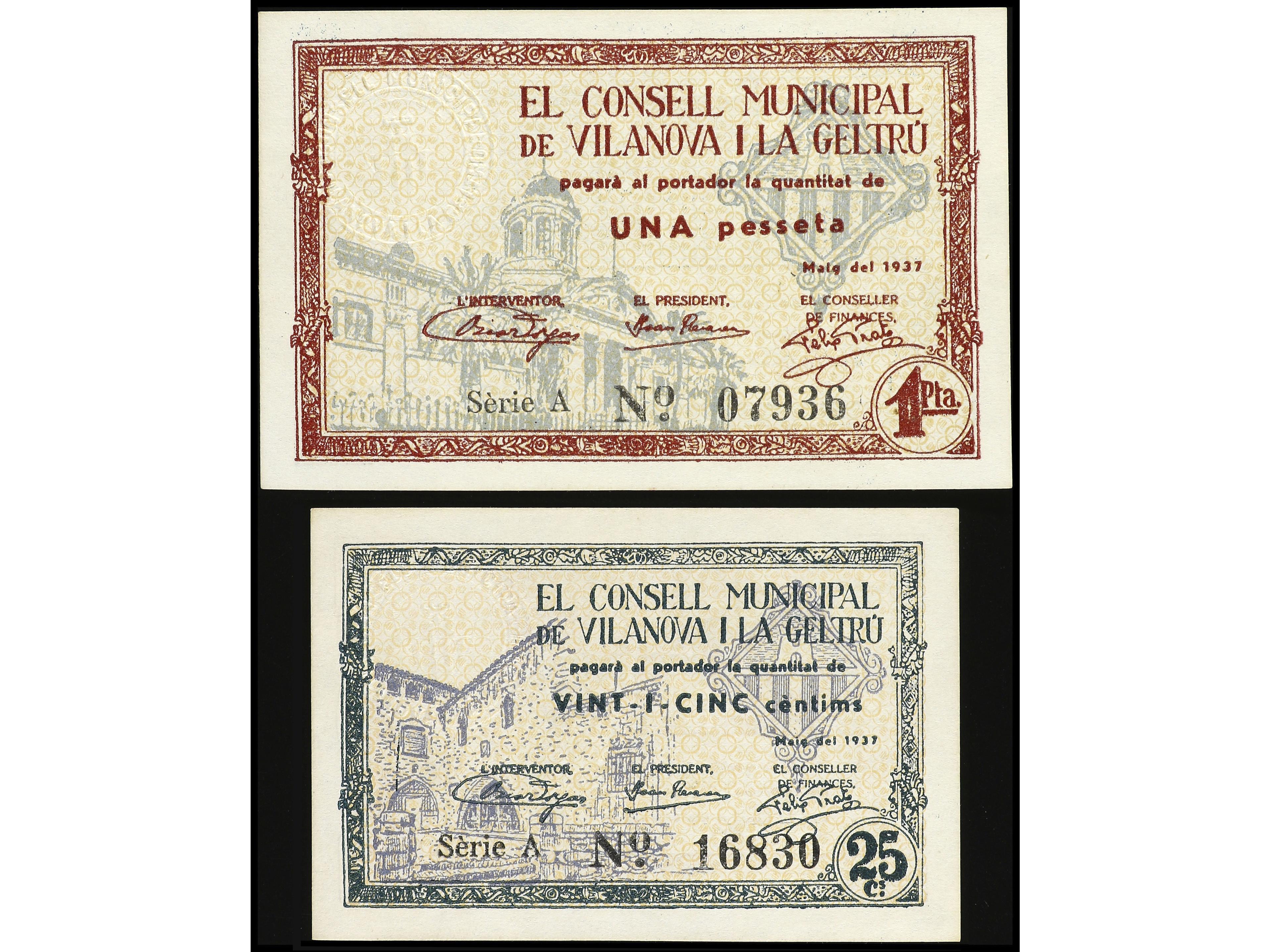 Lote 2 billetes 25 Cèntims y 1 Pesseta. Maig 1937. C.M. de VILANOVA I LA GELTRÚ. AT-2864, 2866. EBC- a EBC. (Image1) (Image2)