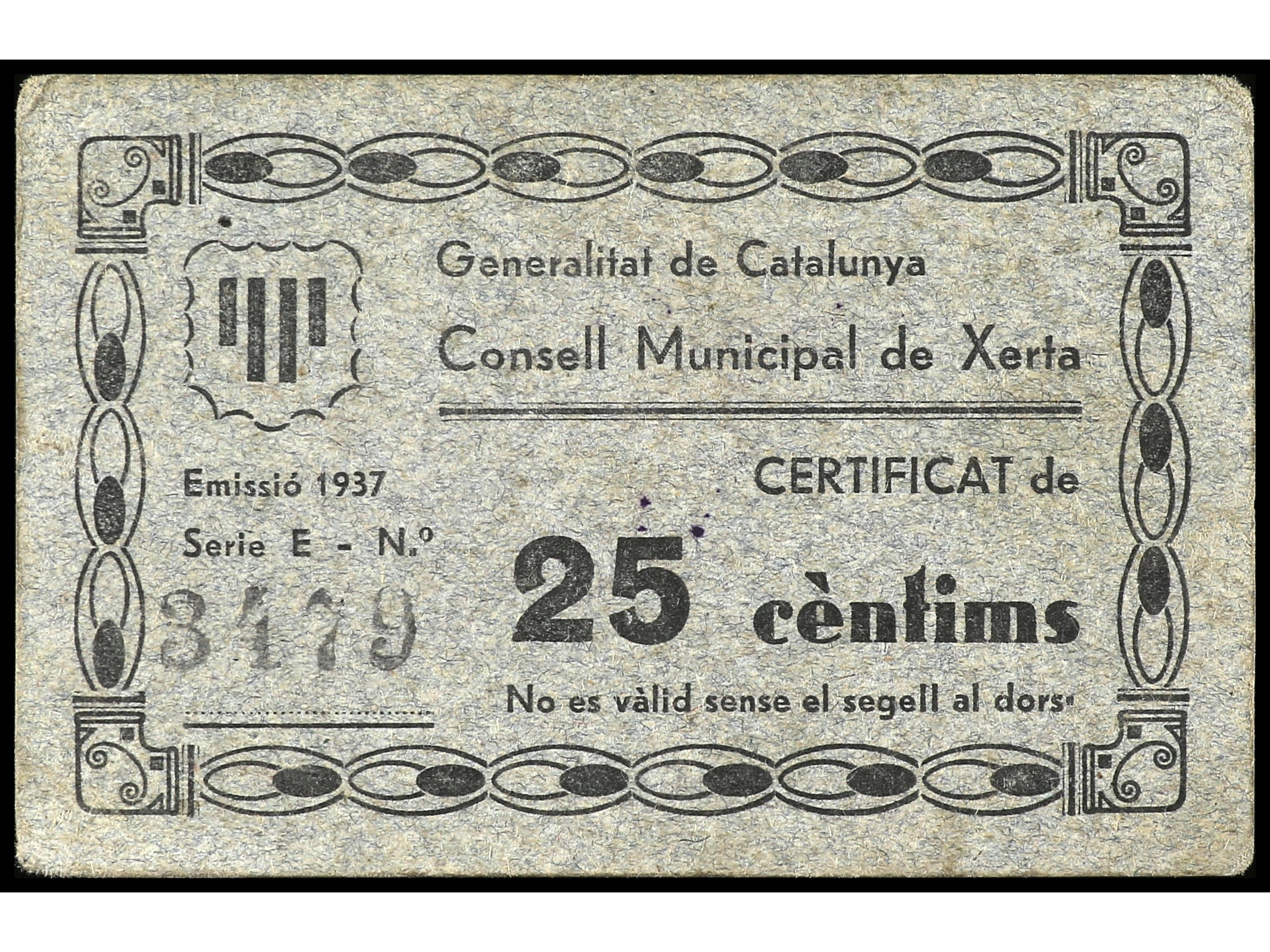 25 Cèntims. 1937. C.M. de XERTA. Cartón. MUY ESCASO. AT-2921. EBC-. (Image1) (Image2)