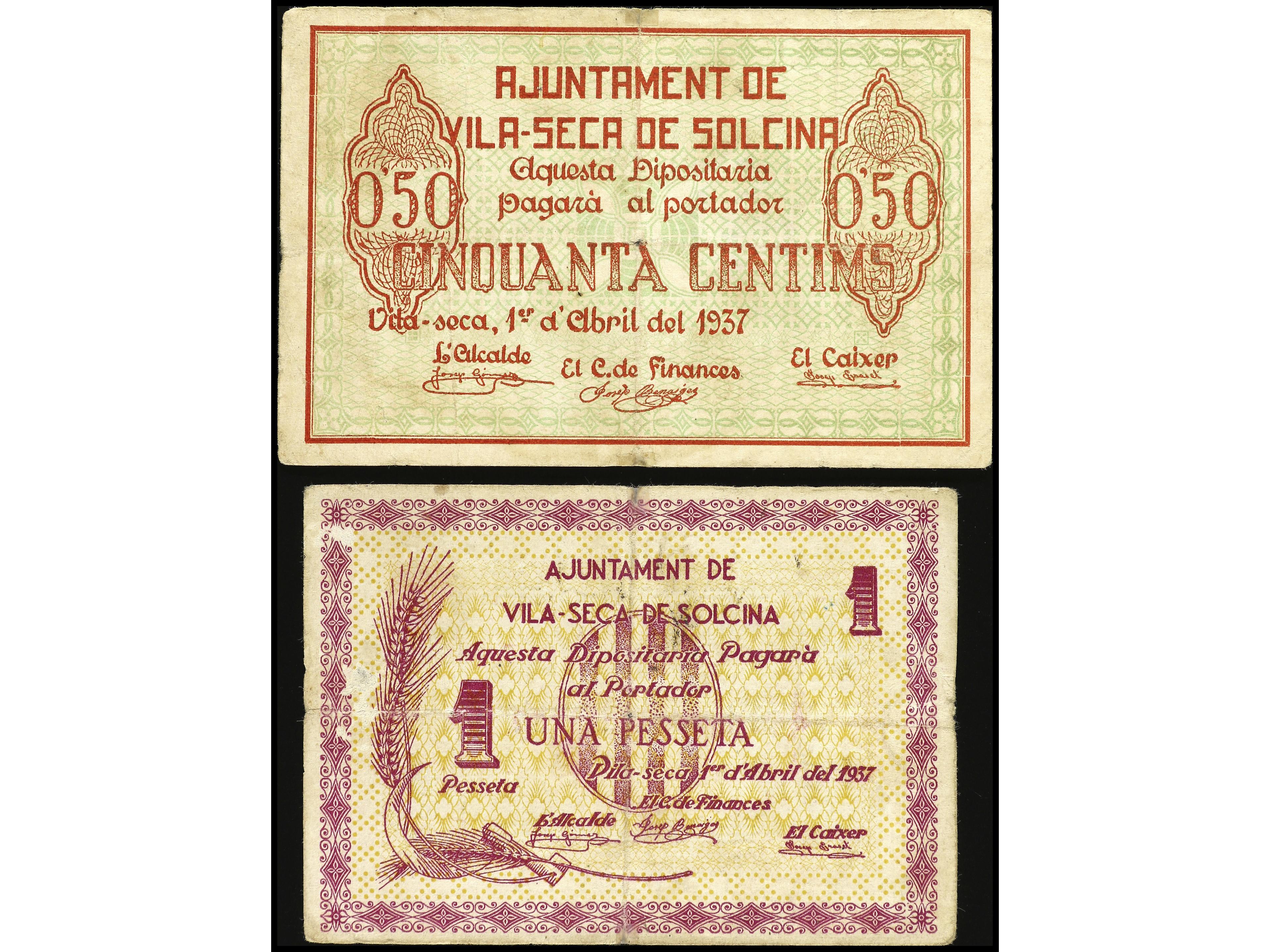 Lote 2 billetes 50 Cèntims y 1 Pesseta. 1 Abril 1937. Aj. de VILA-SECA DE SOLCINA. AT-2879/80. MBC. (Image1) (Image2)