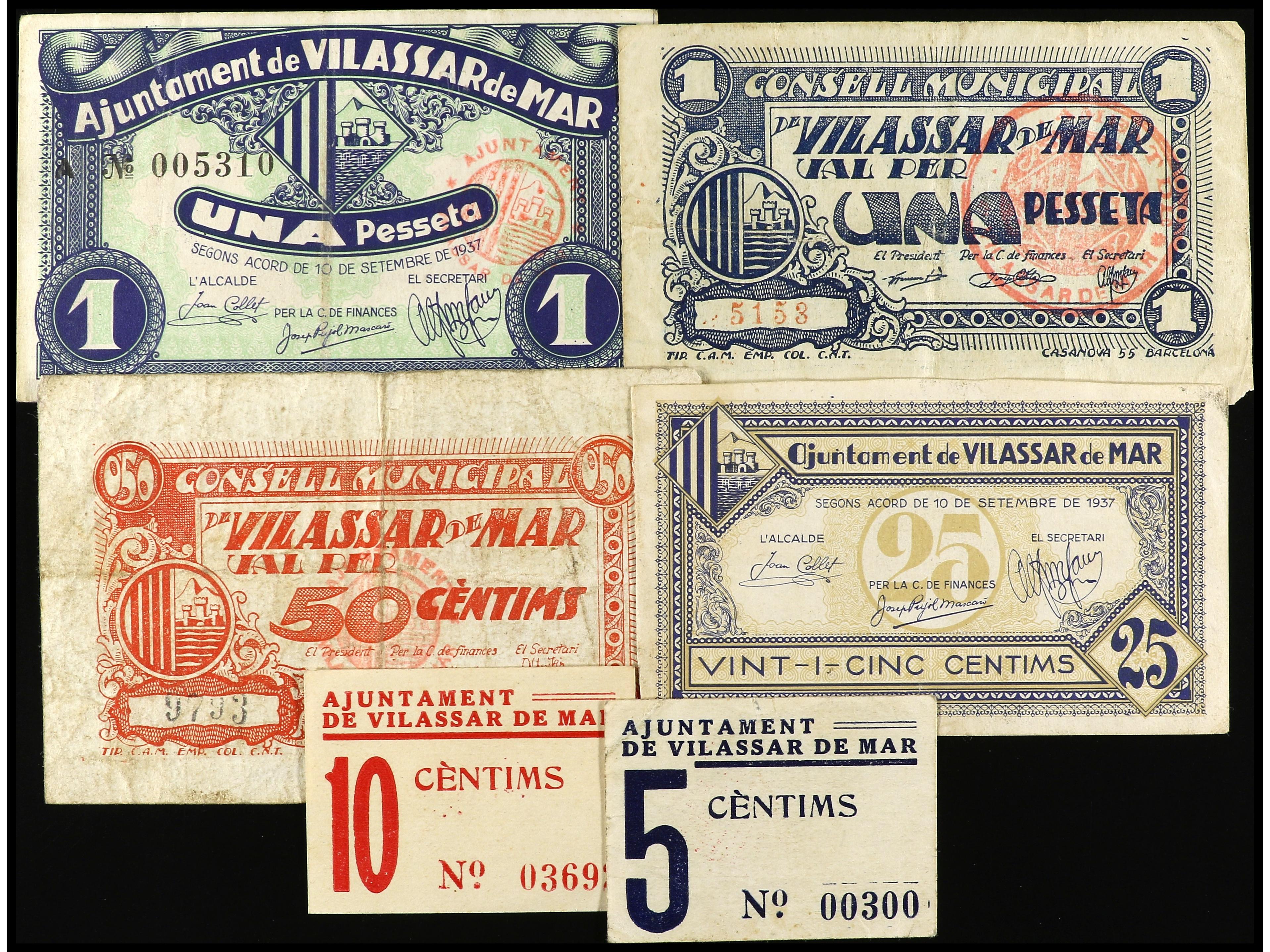 Lote 6 billetes 5 Cèntims a 1 Pesseta. 1937. C.M y Aj. de VILASSAR DE MAR. A EXAMINAR. MBC- a MBC+. (Image1)