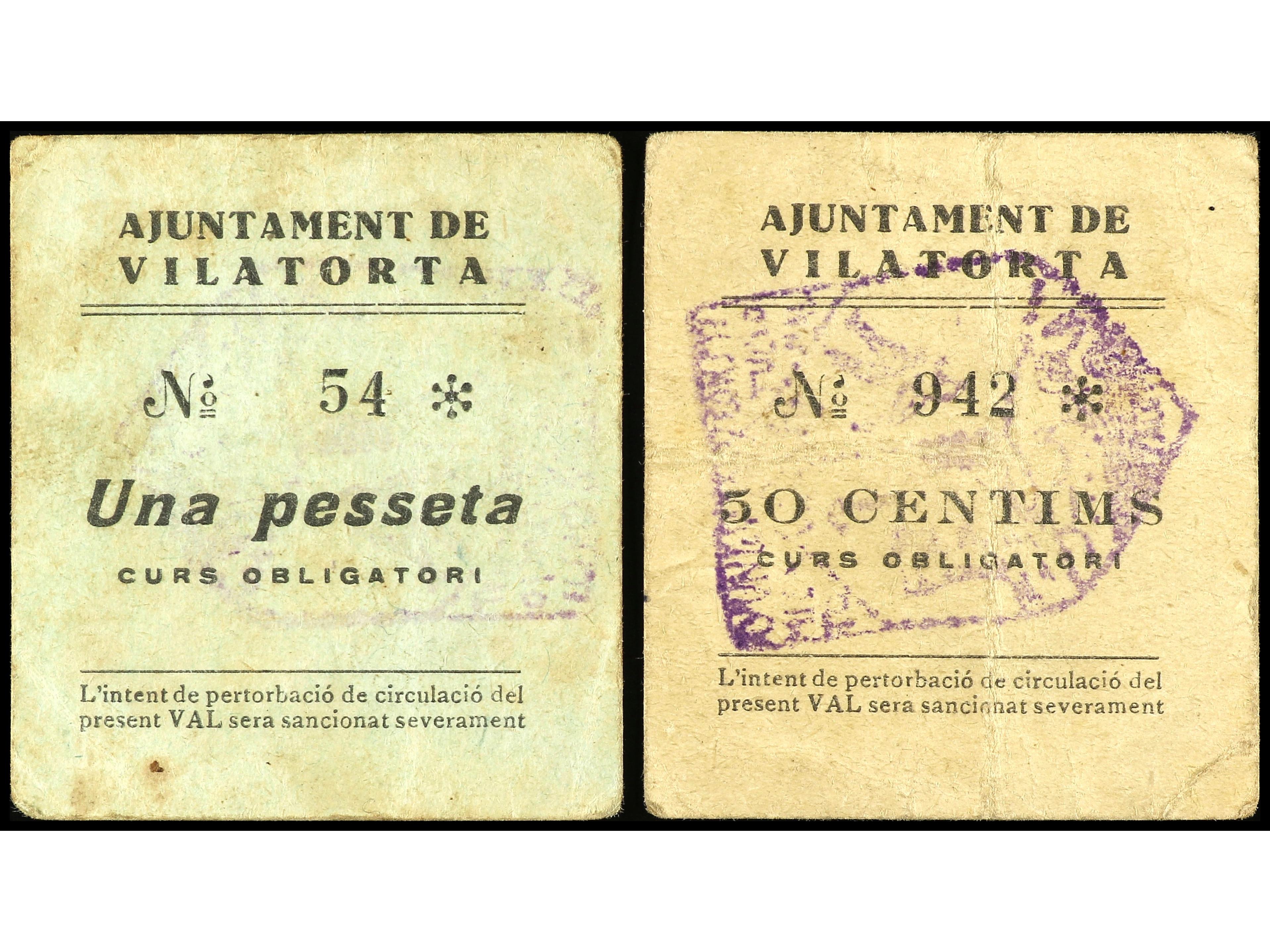 Lote 2 billetes 50 Cèntims y 1 Pesseta. Aj. de VILATORTA. (Algo sucios). RAROS. AT-2895, 2896. MBC. (Image1) (Image2)