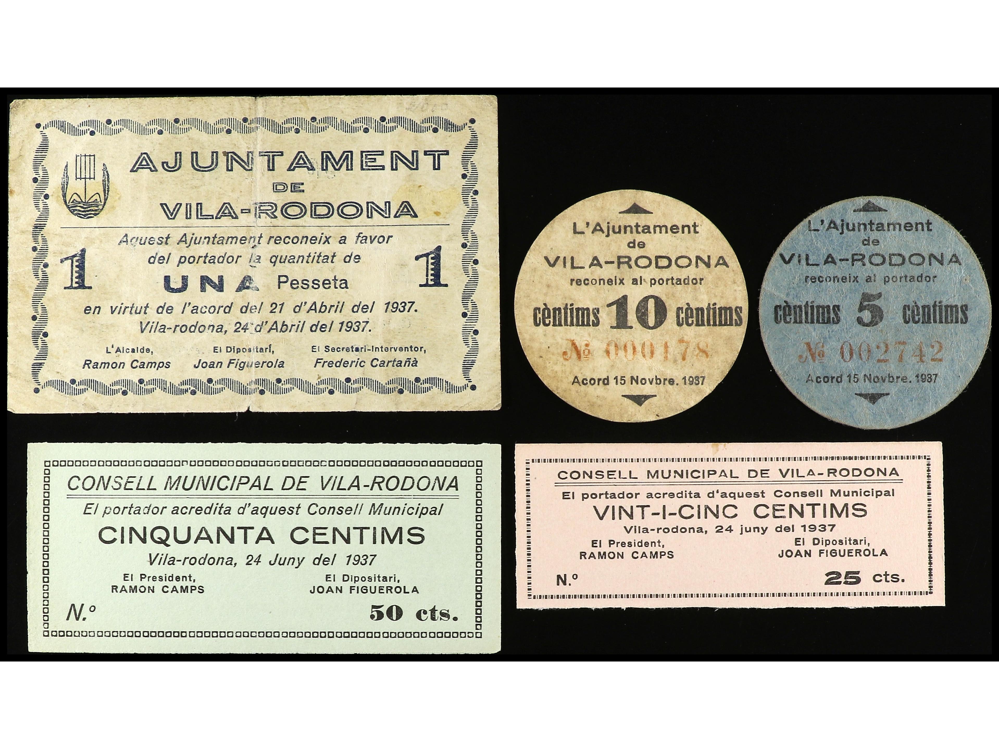 Lote 5 billetes 5, 10, 25, 50 Cèntims y 1 Pesseta. C.M. y Aj. de VILA-RODONA. AT-2872/2876. MBC a EBC. (Image1)