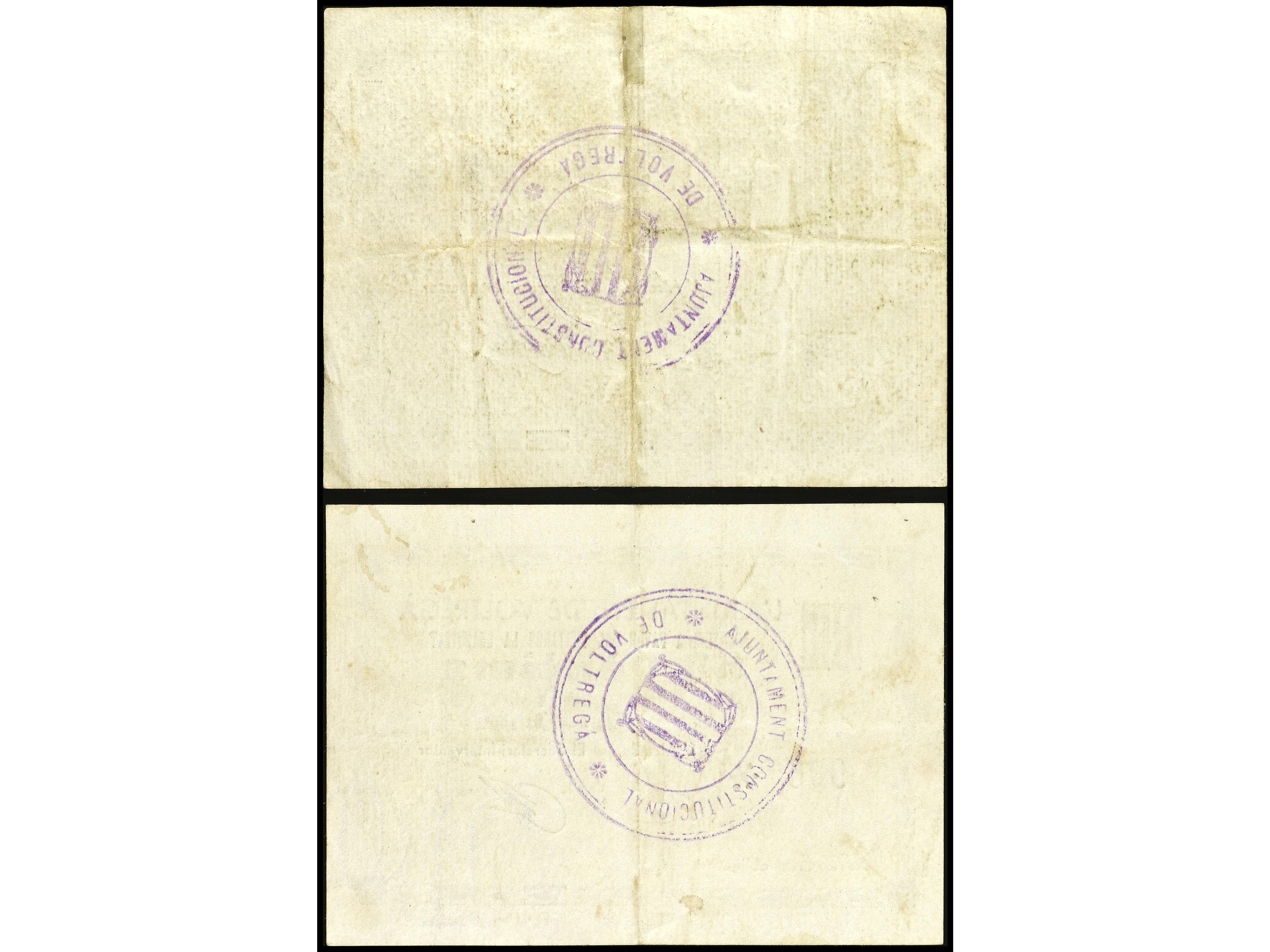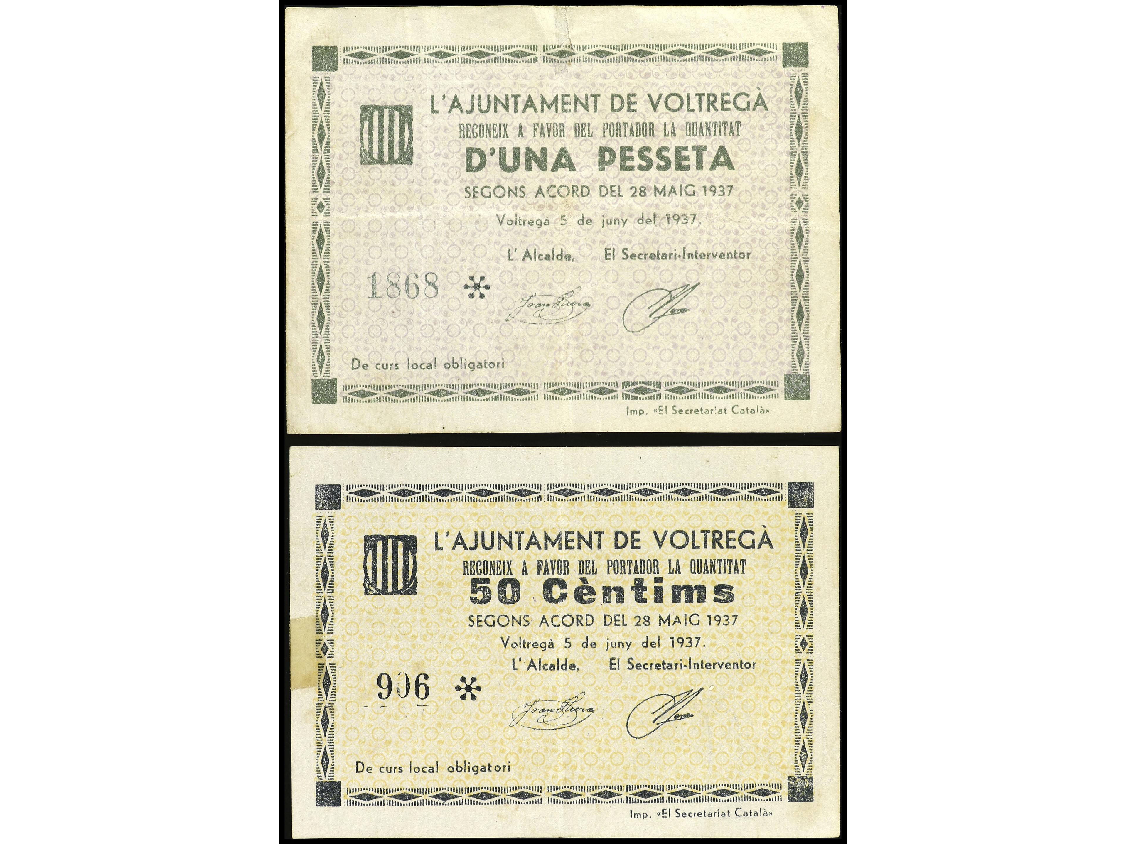 Lote 2 billetes 50 Cèntims y 1 Pesseta. 5 Juny 1937. Aj. de VOLTREGÀ. AT-2914/15. MBC+. (Image1) (Image2)