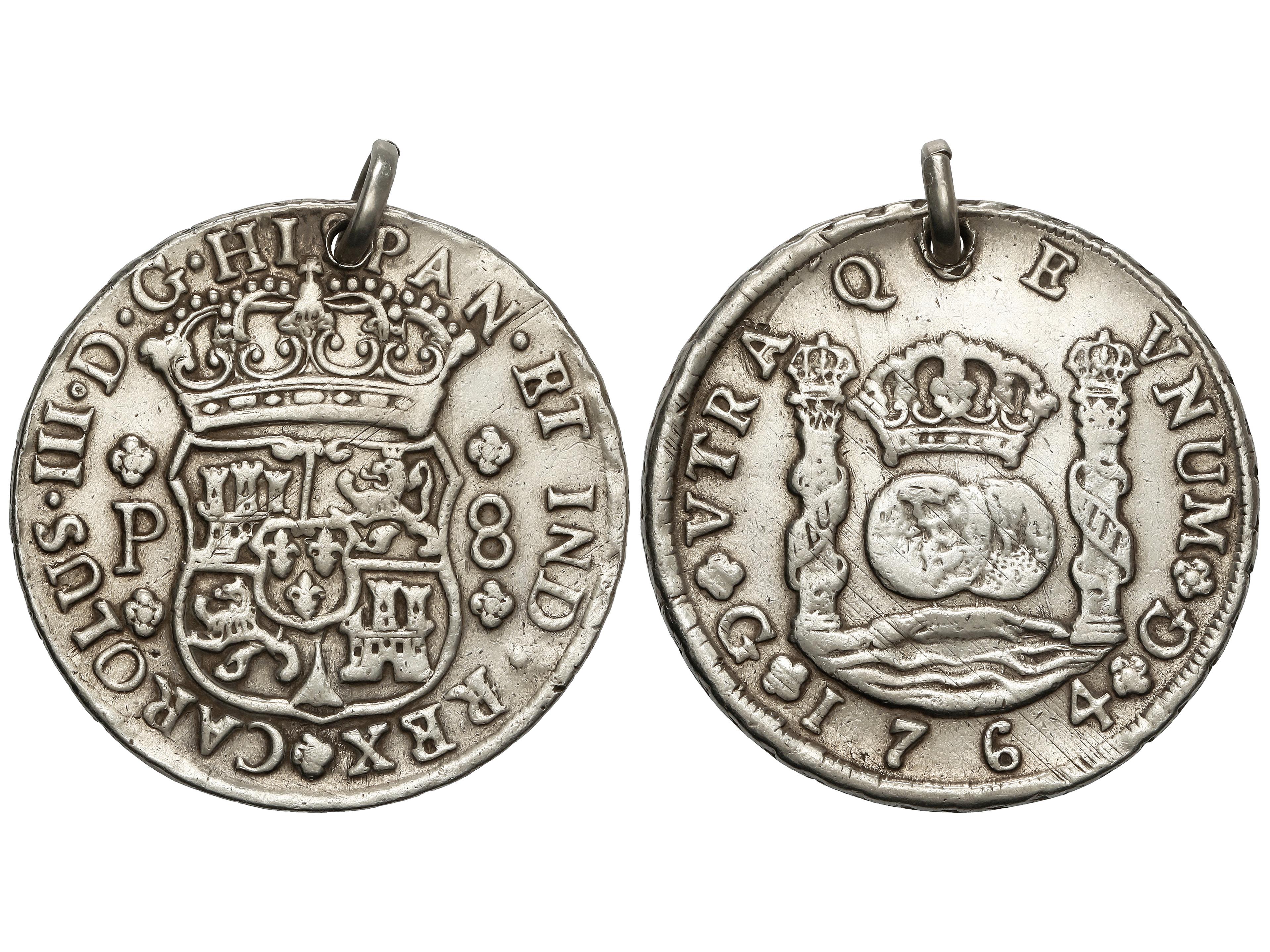 239 image8 Reales. 1764. GUATEMALA. P. 27,09 grs. (Perforación, con anilla, limpiada). MUY RARA. AC-996. MBC-. (Image1)