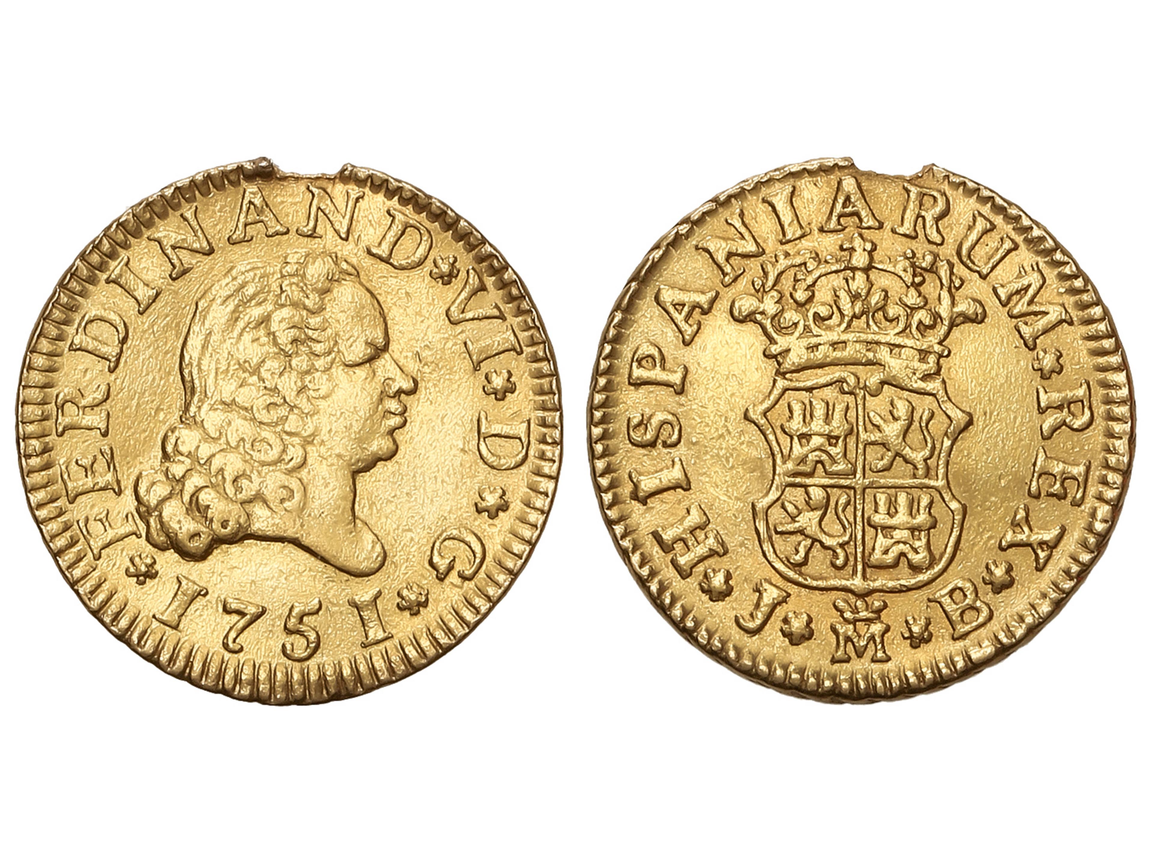 233 image1/2 Escudo. 1751. MADRID. J.B. 1,79 grs. (Descolgada. Algo recortada a las 12h). AC-554. MBC+. (Image1)
