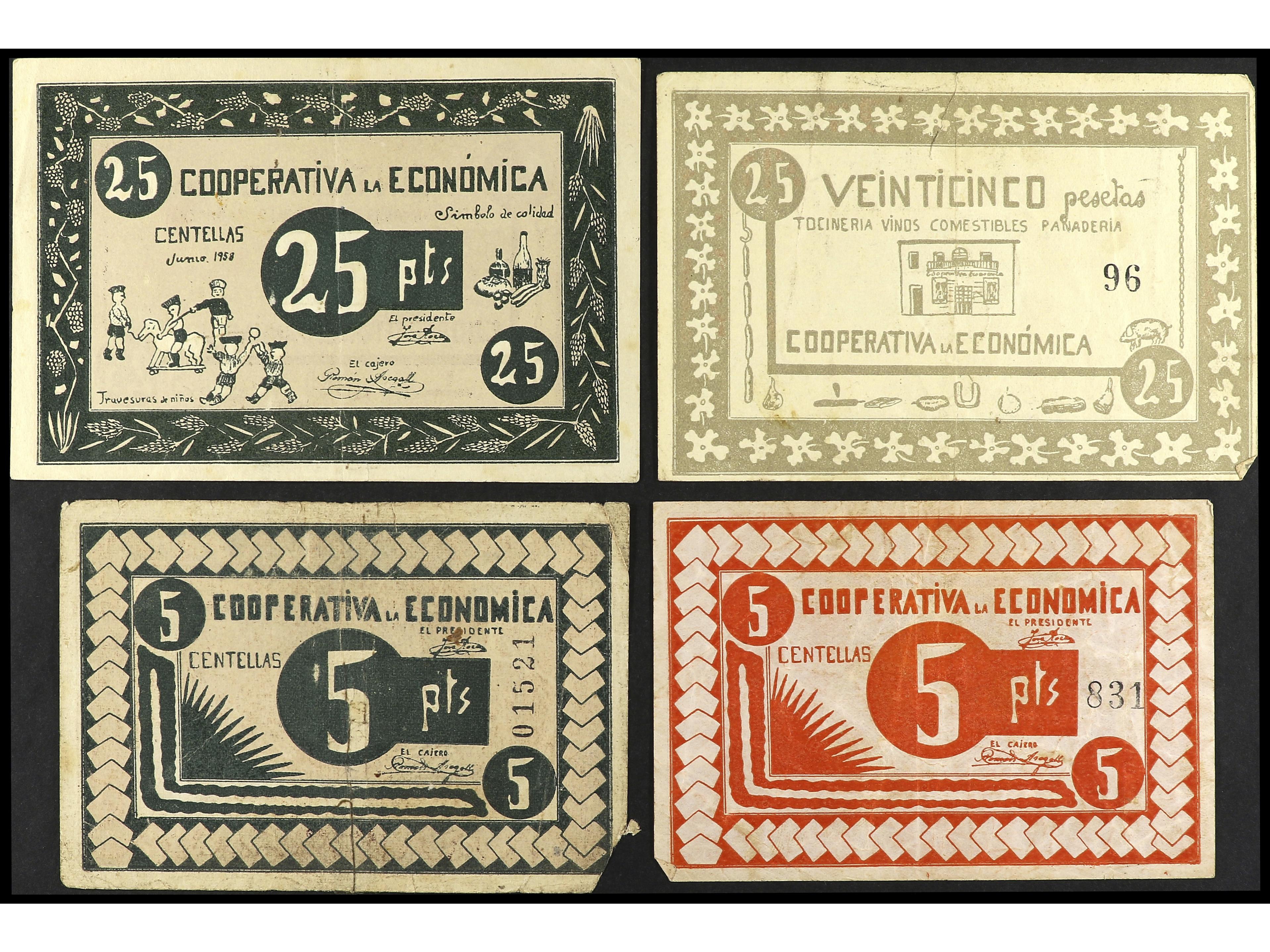 Lote 4 billetes 5 (2) y 25 Pesetas (2). Junio 1958. COOPERATIVA LA ECONÓMICA. CENTELLAS. L-2909/12. MBC- a EBC-. (Image1)