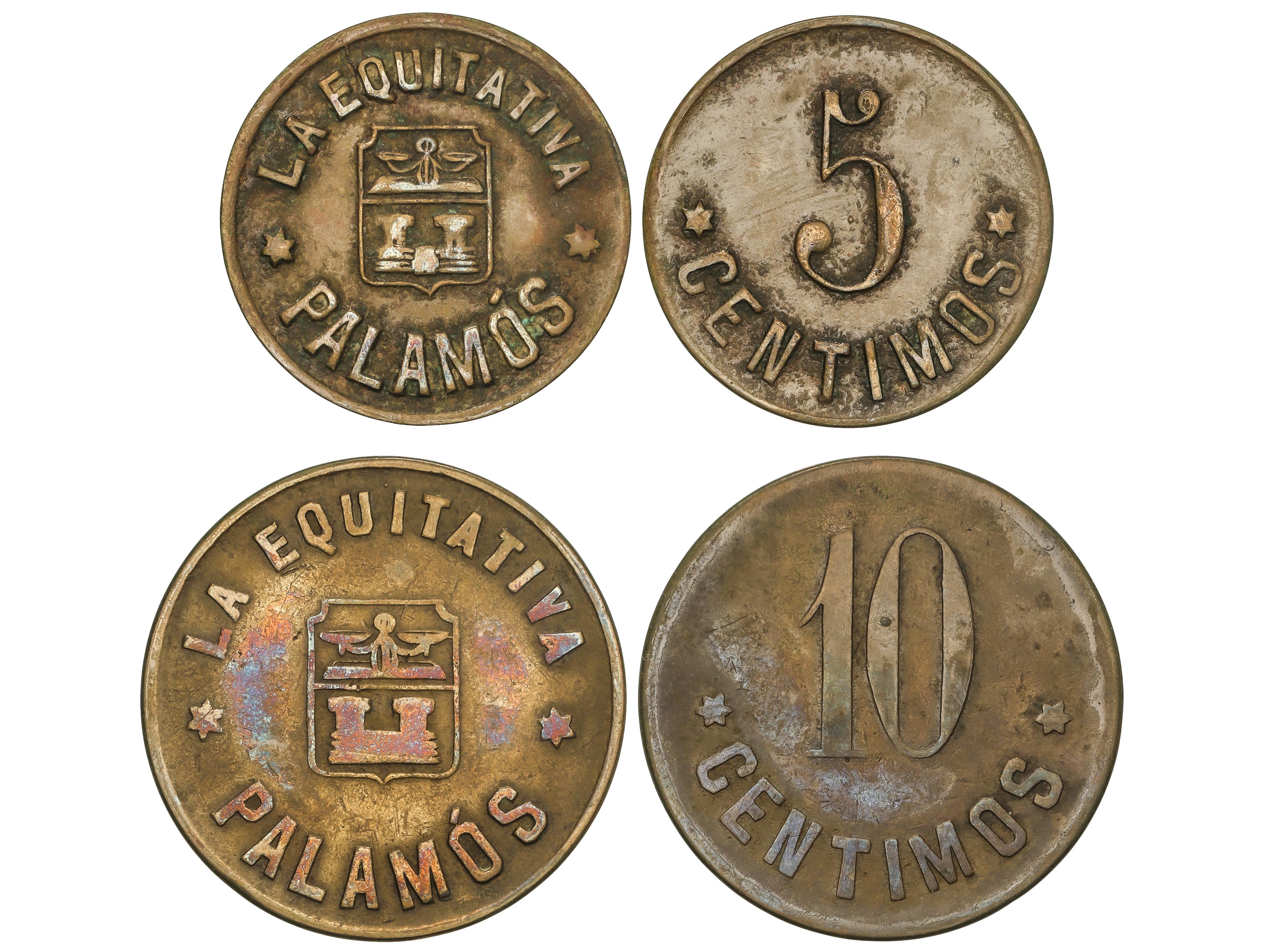 Lote 2 fichas 5 y 10 Céntims. LA EQUITATIVA. PALAMÓS. Latón. ESCASAS. L-2074/75. MBC+. (Image1)