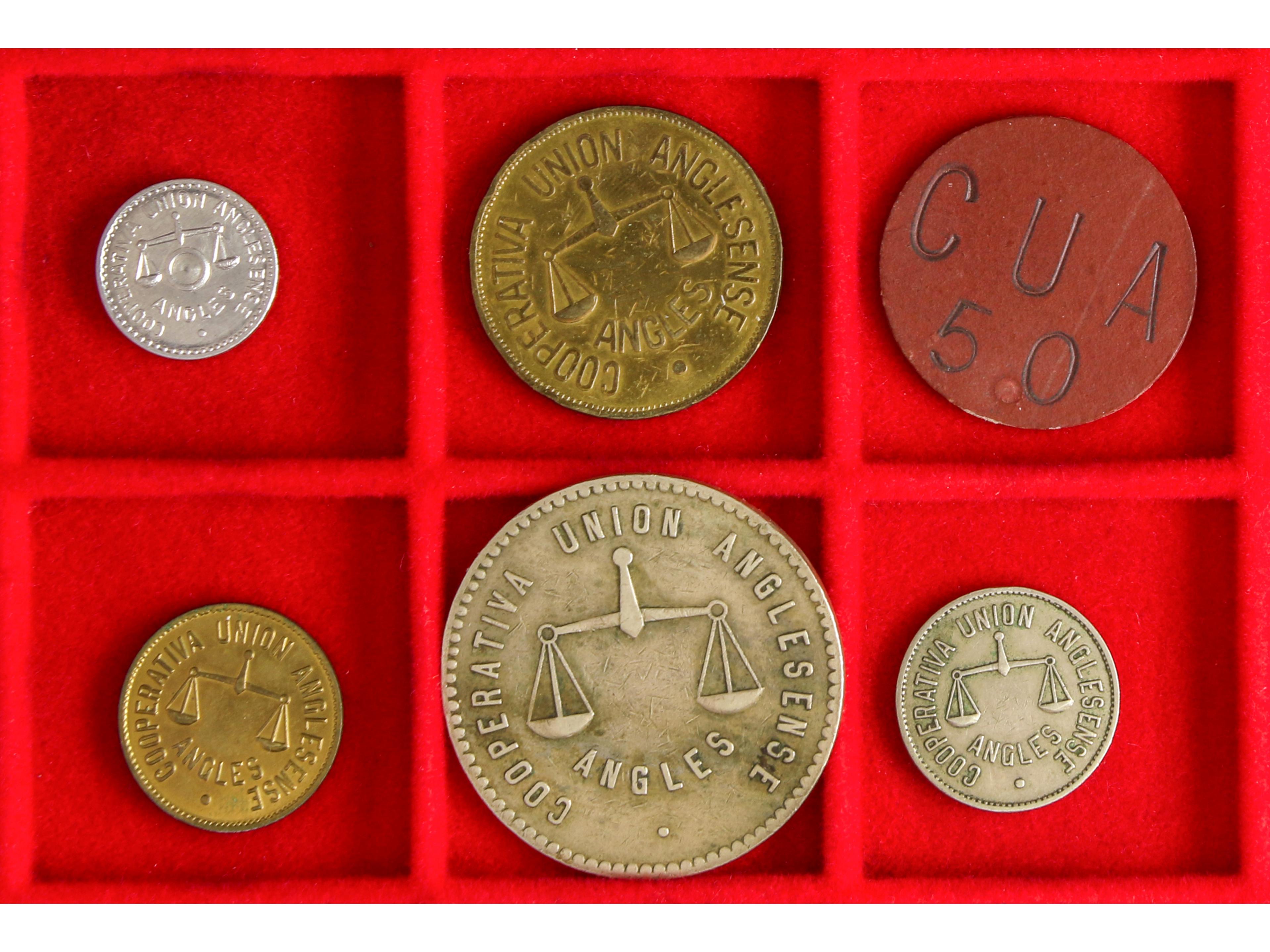 Lote 6 fichas 5 (2) 25 y 50 Pessetes. COOPERATIVA UNIÓN ANGLESENSE. ANGLÉS. Latón,Ni. L-2200v, 2201, 2202, 2203, 2204. MBC+ y EBC.