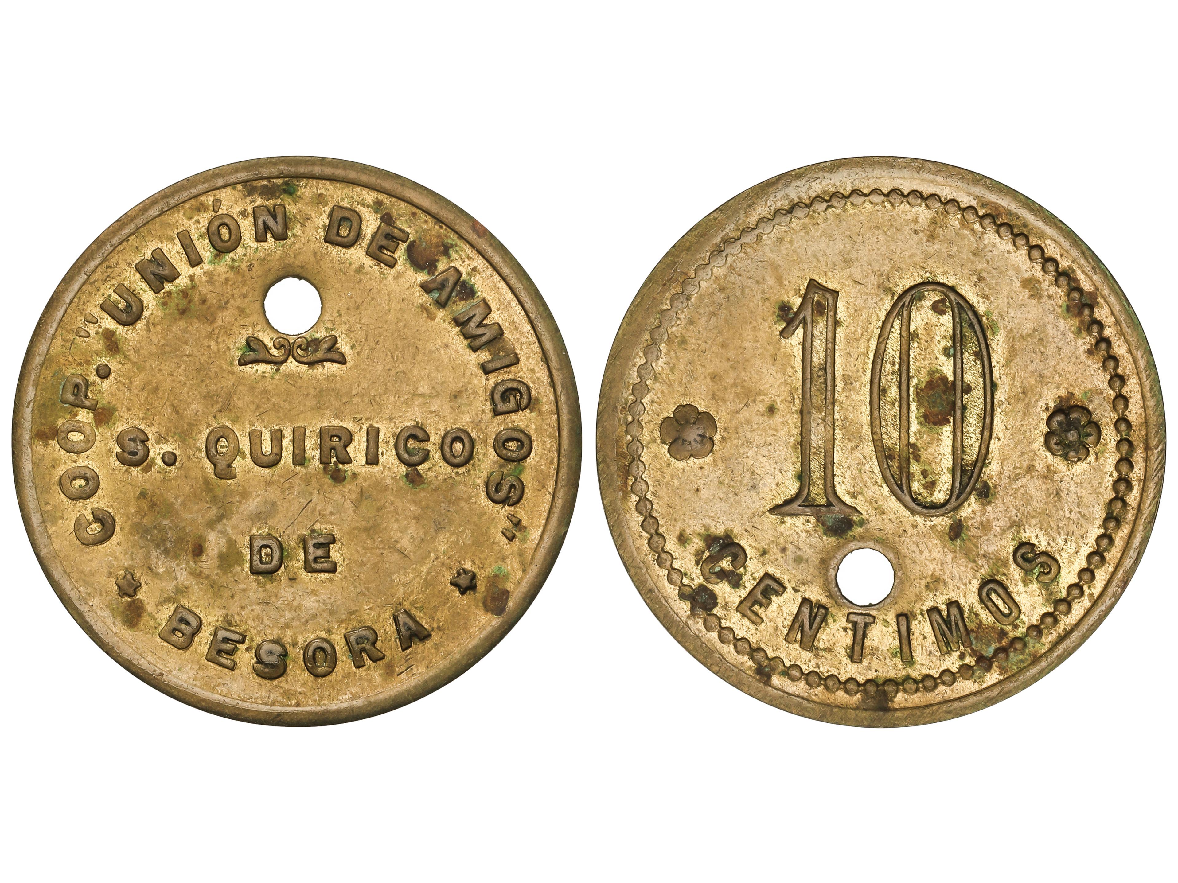 10 Cèntims. COOPERATIVA UNION DE AMIGOS. SAN QUIRICO DE BESORA. Latón. L-2888. MBC+. (Image1)