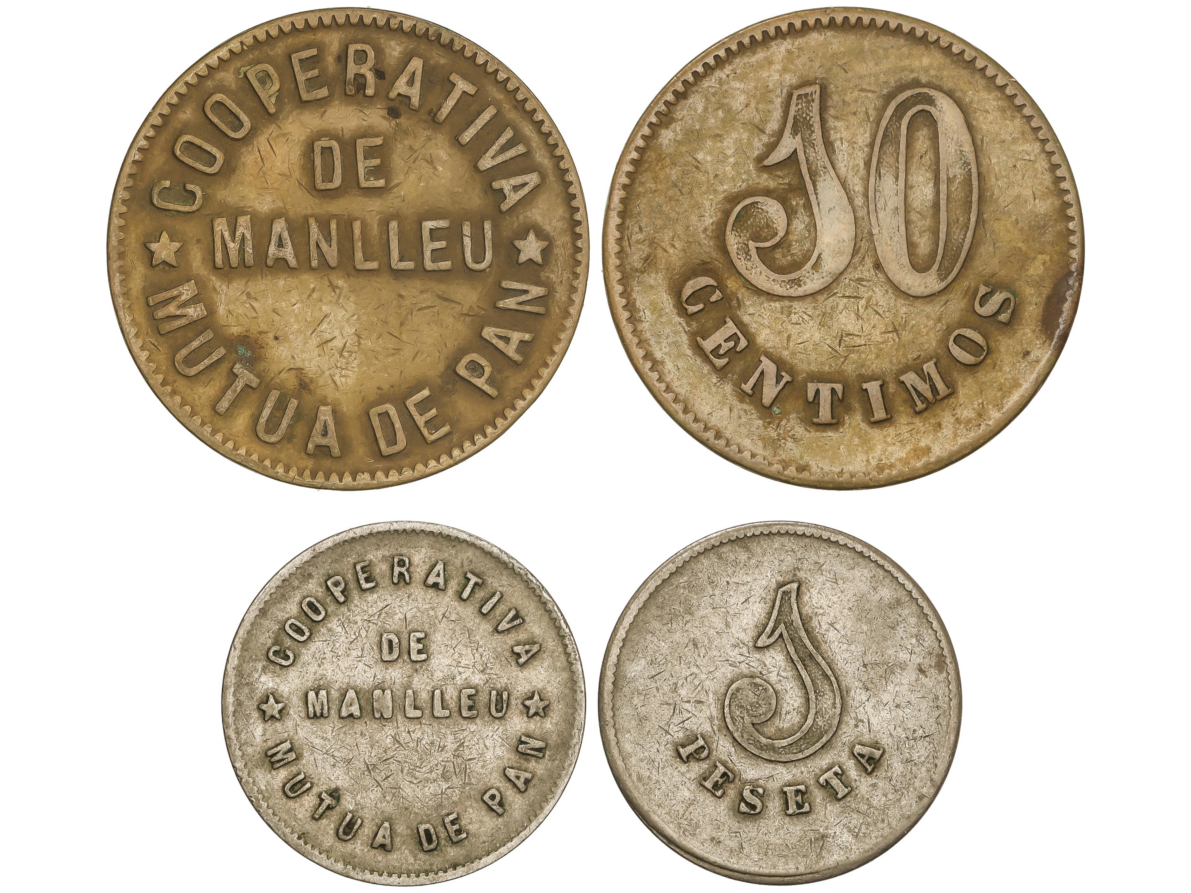 Lote 2 fichas 10 Céntims y 1 Pesseta. MUTUA DE PAN. COOPERATIVA DE MANLLEU. Latón y Ni. L-2935, 2937. MBC+. (Image1)