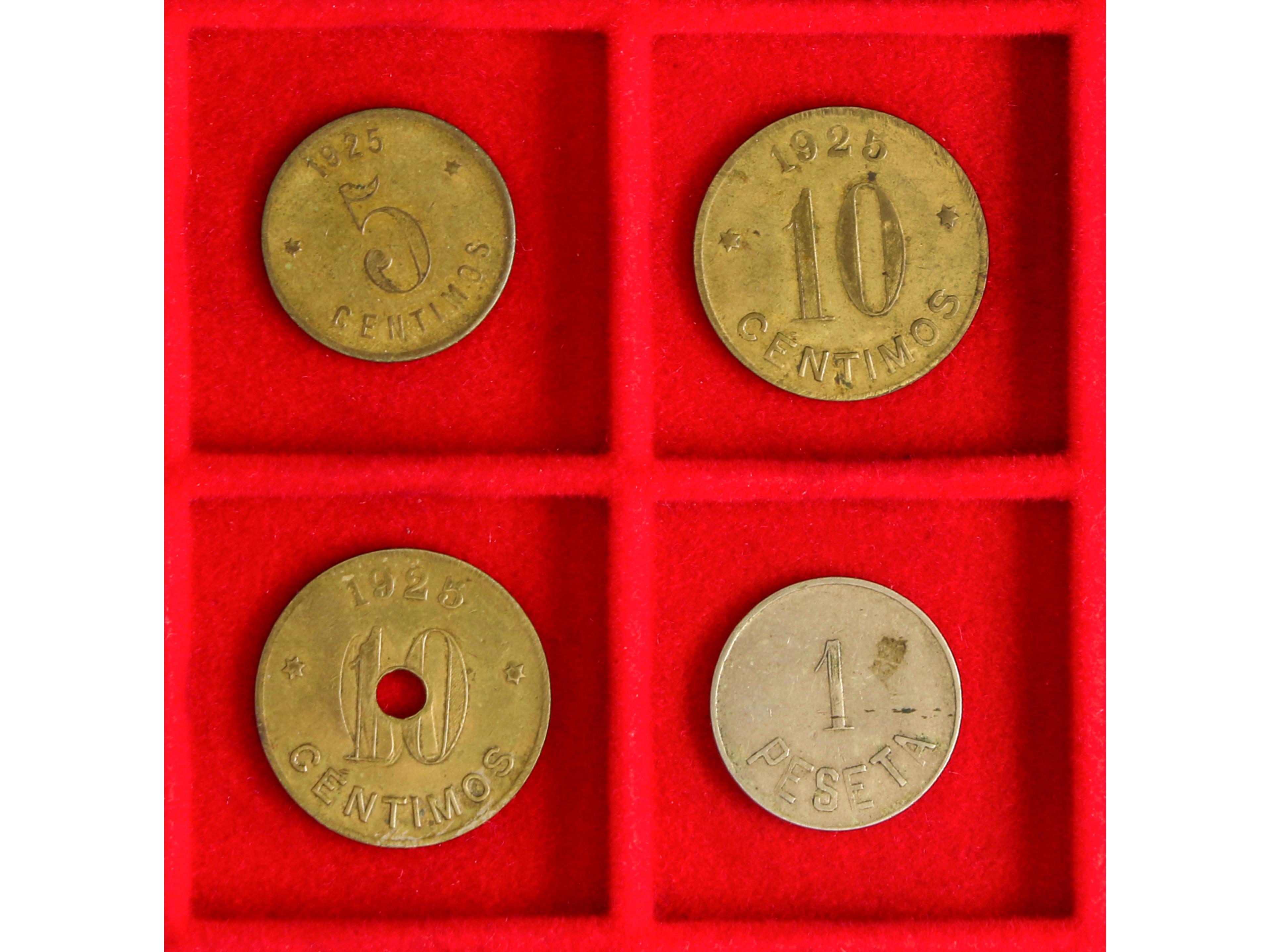 Lote 4 fichas 5, 10 y 25 Cèntims y 2 Pessetes. COOPERATIVA LA ACTIVIDAD OBRERA L´ ESQUIROL. Latón,Ni. L-2923, 2924, 2925, 2928. MBC+.