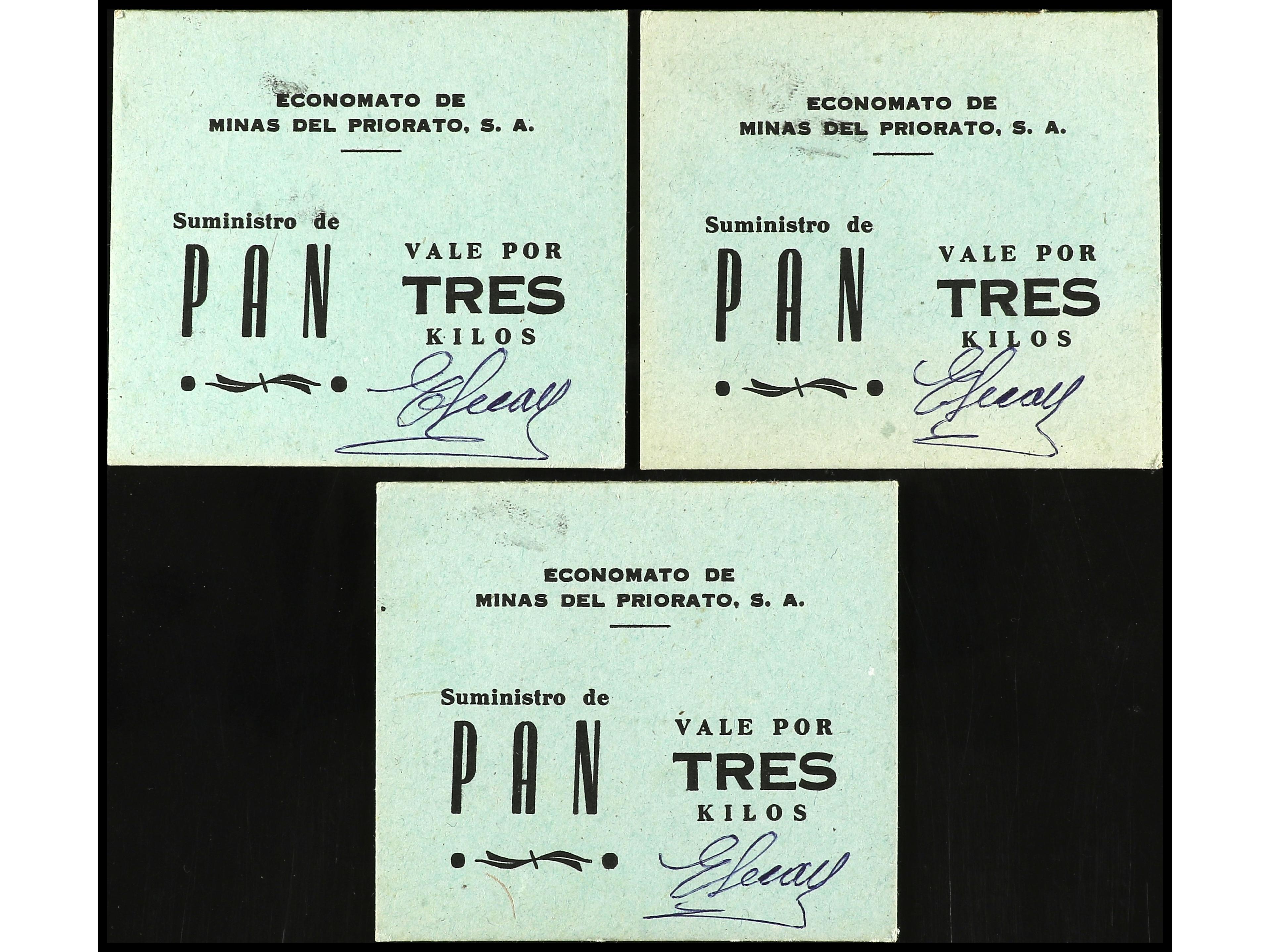 Lote 3 vales por 3 Kilos de Pan. ECONOMATO DE MINAS DEL PRIORATO S.A. Suministro de Pan. Cartón. RAROS. L-No Cat. EBC-. (Image1)
