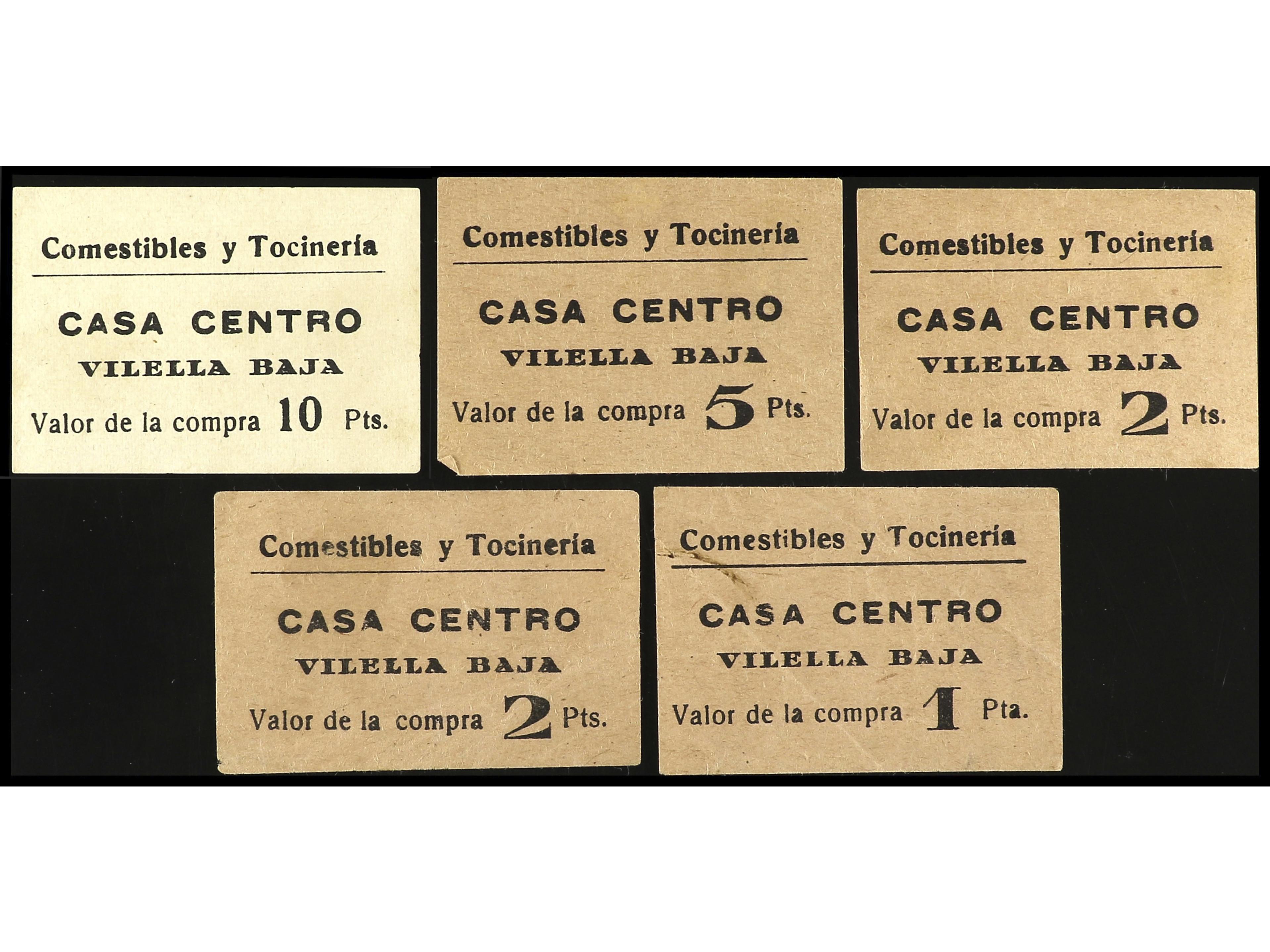 Lote 5 vales de compra 1, 2 (2), 5 y 10 Pesetas. COMESTIBLES Y TOCINERÍA CASA CENTRO. VILELLA BAJA. L-No Cat. MBC+ a EBC.
