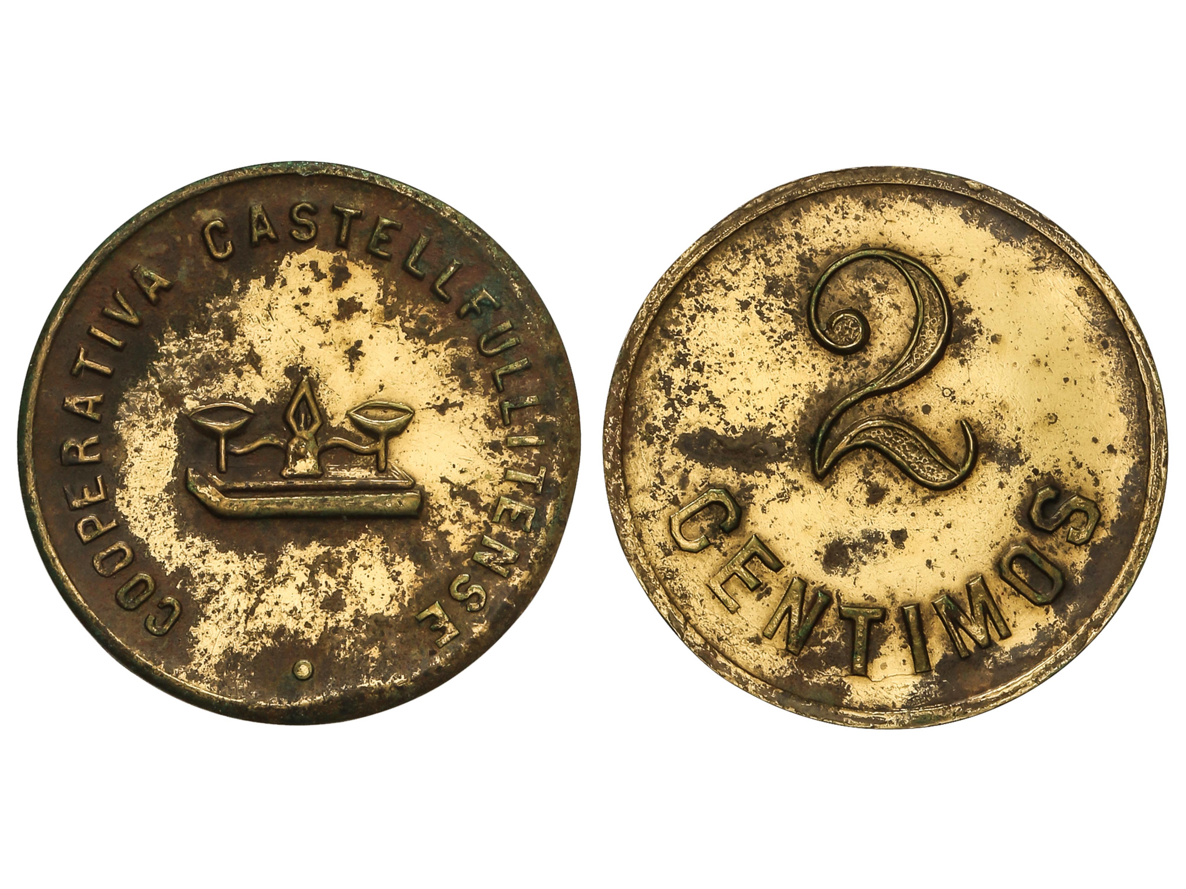 2 Cèntims. COOPERATIVA CASTELLFULLITENSE. CASTELLFULLIT DE LA ROCA. Latón. RARA. L-No Cat. MBC. (Image1)