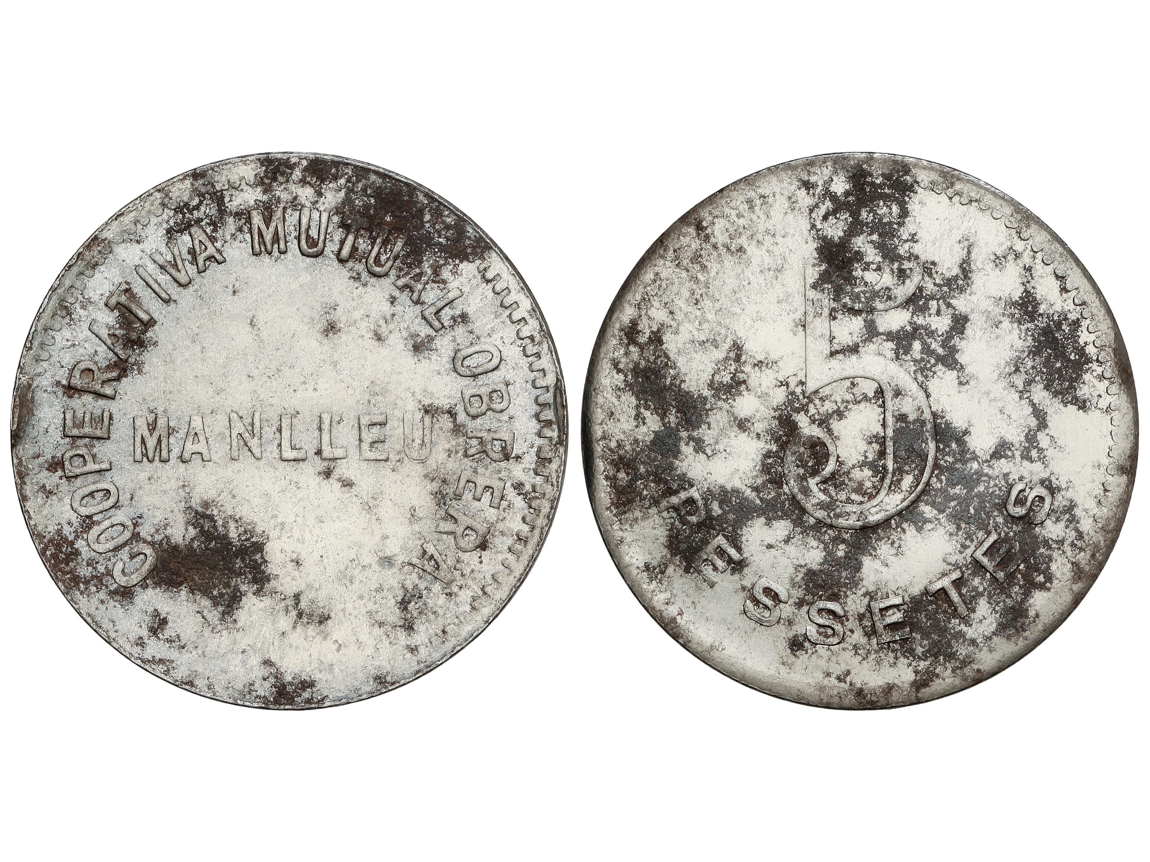 5 Pessetes. COOPERATIVA MUTUAL OBRERA. Fe. (Oxidaciones). MUY ESCASA. L-2962. MBC. (Image1)