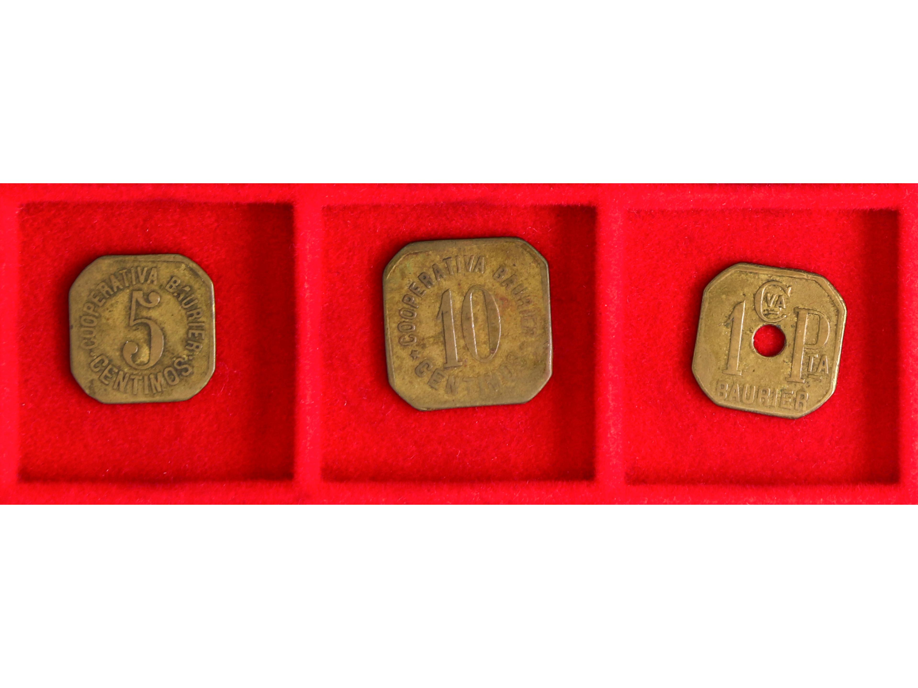 Lote 3 fichas 5 y 10 Cèntims y 1 Pesseta. COOPERATIVA BAURIER. COLONIA BAURIER. RODA DE TER. Latón. RARAS. L-2974 5 y 10 cèntims No Cat. MBC. (Image1)
