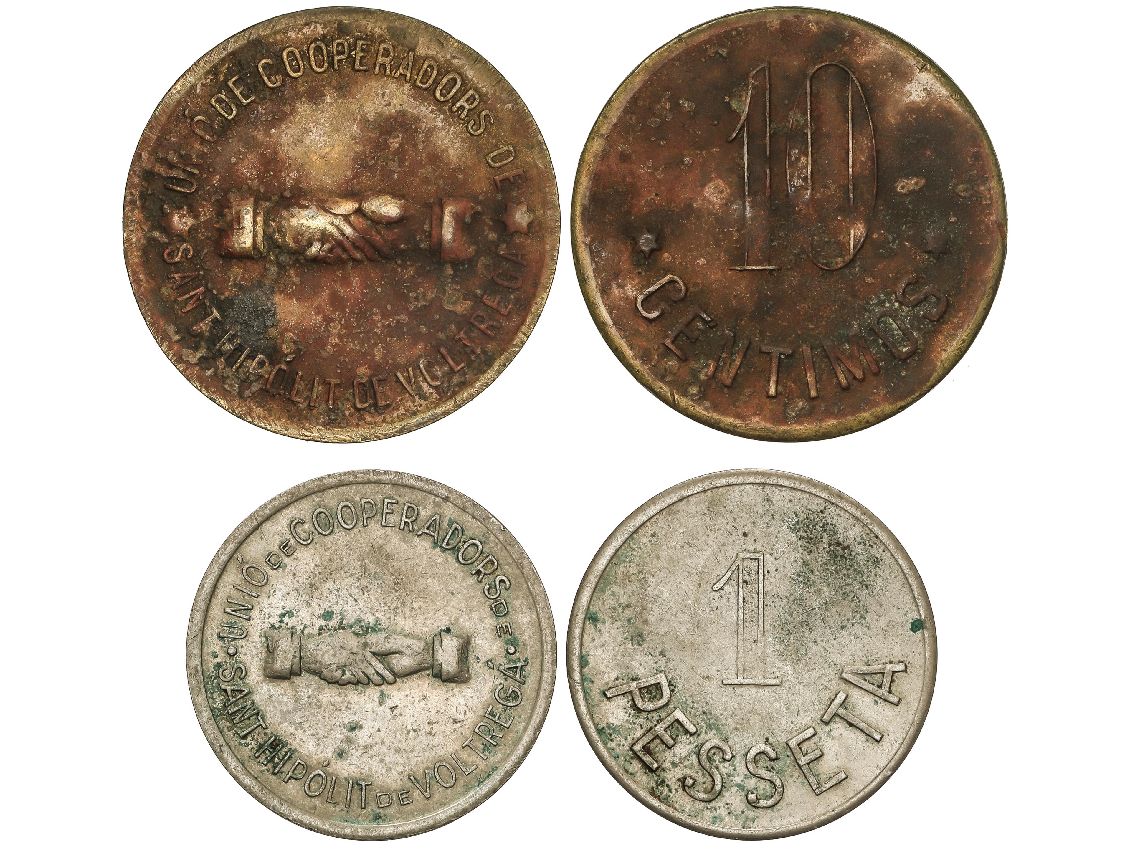 Lote 2 fichas 10 Céntims y 1 Pesseta. UNIÓ DE COOPERADORS DE SANT HIPOLIT DE VOLTREGÀ. Latón y Ni. L-2996, 2998. MBC. (Image1)