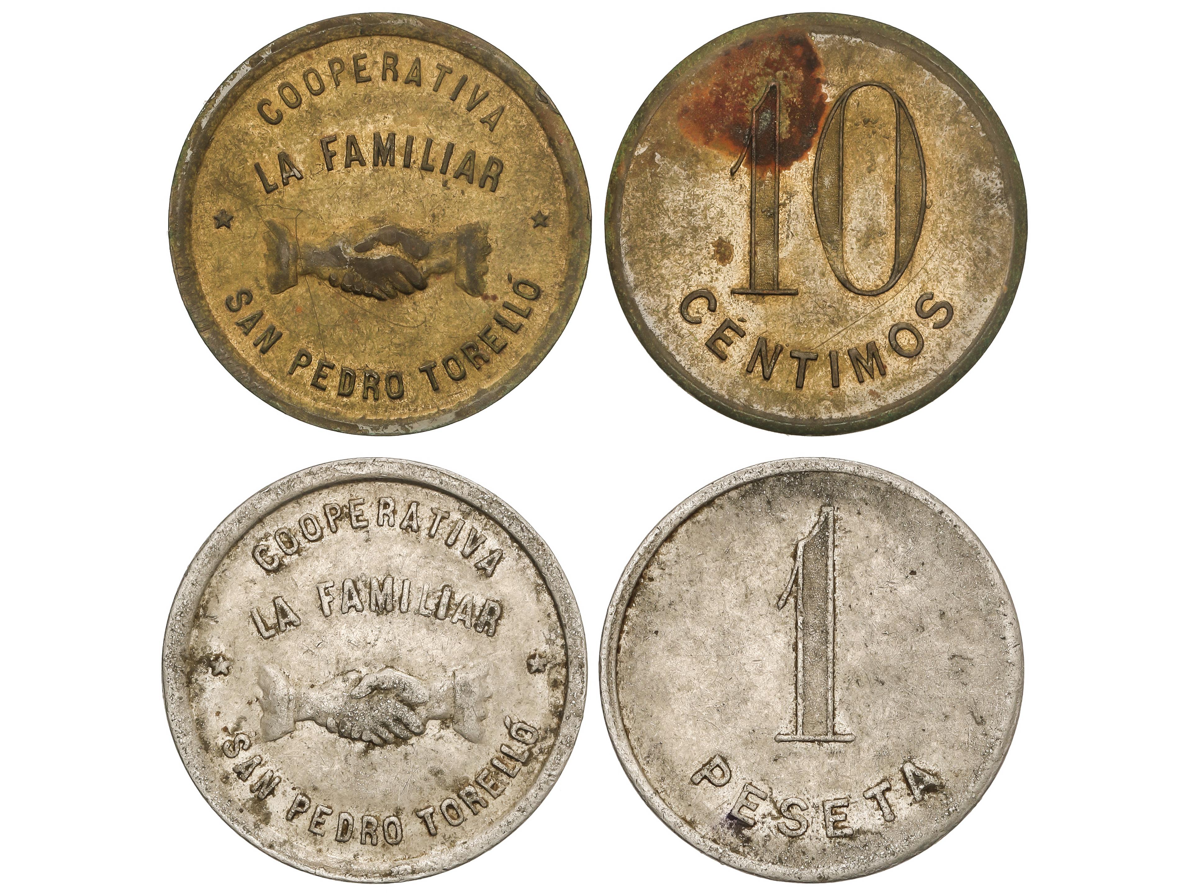 Lote 2 fichas 10 Cèntims y 1 Pesseta. COOPERATIVA LA FAMILIAR. SAN PEDRO DE TORELLO. Latón,Ni. L-3001v, 3002. MBC. (Image1)