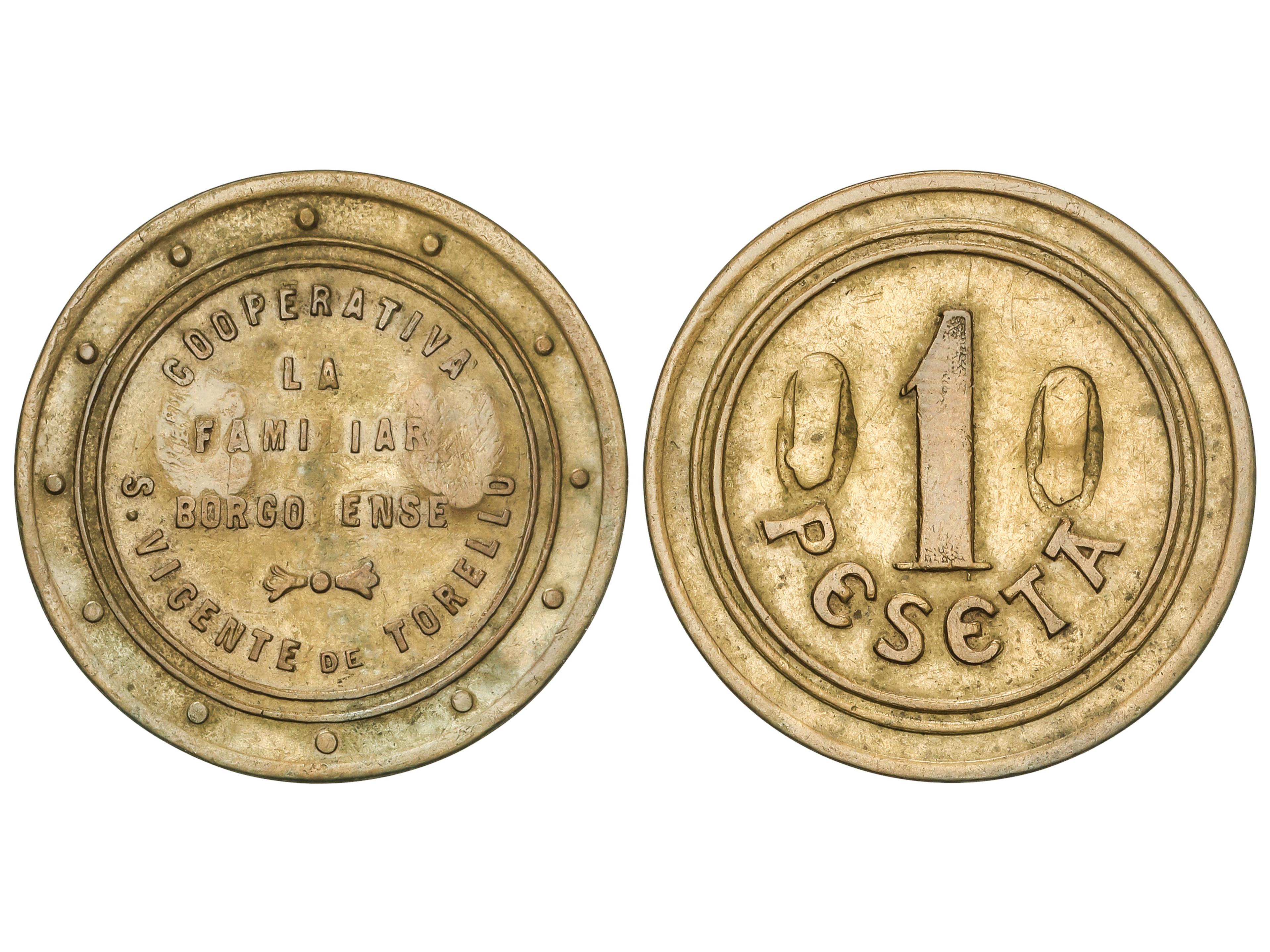 1 Pesseta. COOPERATIVA LA FAMILIAR BORGOÑENSE. SAN VICENTE DE TORELLÓ. Latón. L-3007. MBC+. (Image1)
