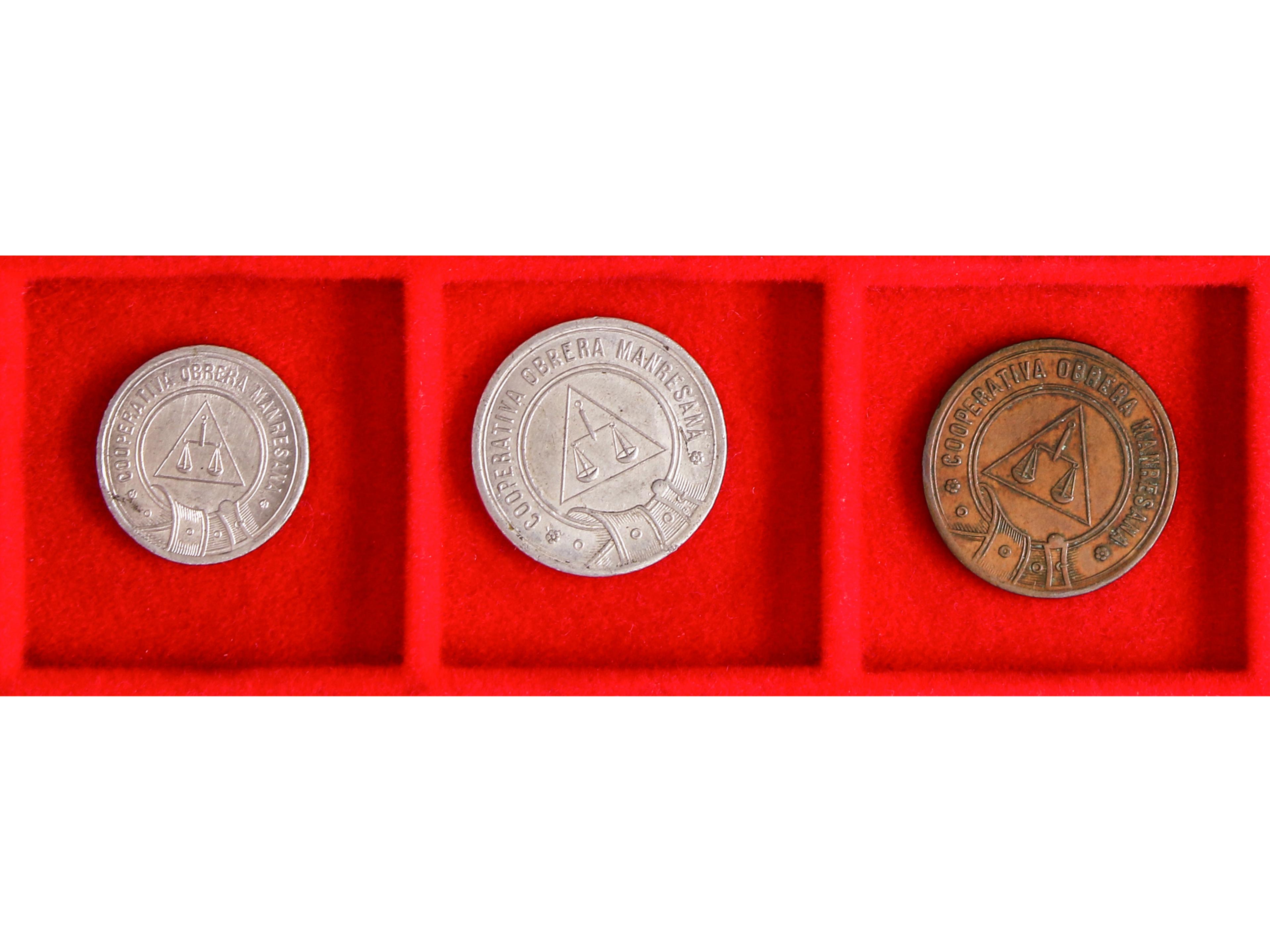 Lote 3 fichas 5 y 10 Cèntims y 1 Pesseta. COOPERATIVA OBRERA MANRESANA. MANRESA. Al,AE. L-3153, 3154, 3155. MBC+. (Image1) (Image2)