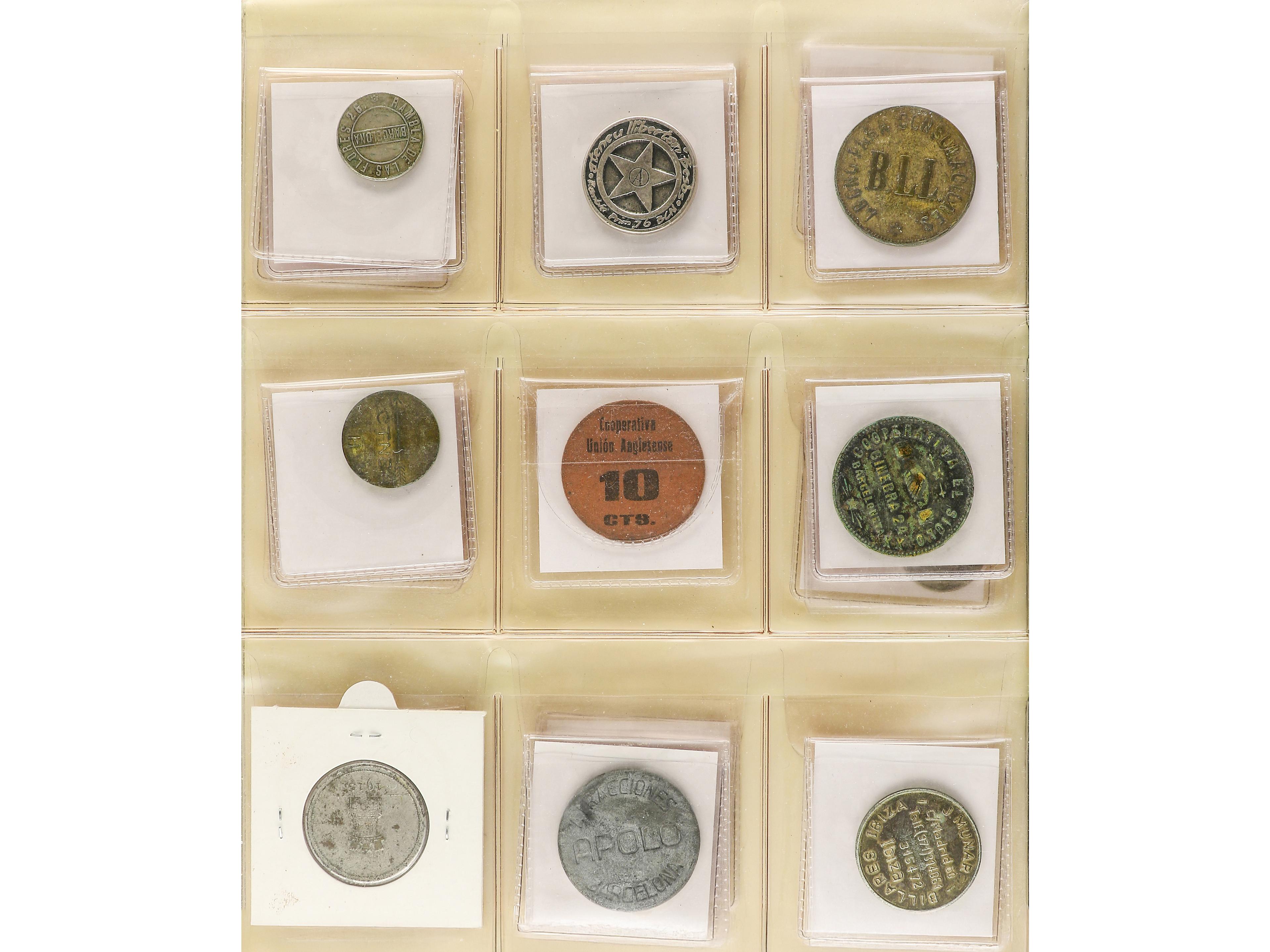 Lote 11 fichas 5, 10 Céntimos y 1 (6), 5 Pesetas (2) y Sin Valor. COOPERATIVA CASA DEL PUEBLO. TORELLÓ. Latón, Al y Ni. Incluye 4 fichas no catalogas: 3x con valor 1 Peseta y contramarcas y uma Sin Valor con contramarca 4.