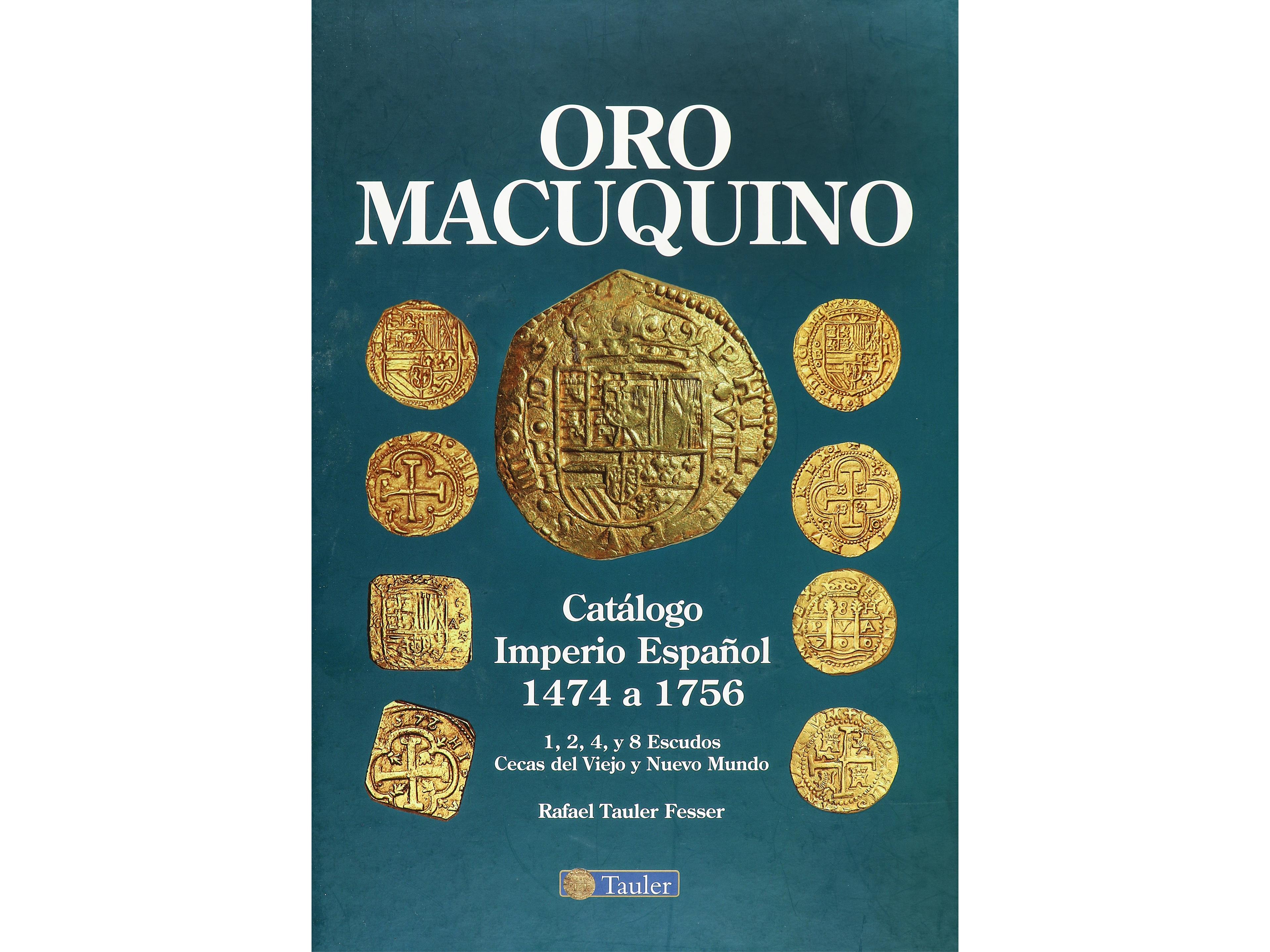 Tauler Fesser, Rafael. ORO MACUQUINO. CATÁLOGO IMPERIO ESPAÑOL 1474 A 1756. 1, 2, 4 y 8 ESCUDOS. CECAS DEL VIEJO Y NUEVO MUNDO. Madrid, 2011. 572 páginas con fotografías a color. Más de 2000 monedas resañadas y catalogadas.
