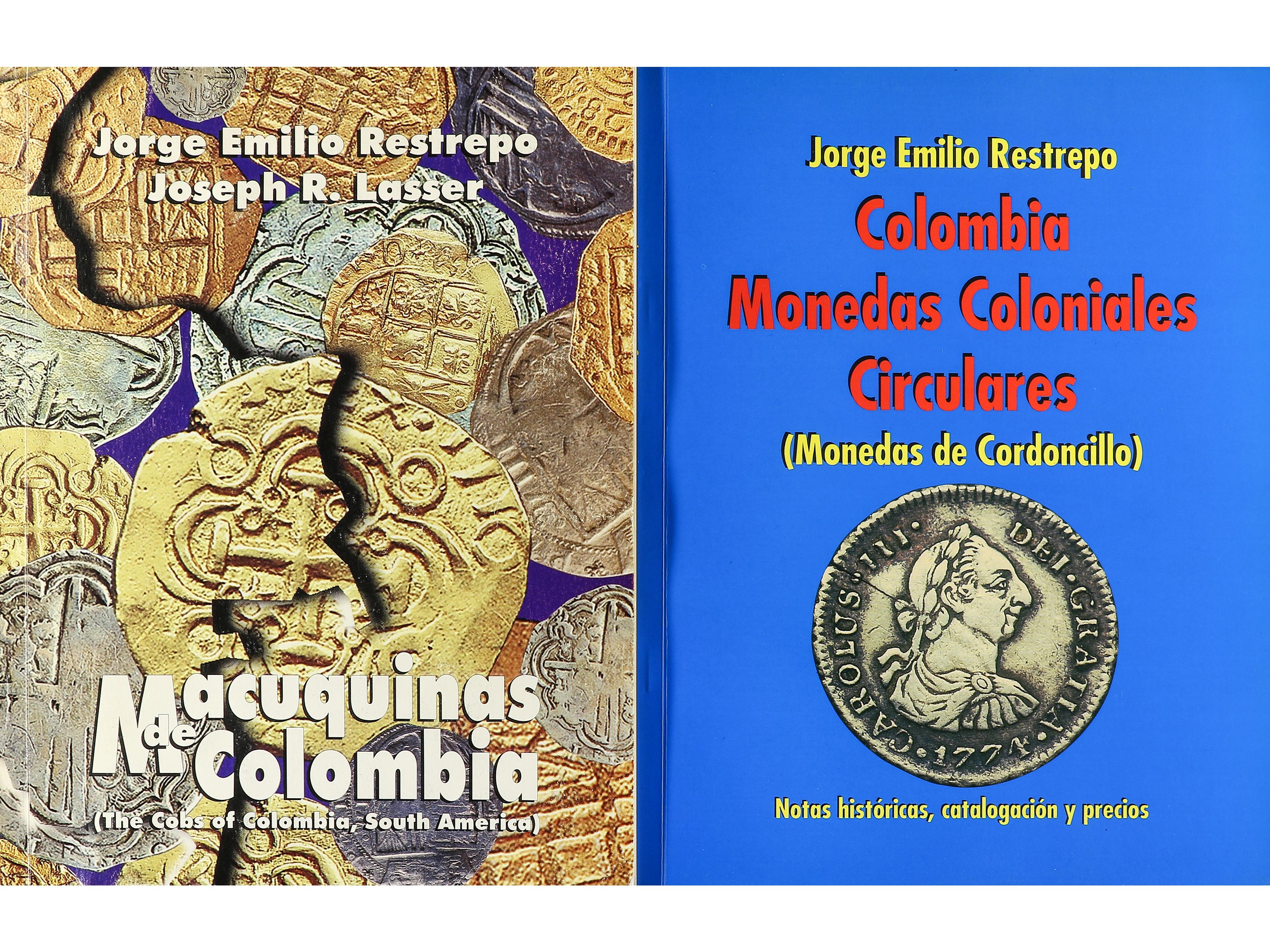Restrepo, Jorge Emilio. Lote 2 libros. COLOMBIA MONEDAS COLONIALES CIRCULARES (MONEDAS DE CORDONCILLO). MACUQUINAS DE COLOMBIA. Medellín, 1998 y 1999. 90 y 110 páginas cada uno con fotografías en blanco y negro.