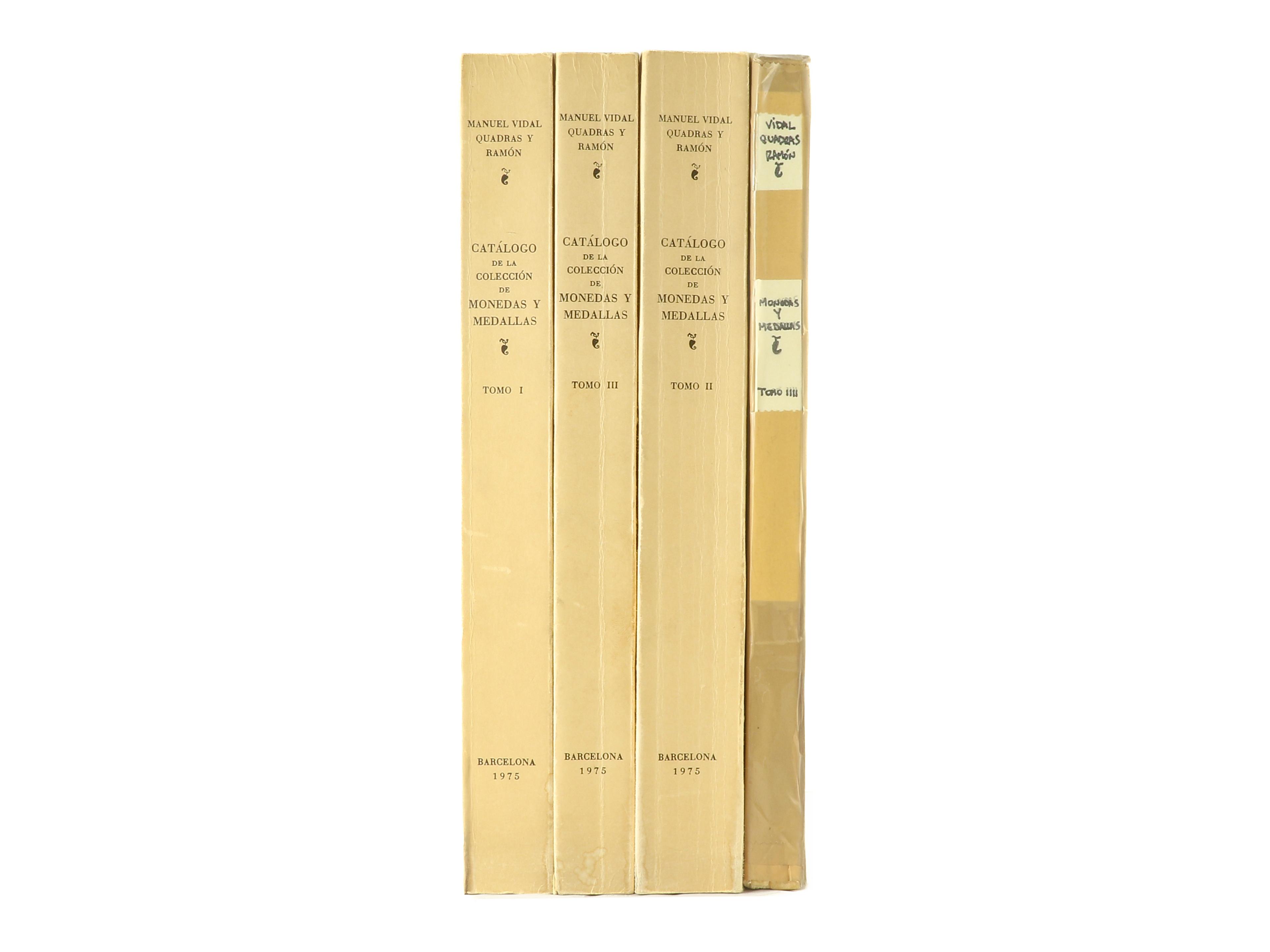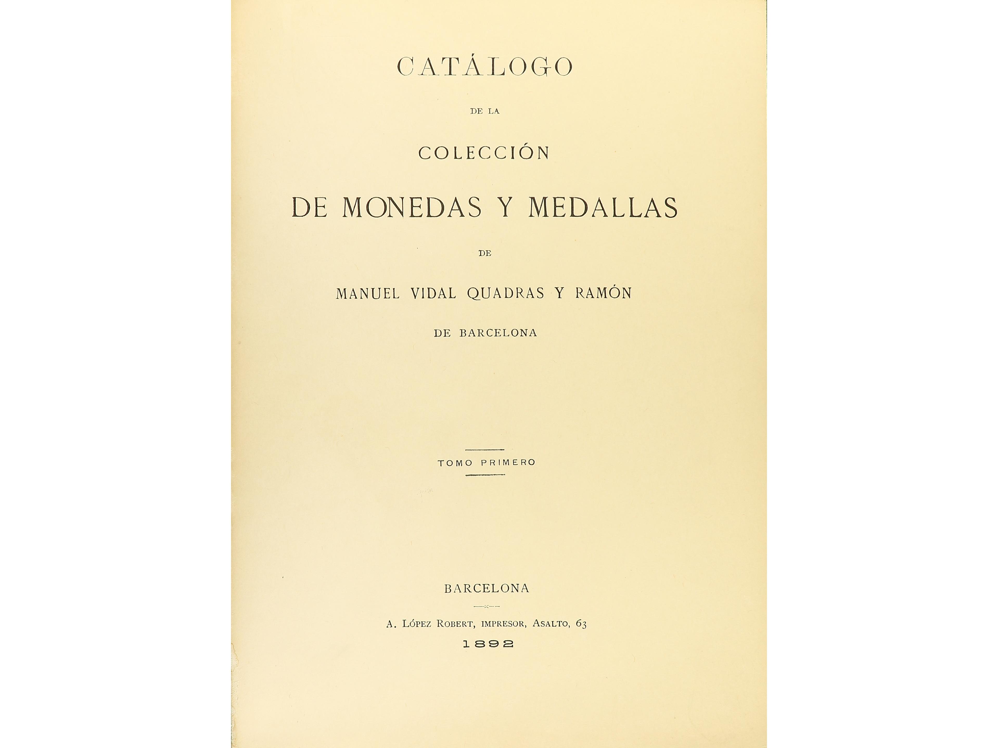 Vidal Quadras, M. CATALOGO DE LA COLECCIÓN DE MONEDAS Y MEDALLAS DE MANUEL VIDAL QUADRAS Y RAMON. Barcelona, 1892. 4 volúmenes en folio, con 1450 páginas y 87 láminas. Este catálogo describe, clasifica e ilustra miles de