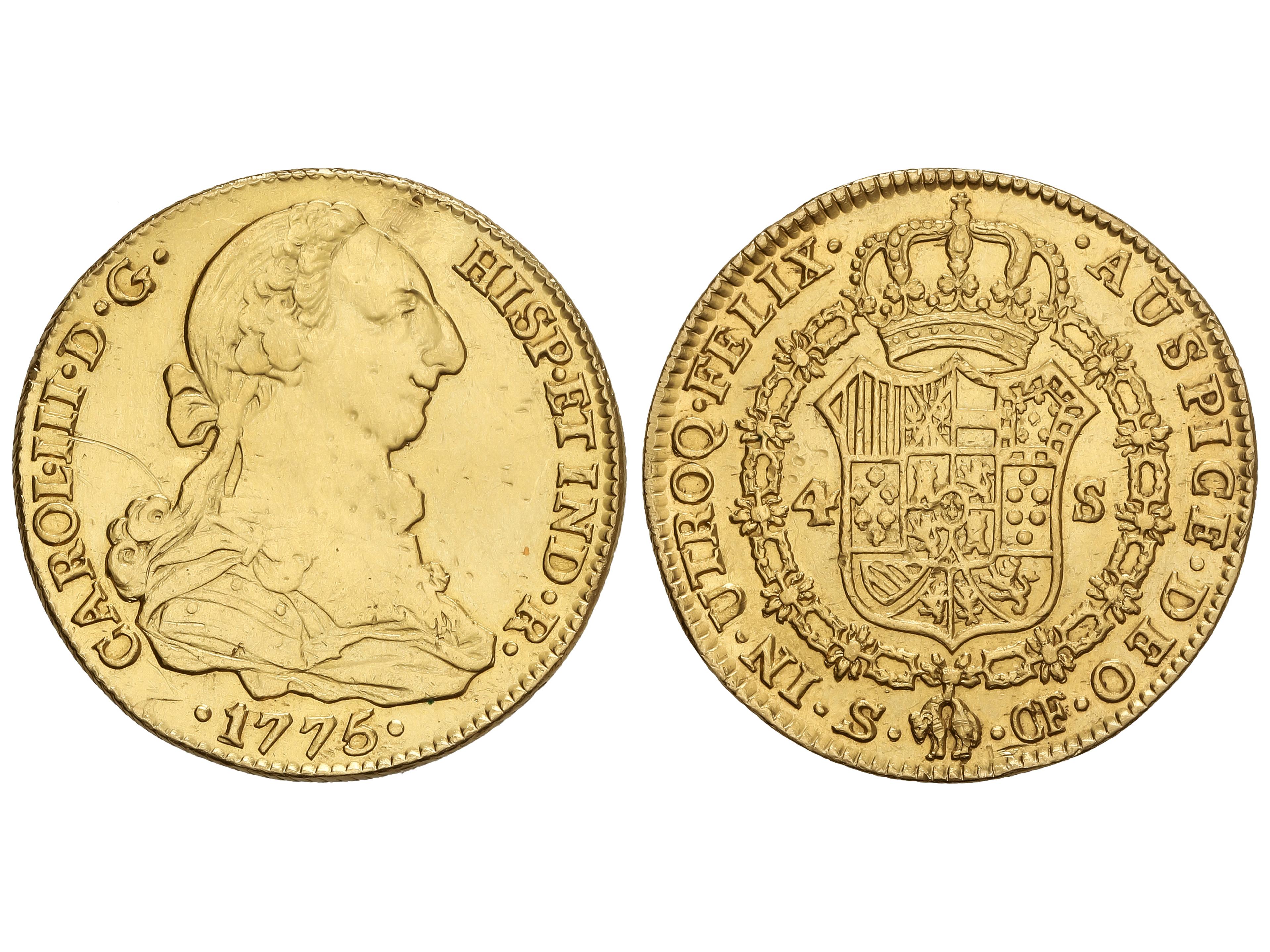 Escudos. 1775. SEVILLA. C.F. 13,40 grs. (Cospel algo doblado, golpecitos de punzón en anverso, limpiada). AC-1887. MBC +.