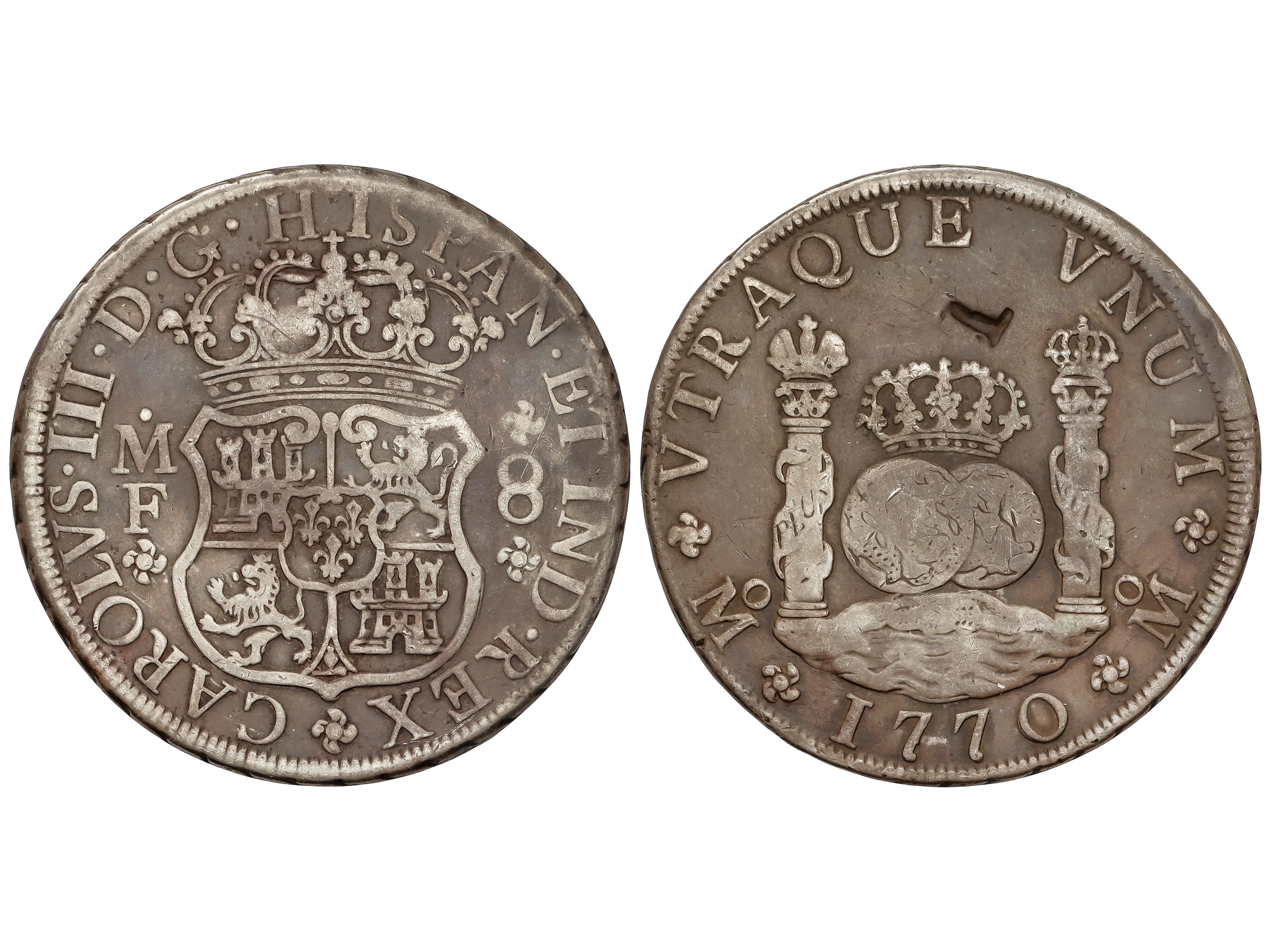 Reales. 1770. MÉXICO. M.F. 26,16 grs. Columnario. (Resello en forma de L en reverso). Pátina oscura. AC-1099. MBC. (Image1)