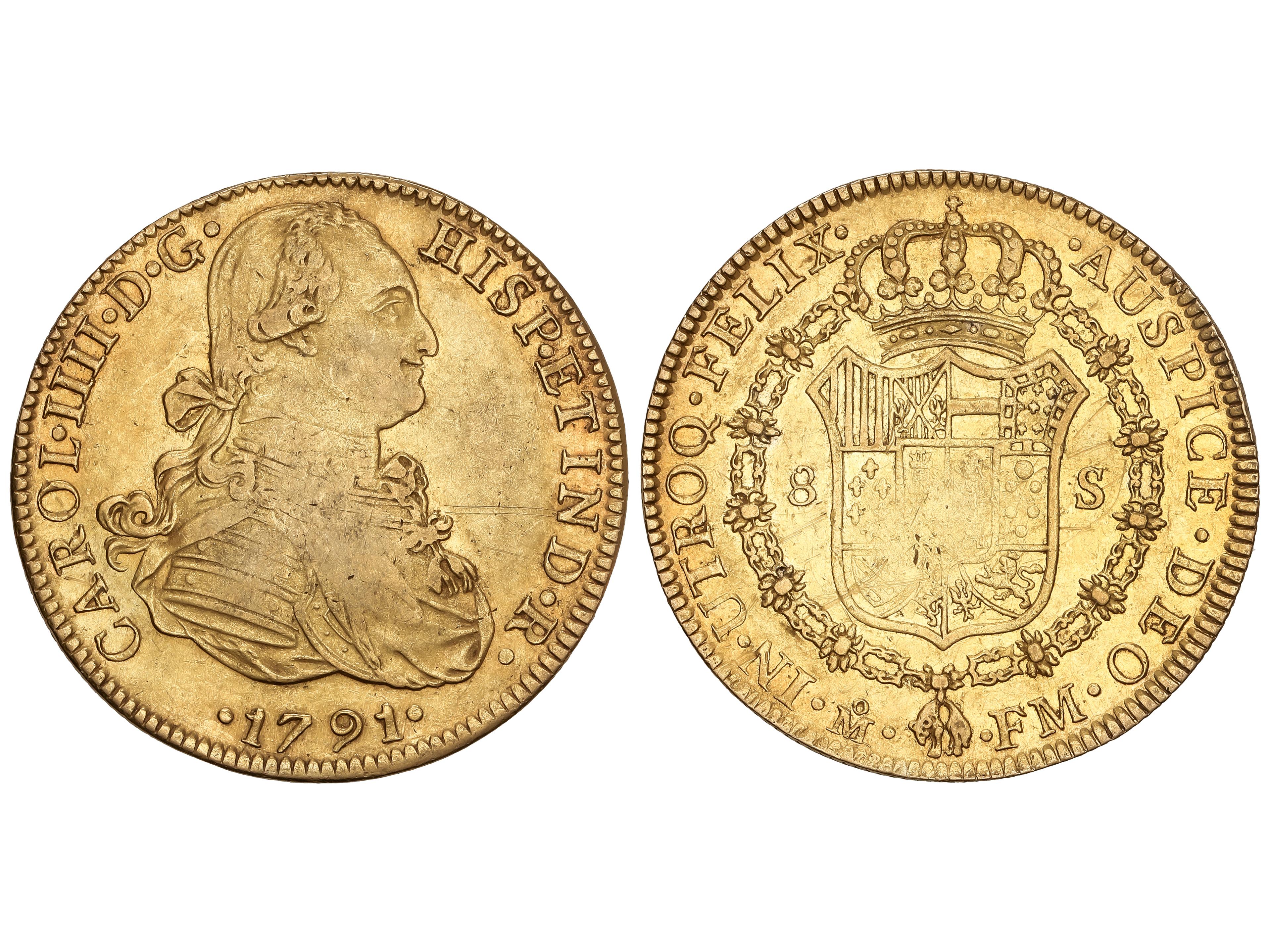 Escudos. 1791. MÉXICO. F.M. 26,97 grs. Primer año de busto propio. Acuñación algo floja, habitual en esta ceca. (Pequeñas rayitas). AC-1630; XC-1018. MBC+. (Image1)
