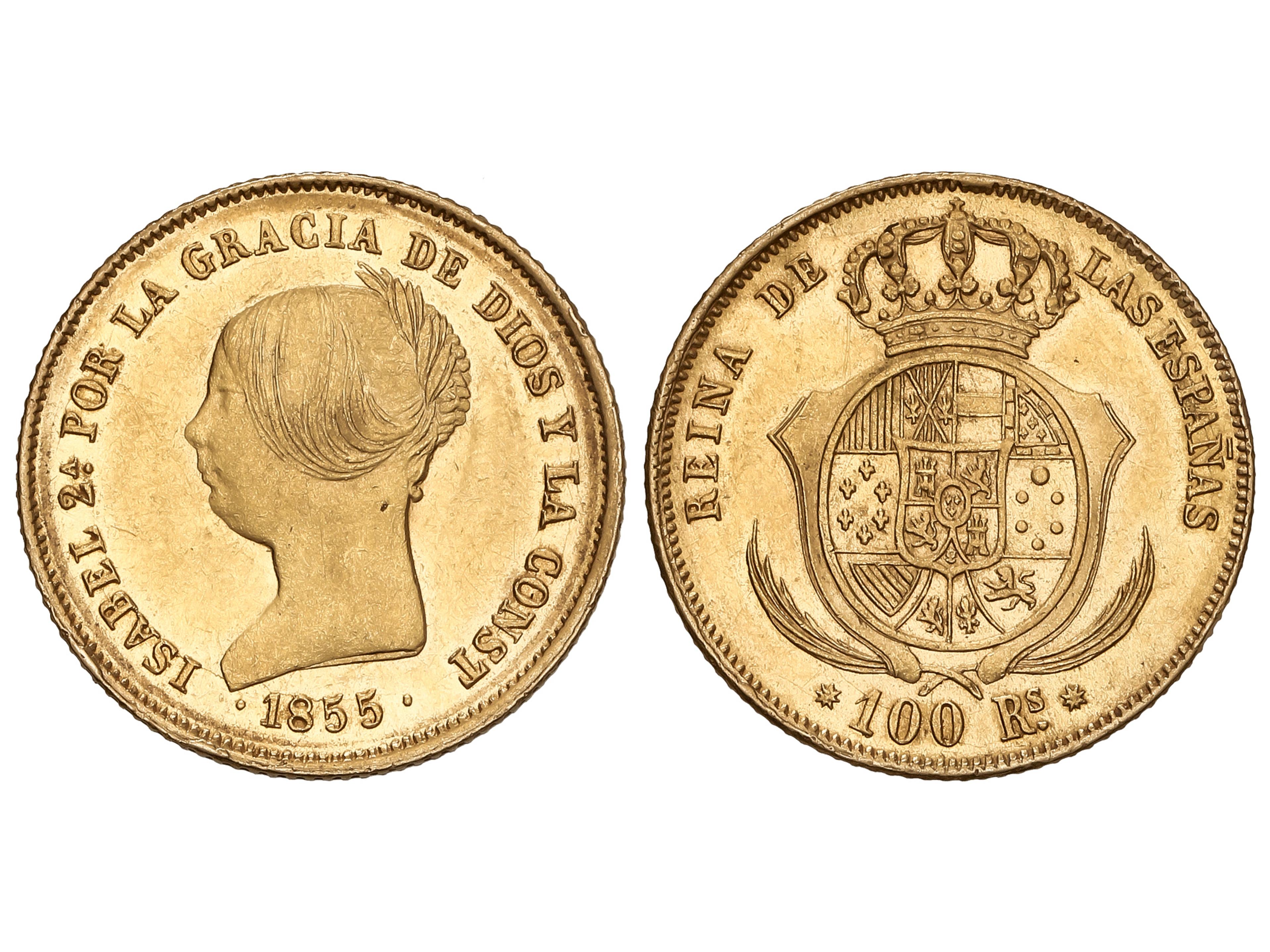 100 Reales. 1855. BARCELONA. 8,38 grs. Restos de brillo original. AC-763. EBC-. (Image1)