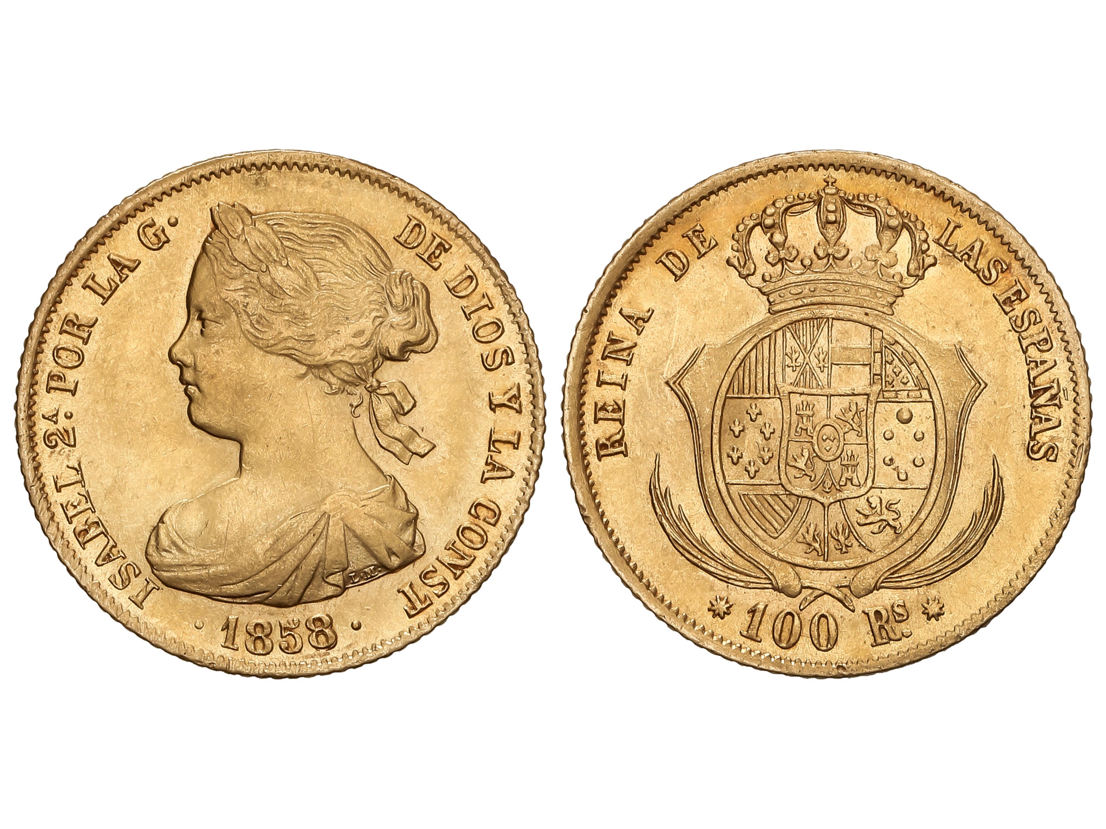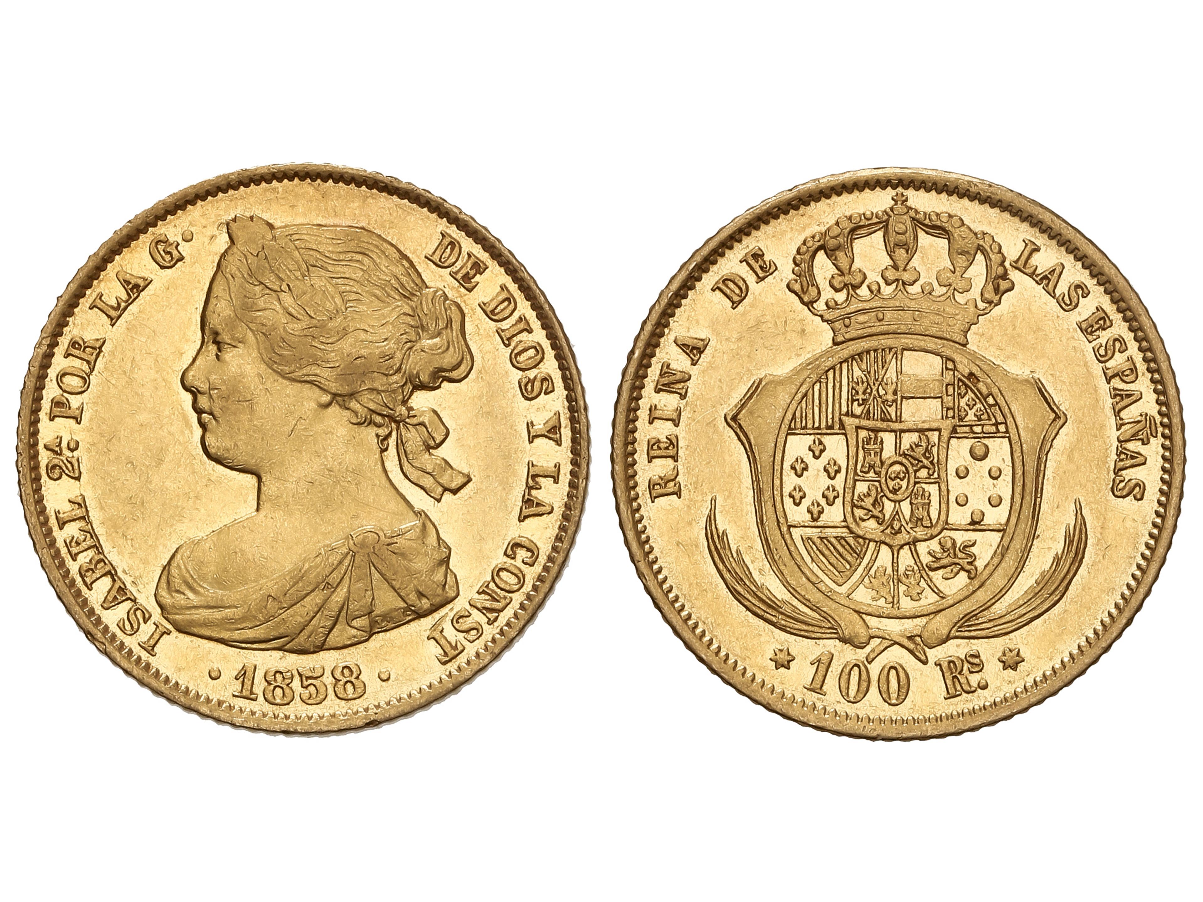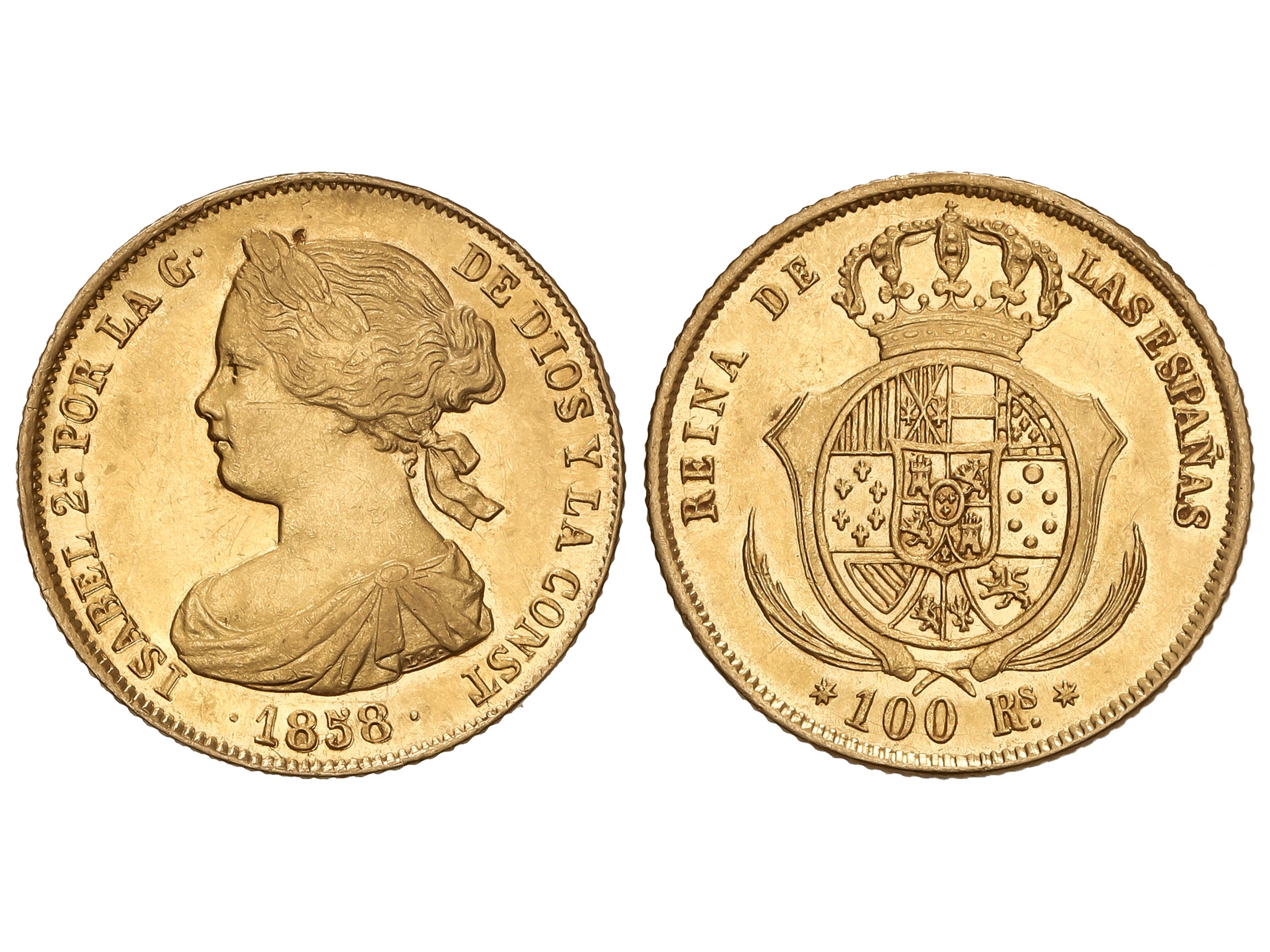 100 Reales. 1858. BARCELONA. 8,25 grs. Restos de brillo. AC-769. EBC-/EBC. (Image1)