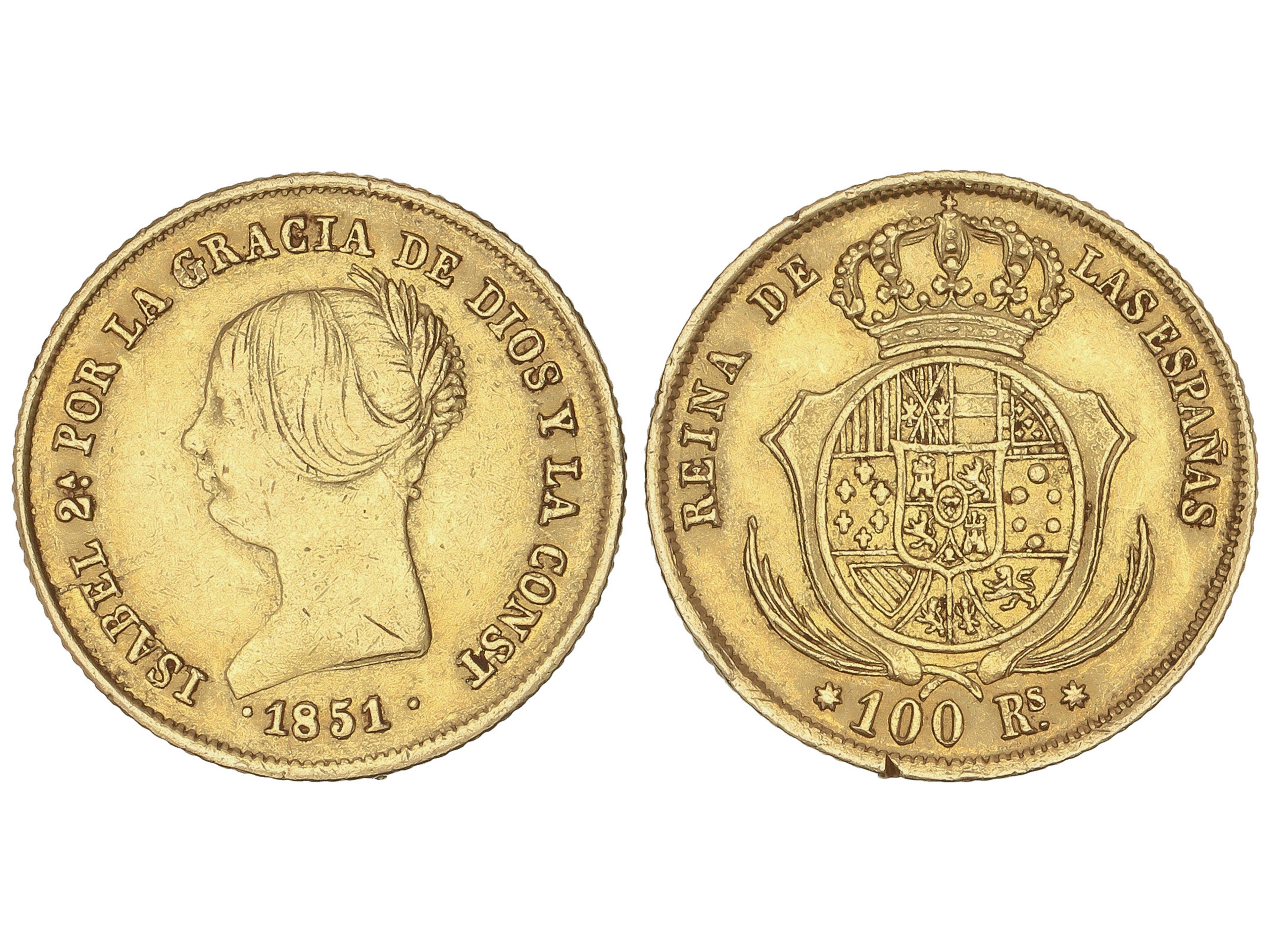 100 Reales. 1851/0. SEVILLA. 8,14 grs. Rarísima moneda de Isabel II, la más rara acuñada en Sevilla durante su reinado. Muy pocas piezas conocidas. Se advierte la rectificación de fecha 1851 sobre 1850. Calicó en su