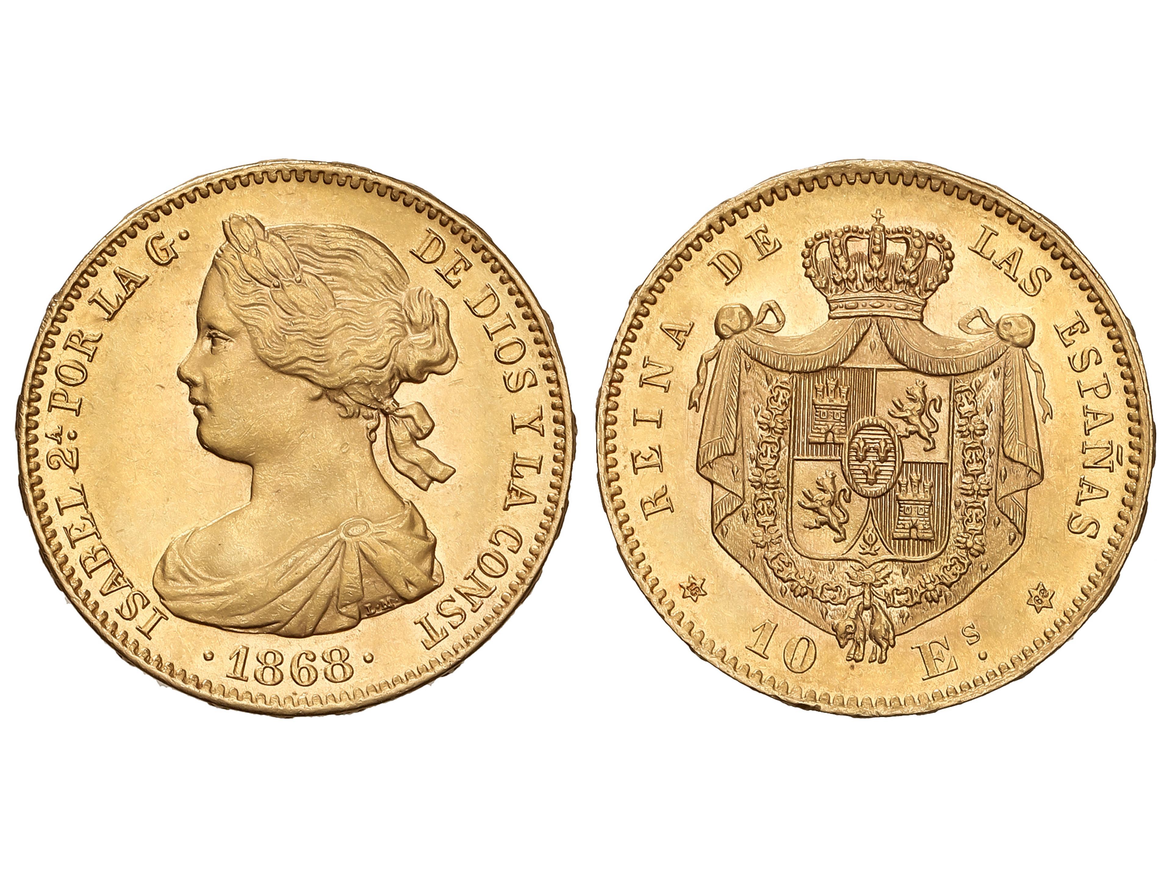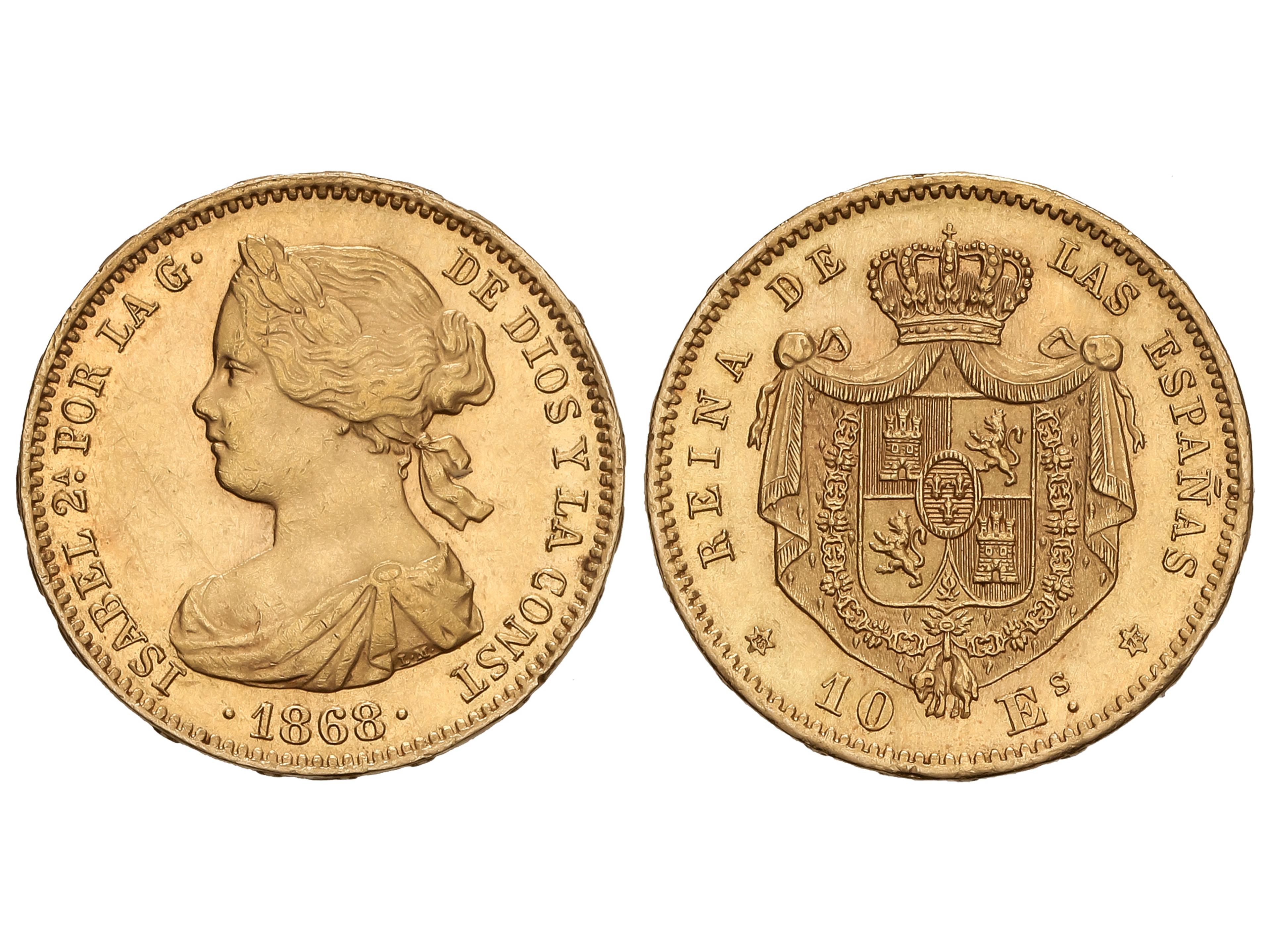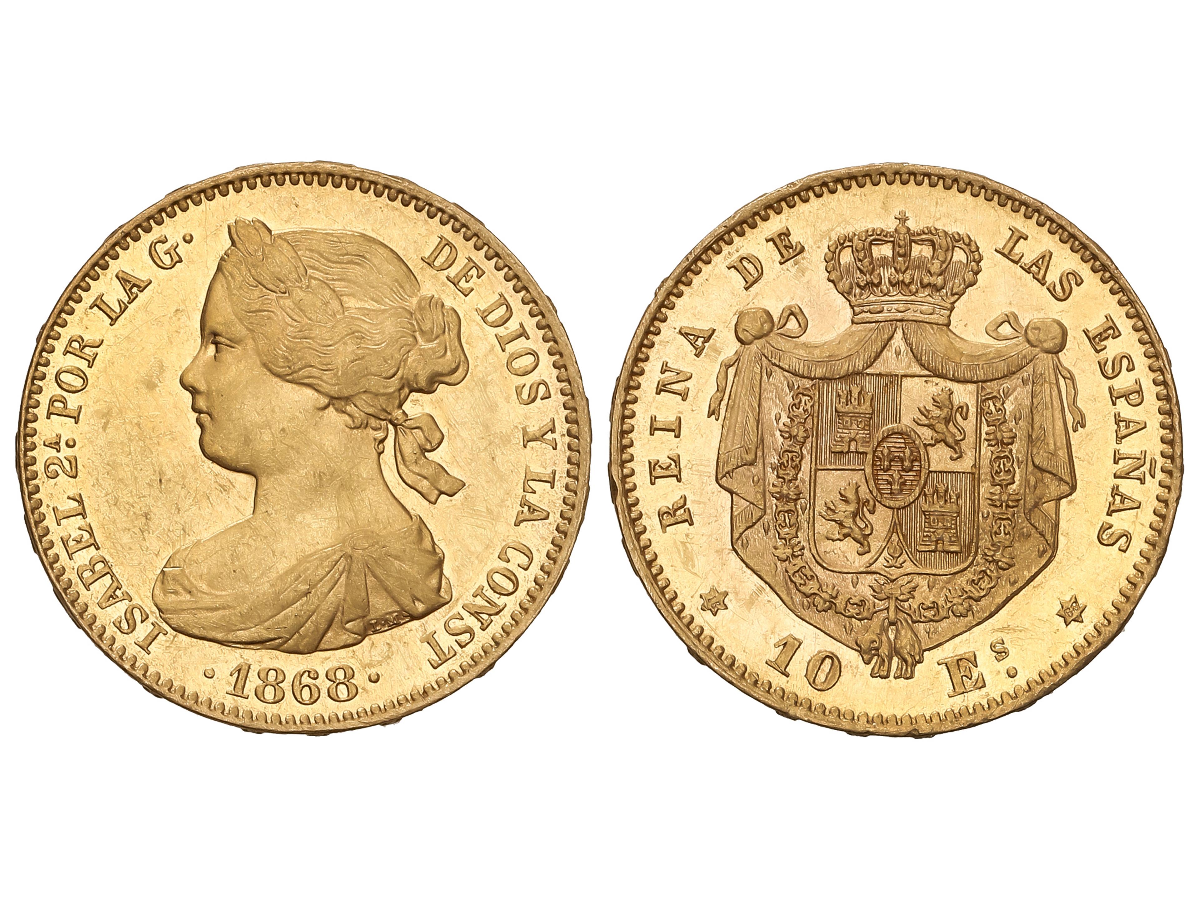 384 image10 Escudos. 1868 (*18-68). MADRID. 8,34 grs. AU (900). (Ínfimas marquitas). Brillo original. AC-815. EBC/EBC+. (Image1)