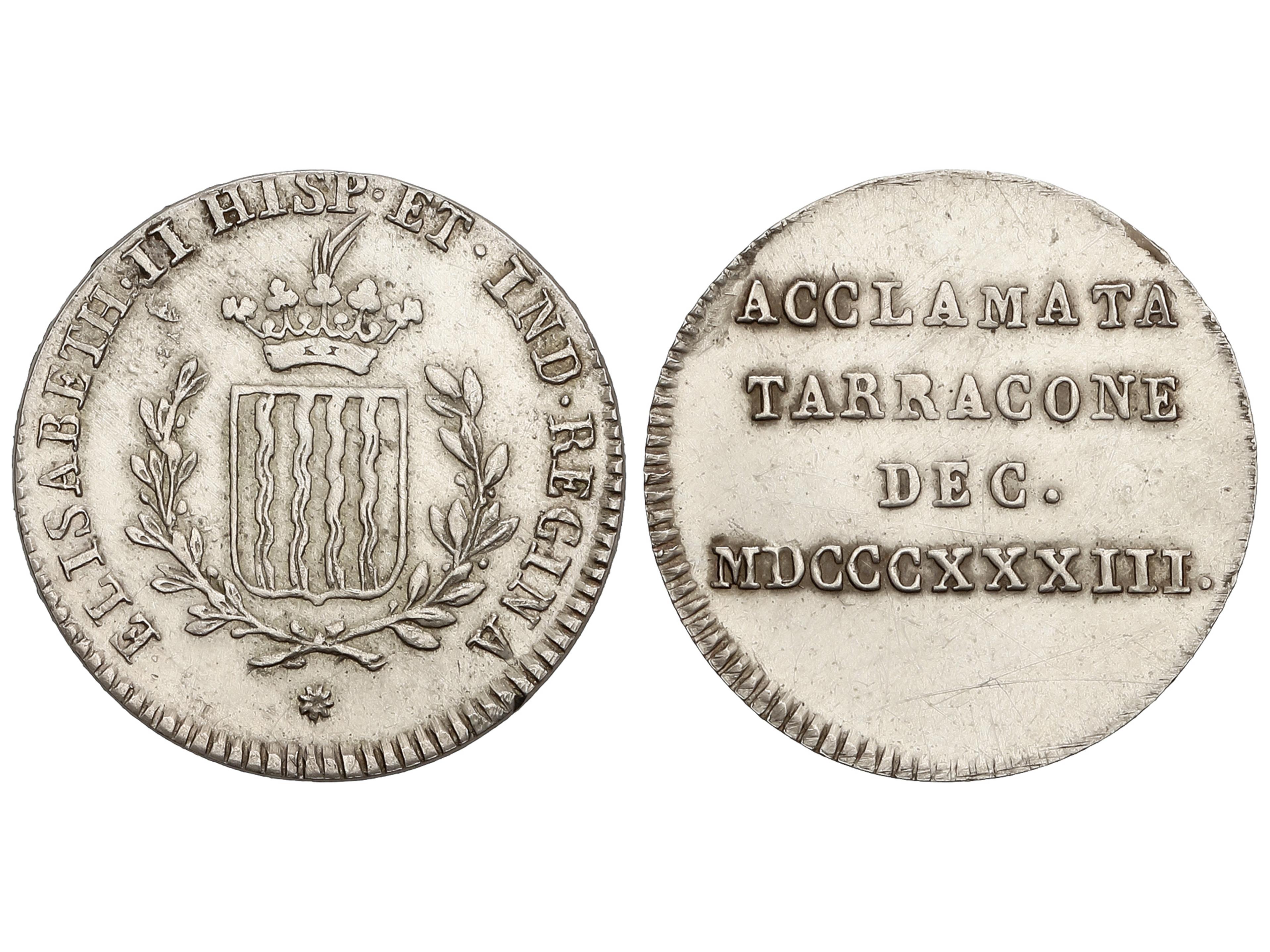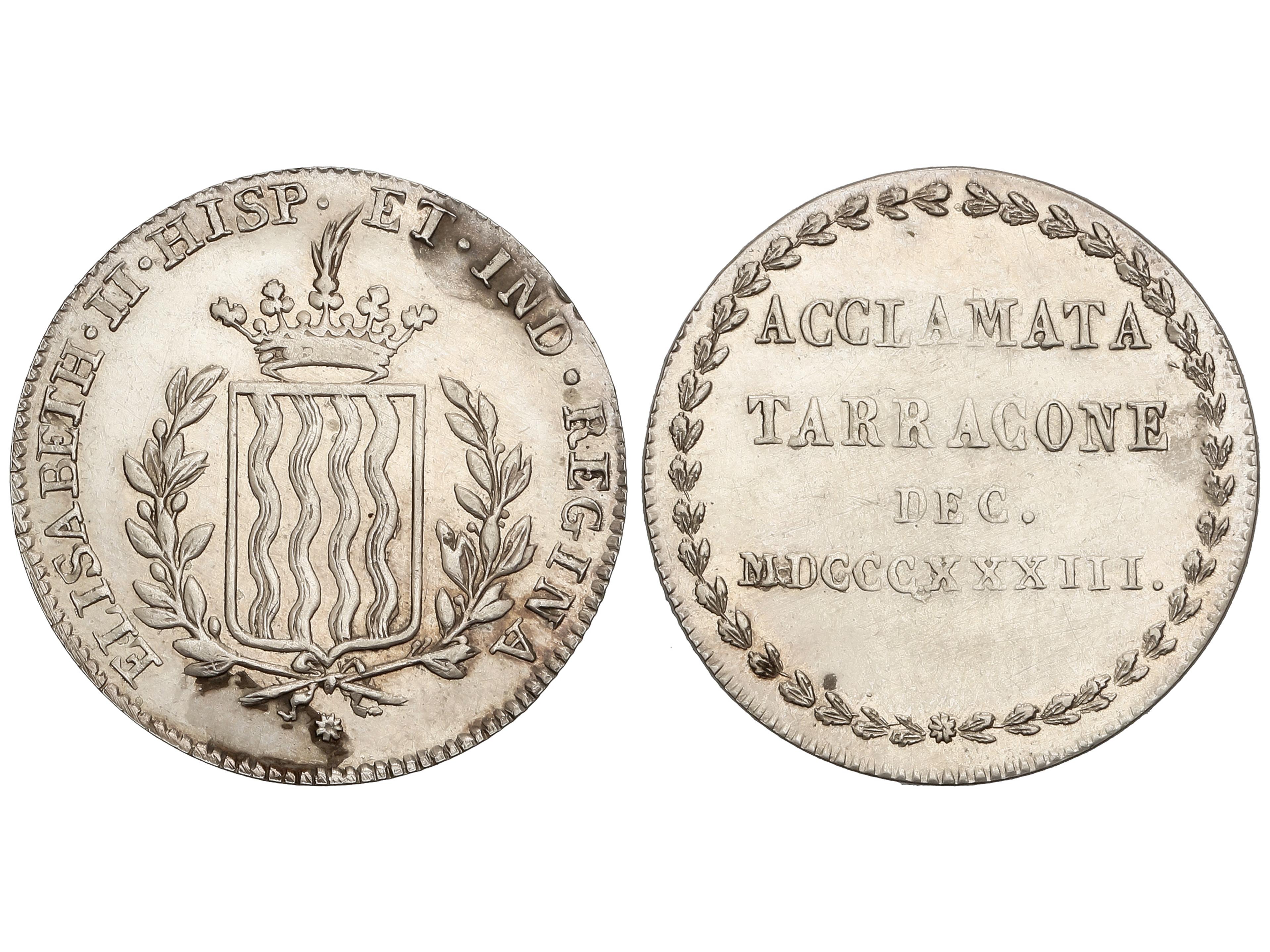 387 imageMedalla Proclamación. 1833. TARRAGONA. 2,52 grs. AR. Ø 22 mm. (Rayitas). He-33. EBC. Ex Áureo 98 - 22 octubre 1998, n. 614. (Image1)