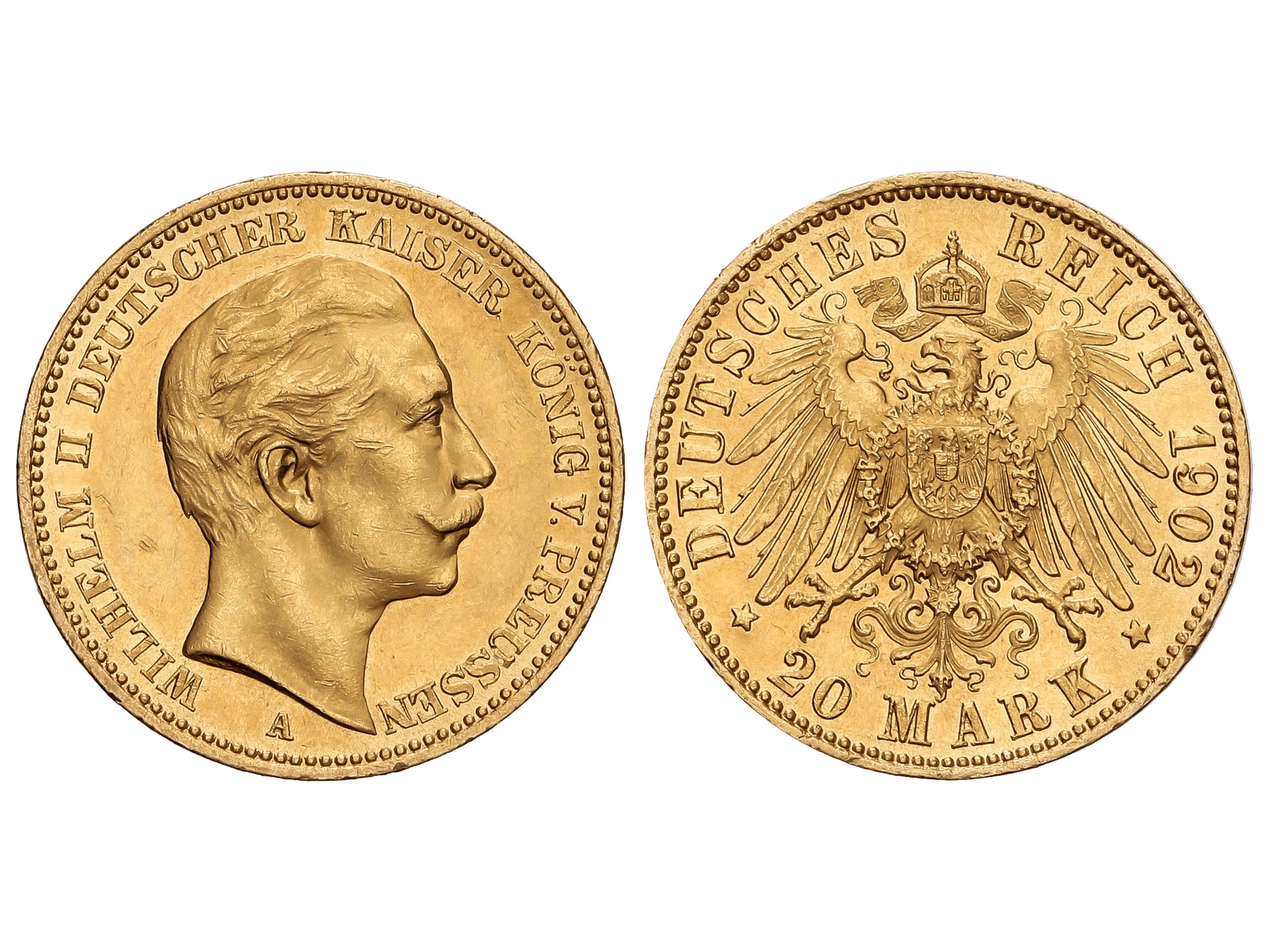 20 Mark. 1902-A. WILHELM II. PRUSSIA (Berlin). 7,93 grs. AU (900). (Leves golpecitos en anverso). Fr-3831; KM-521. MBC+/EBC-.
