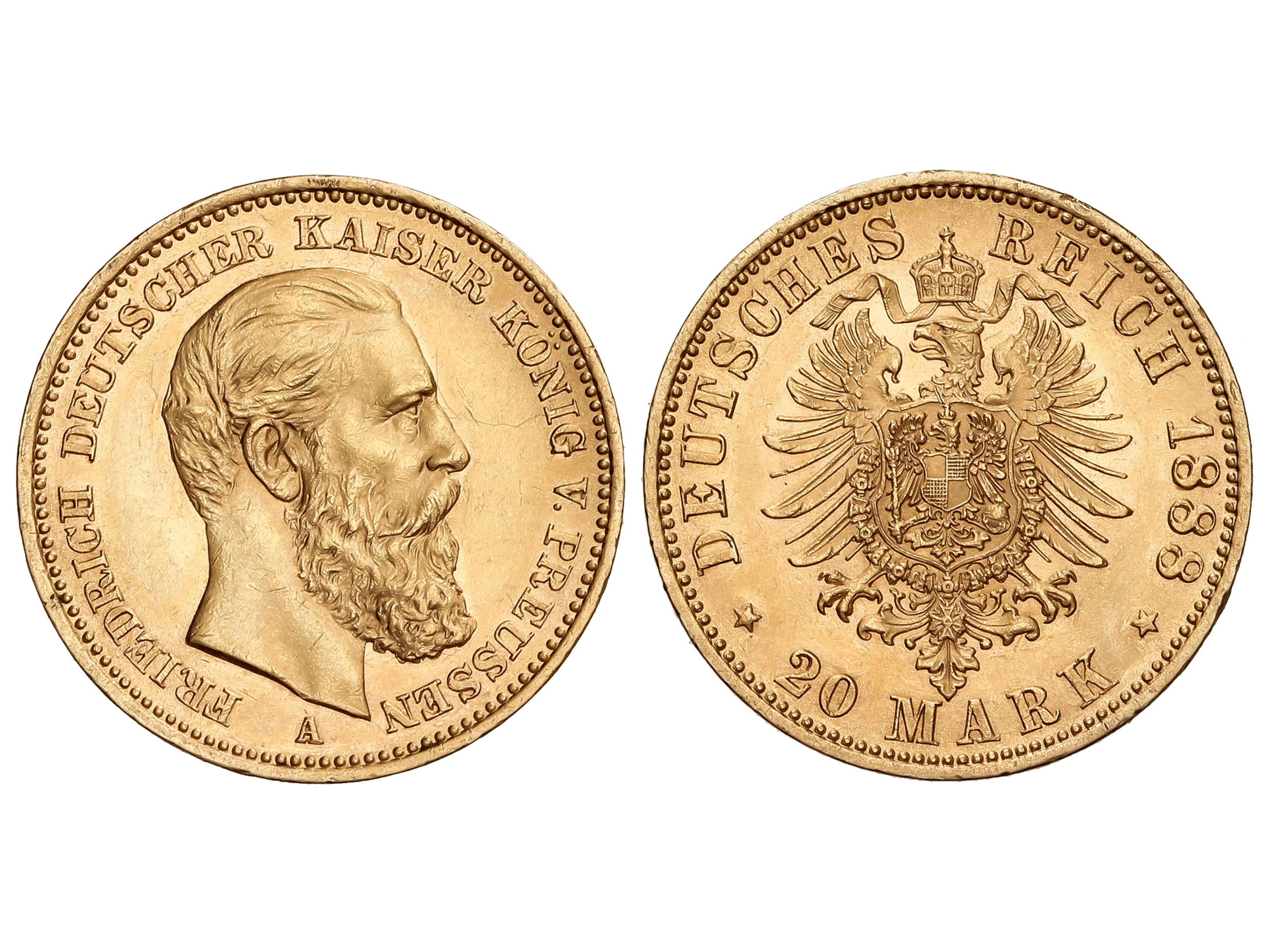 20 Mark. 1888-A. FRIEDRICH III. PRUSSIA. 7,95 grs. AU (900). Pieza Tipo. (Leves golpecitos). Fr-3828; KM-515. EBC-.